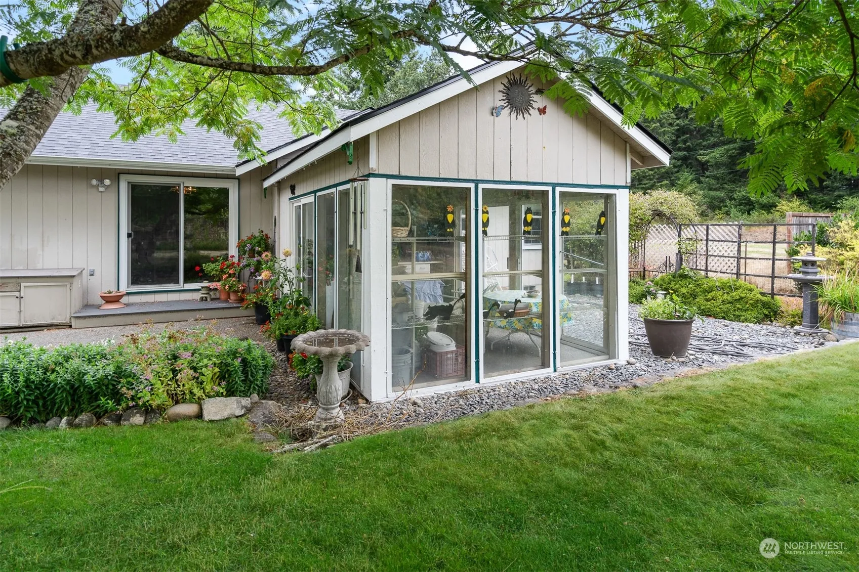 Discover your perfect retreat in this charming, single-level home, nestled on a shy acre of beautifully landscaped grounds. Lovingly maintained & like new (new roof), this gardener’s abode is a haven for nature enthusiasts. The open floor plan /vaulted ceilings welcomes you to a spacious living area, seamlessly connecting to a bright & airy kitchen. With 3Bd/2Ba & extra lg garage w/shop space, this home is perfect for your hobbies & projects, first time home buyers or people wanting to down size. Fenced backyard w/fruit trees, raised beds, root cellar/safe room & attached garden room/greenhouse is ideal for cultivating your green thumb year-round – a rare gem, offering tranquility & space, while close to all essentials, Olympia and JBLM.