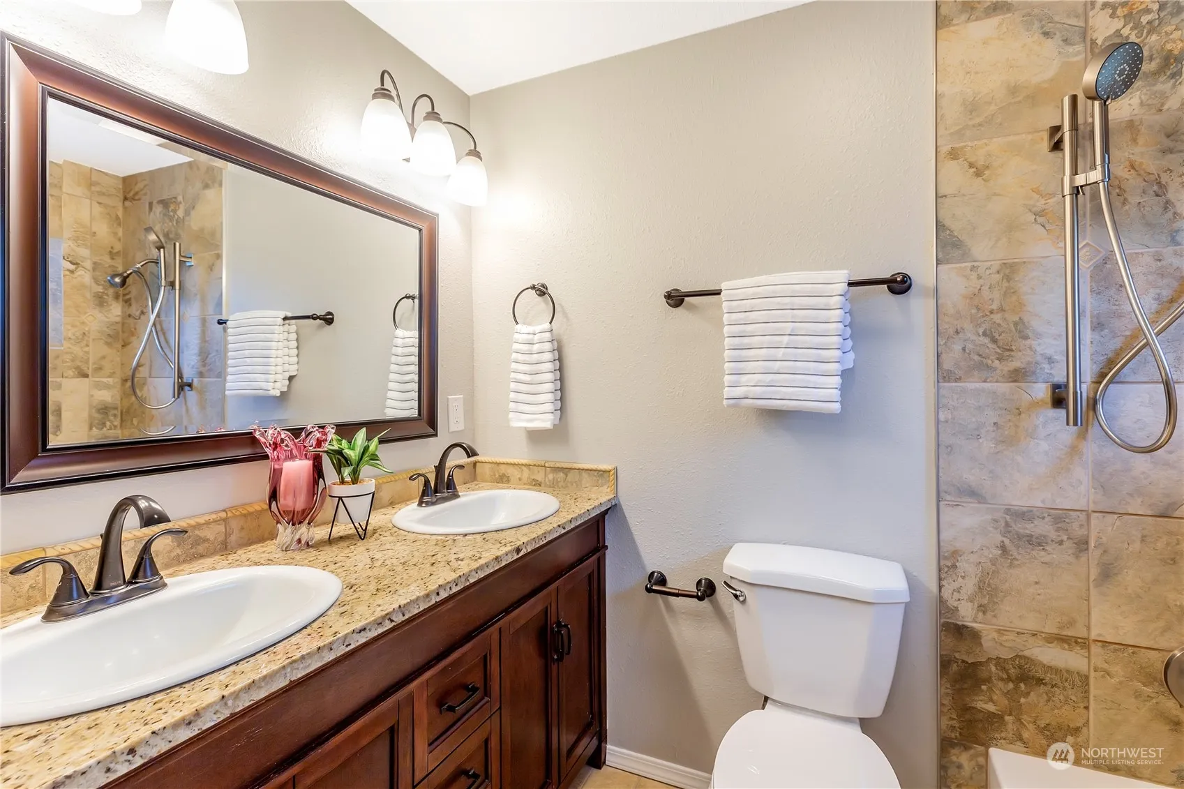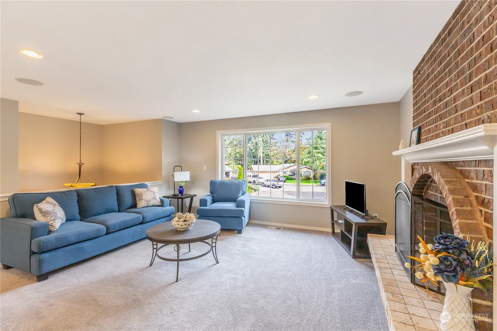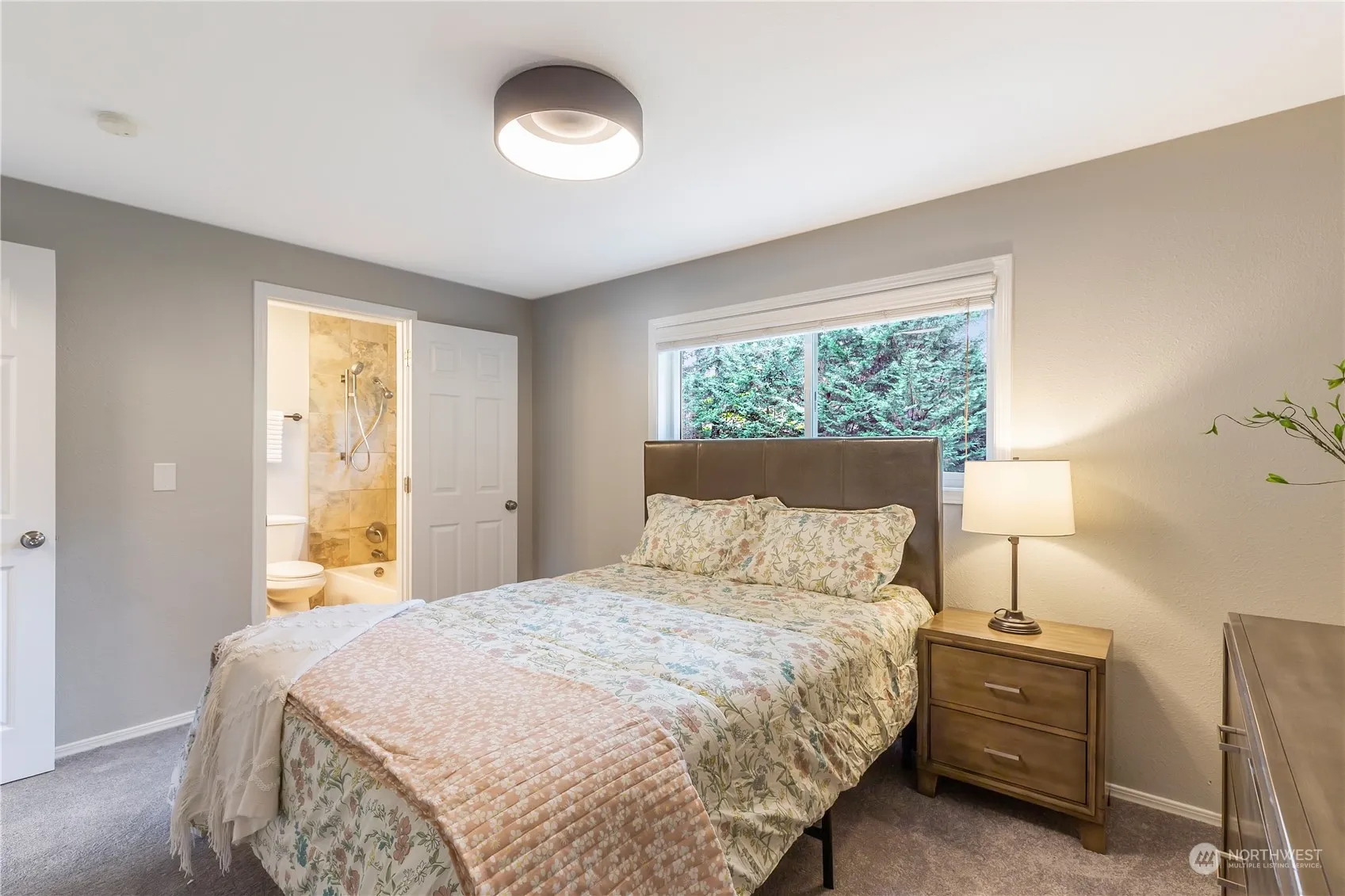 This home has 3 bedrooms and 2 1/2 baths, living & dining, bonus room w/office space. New carpet and paint in 2024. Complete remodel in 2013. It boasts an open layout that combines the living, dining, and kitchen areas, creating a bright space. The living room includes a brick fireplace and surround sound, while the kitchen is equipped with tile floors, granite countertops, an island, and a skylight. Main level bedroom with an en-suite full bath. Main level guest 1/2 bath. Downstairs, a bonus room with a 2nd fireplace, built-in bookcases, surround sound, and another full bath. Outside, a deck leads down to a spacious patio, a large, level, fully fenced backyard with a sizable garden shed. This property is situated on a friendly cul-de-sac.