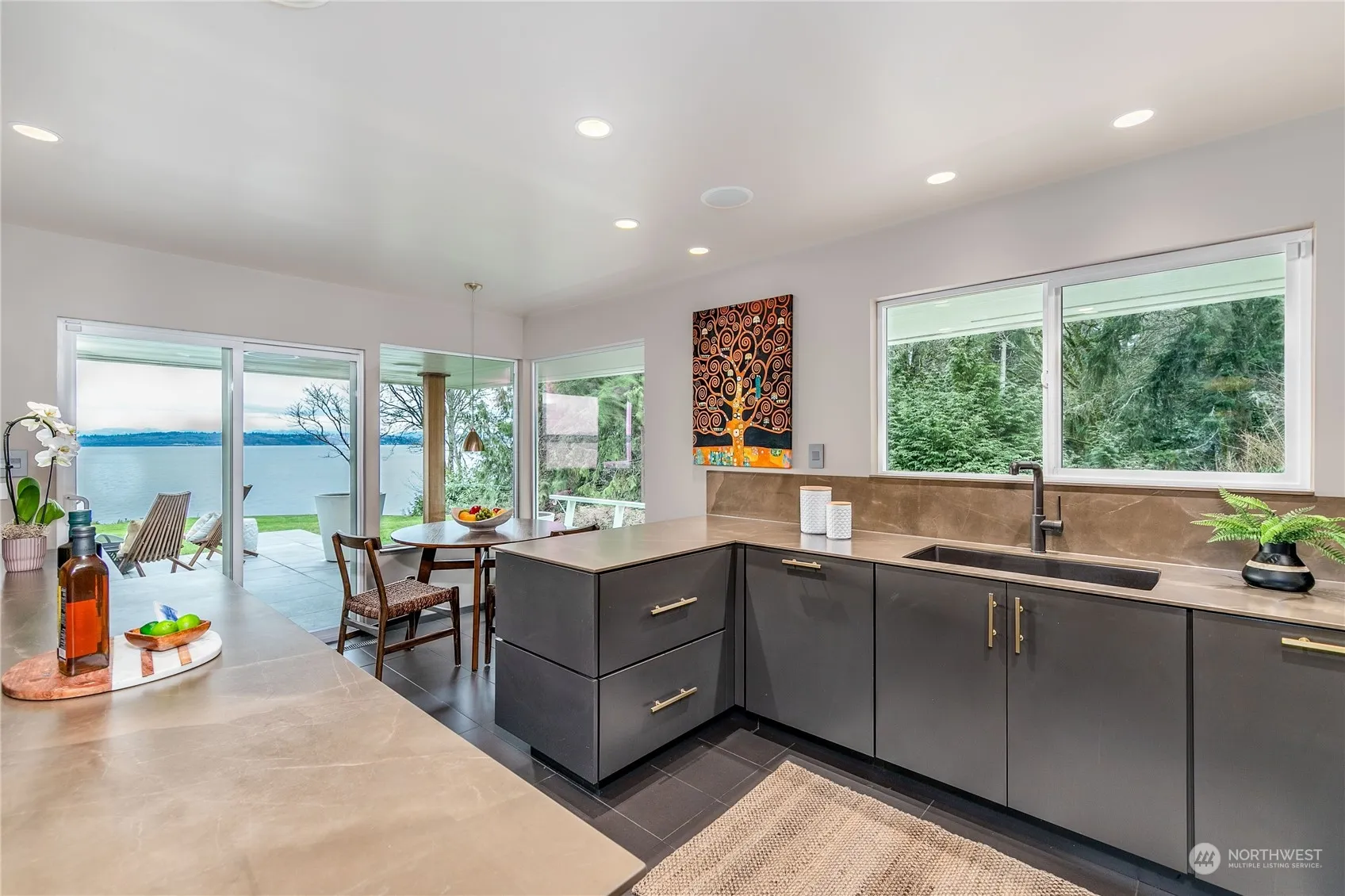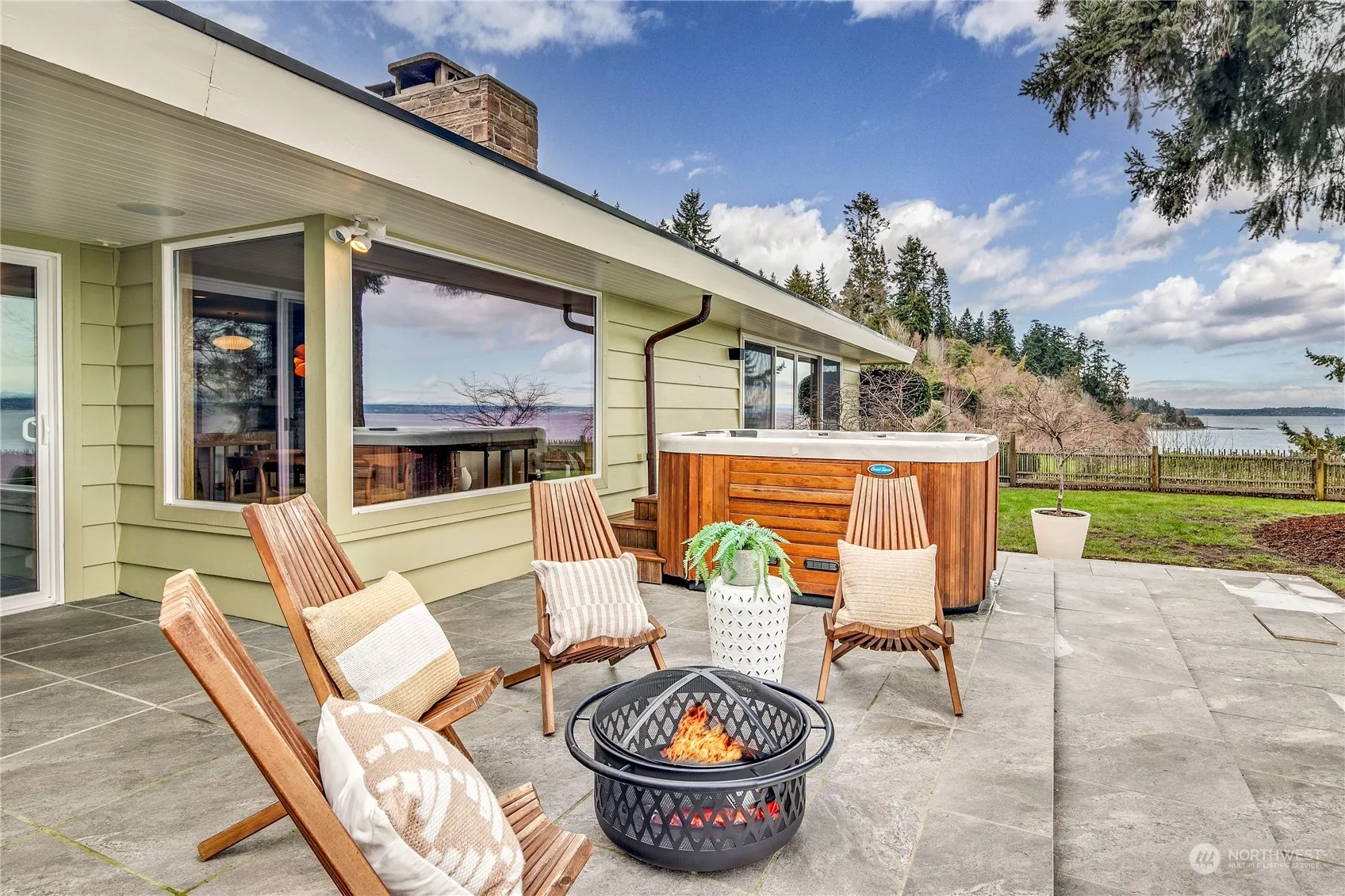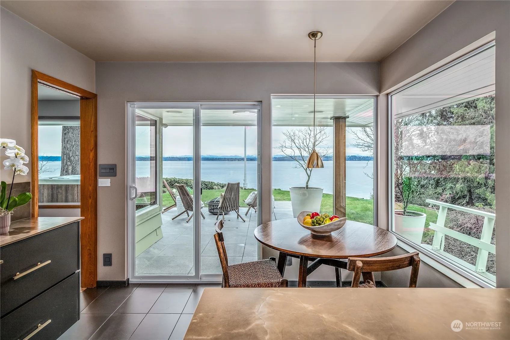 Mid-century gem has 2 bedrooms and elegant primary bath on main level plus spacious finished lower-level guest suite/den/office with bath & separate entrance. High-bank waterfront with potential beach access. 180 degree views of Puget Sound, Seattle and the Cascades; flowing floor plan, solid oak floors, sunken living room, 3-sided fireplace; 760sf patio w/ hot tub, extra-deep 2-car garage plus 4 add’l parking spaces. Refined, curated updates & modern amenities including chef’s kitchen with breakfast nook, butler’s pantry, full suite of Wolf/Sub-Zero appliances; 20kw backup generator served by 250-gal propane tank. Lush landscaping. Secluded & private, yet a mere stone’s throw from Rolling Bay Center and 2.5 miles from Fay Bainbridge Park.
