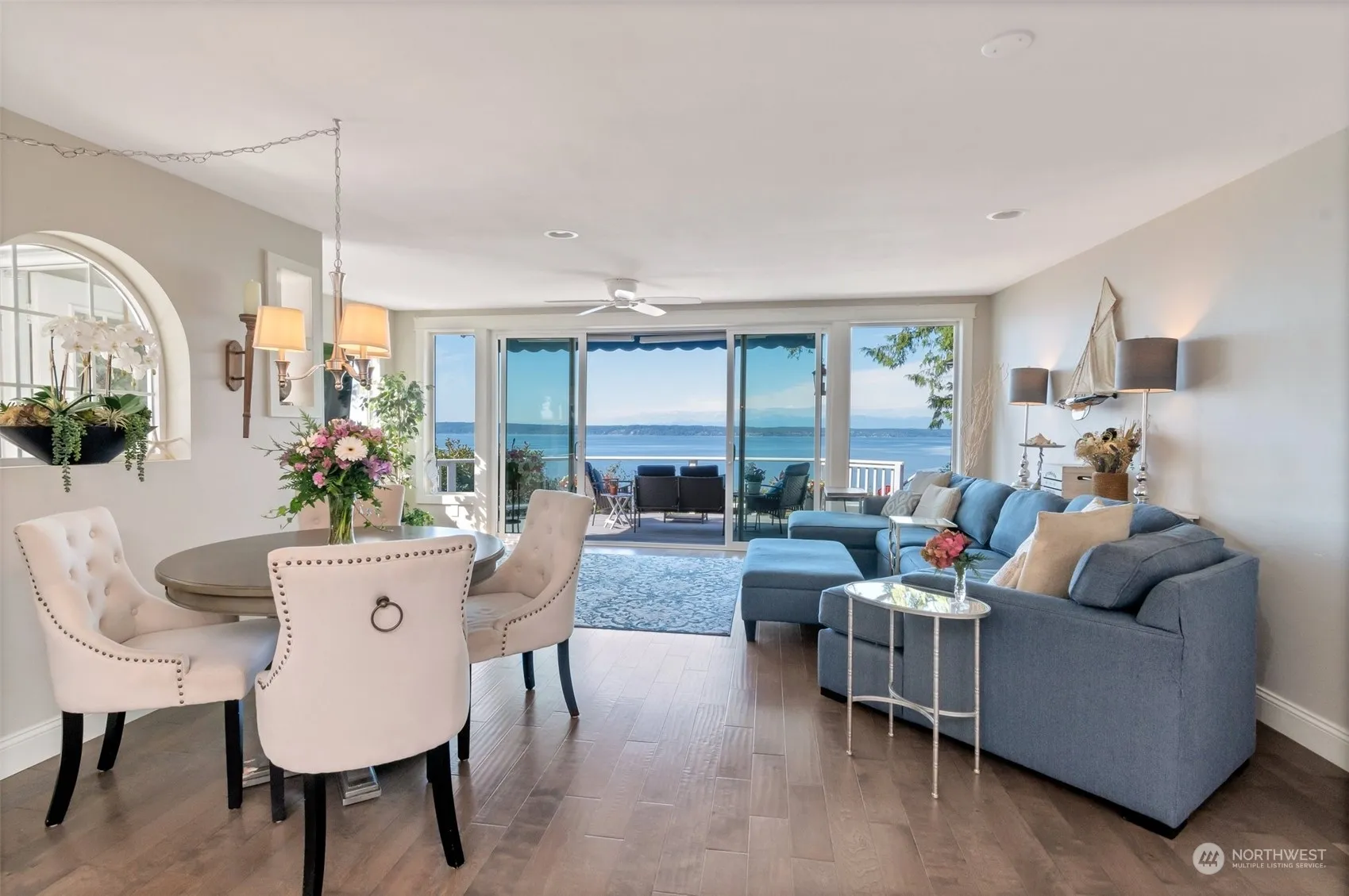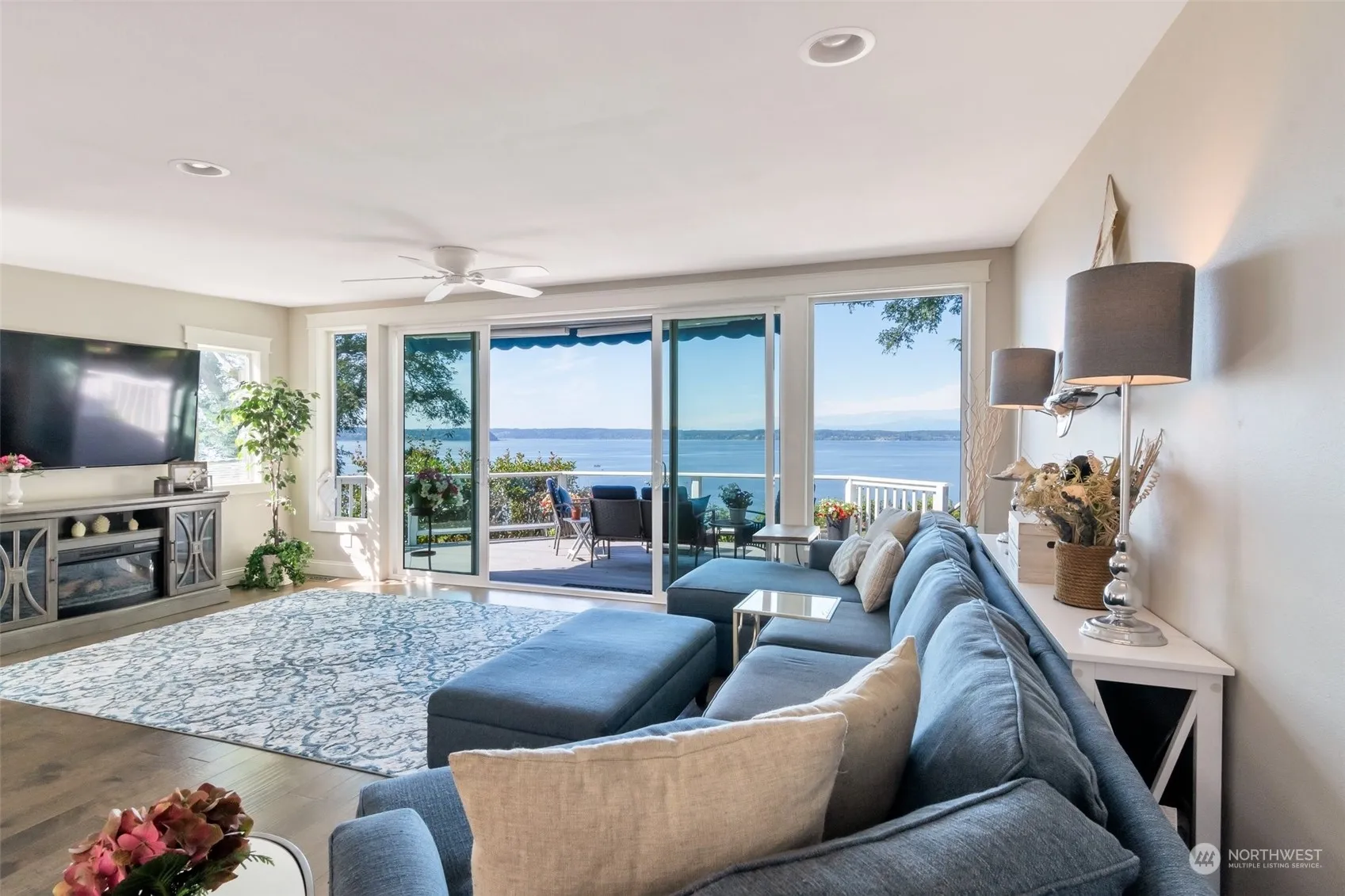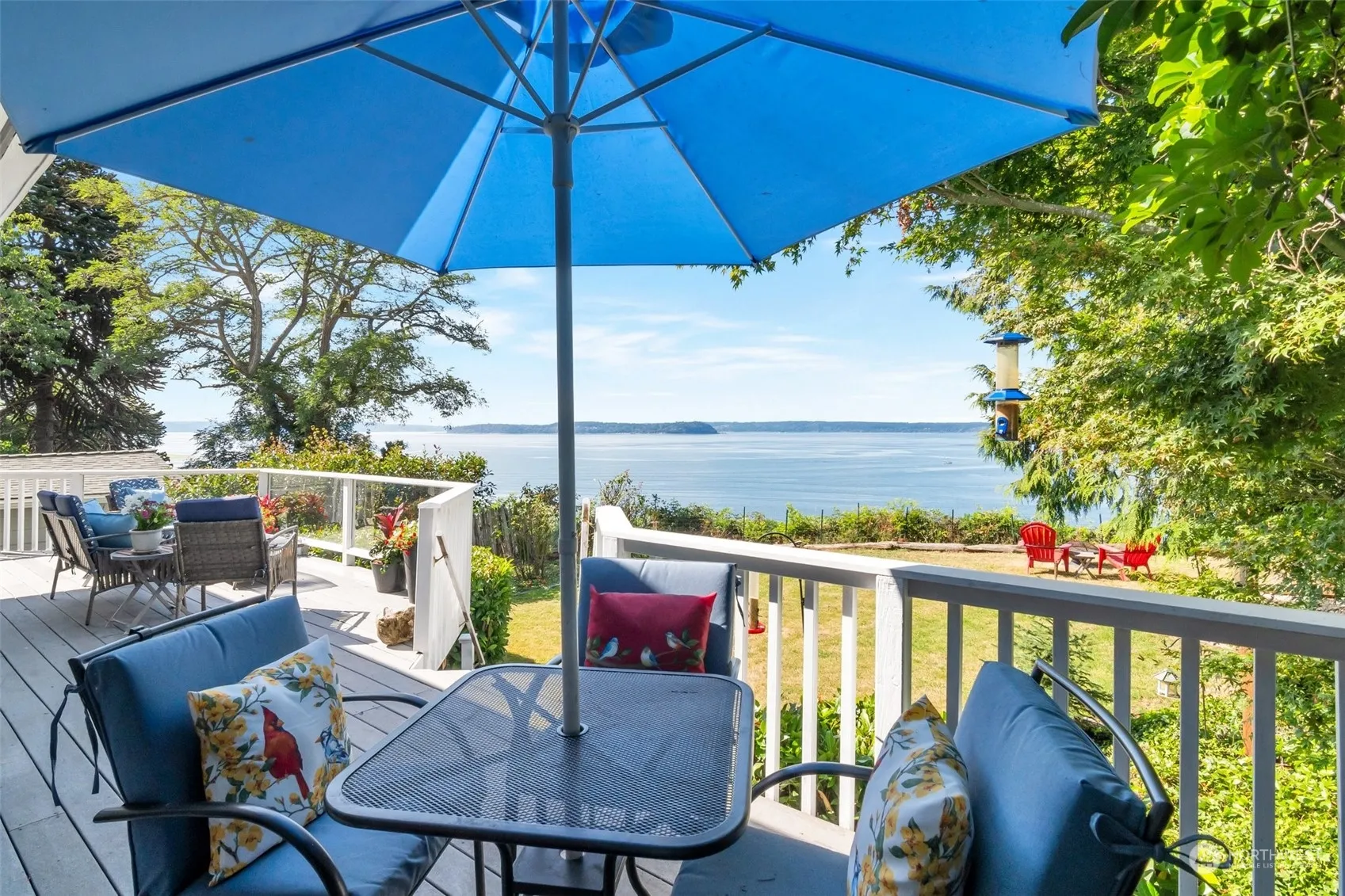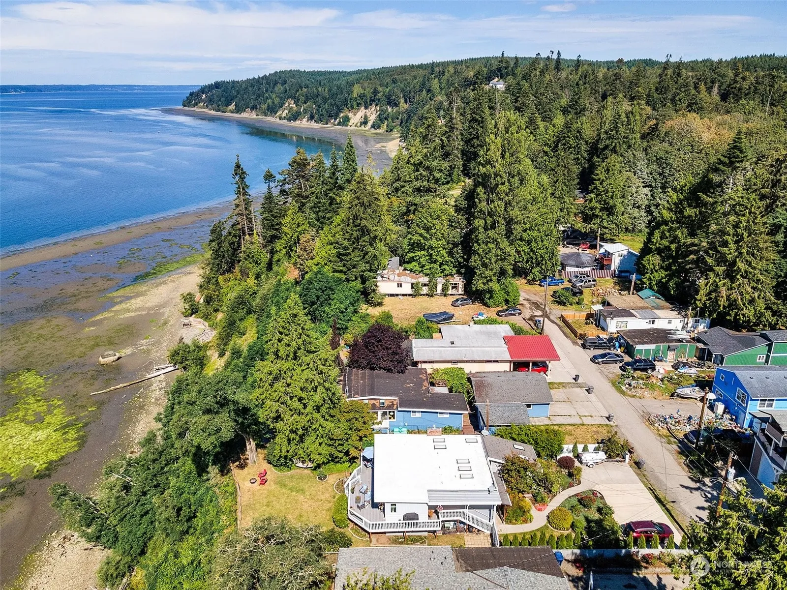 Millon dollar breathtaking waterfront views of the Sound & Olympic Mountains with 50+ feet of high bank ocean frontage for 1/3 the price! Expansive view deck with awning & lush landscaped yard. View whales, eagles & incredible sunsets. Light & bright, remodeled open floor plan with hardwoods. Large kitchen with new cabinetry, skylights, stainless appliances, prep island & slab quartz counters. Dining & living room with cozy electric fireplace. Primary suite with full-bath & water views. A second bedroom & full-bath/laundry. Lower level 2nd bedroom. Separate entry basement with bonus room for storage, shop, or exercise. Plenty of off-street parking. Easy access to conveniences. 50 year Fryberg land lease. Lifetime PVC roof. Comes furnished!