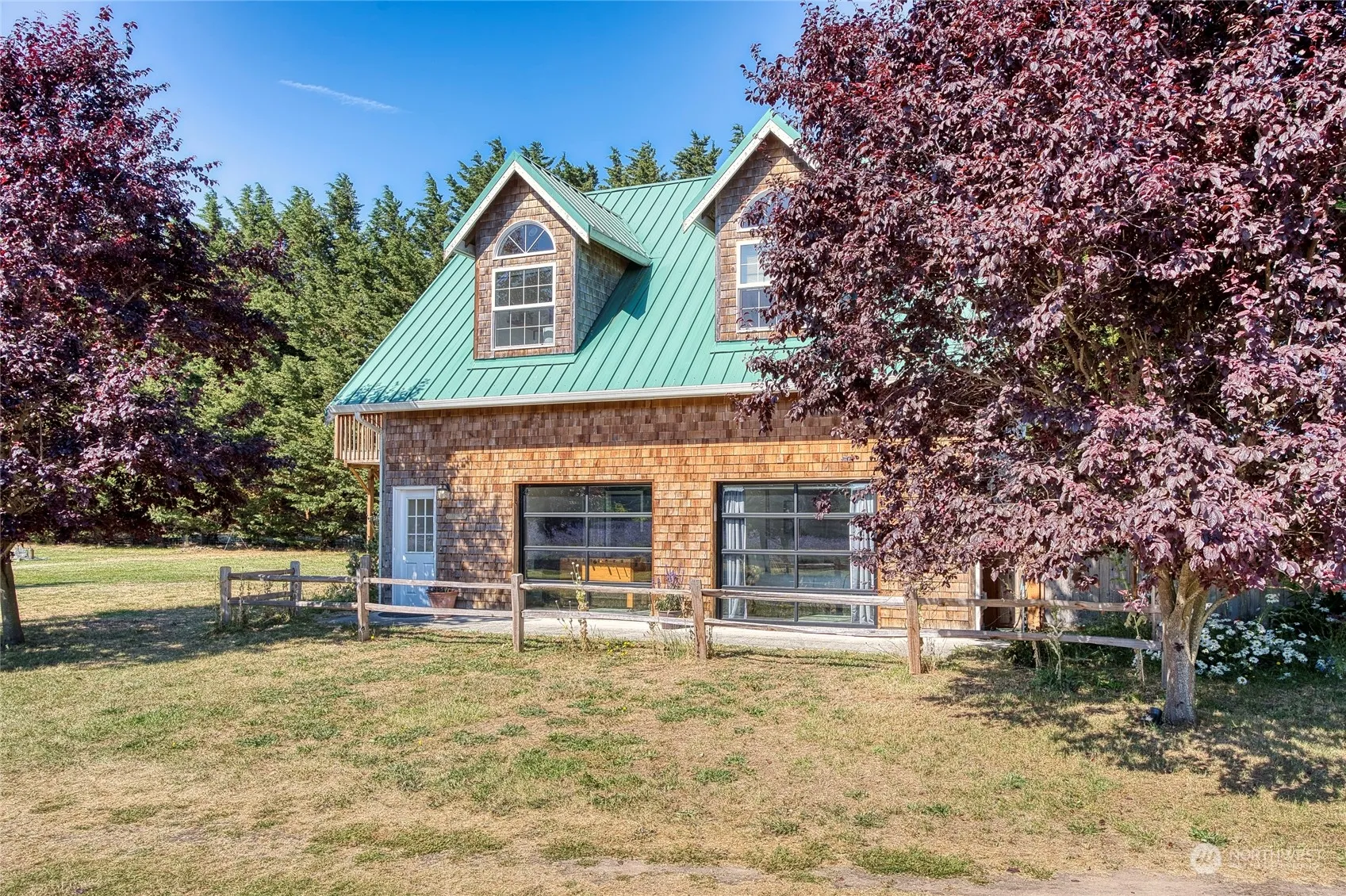 Escape to a serene oasis on 5 acres, where a beautiful wood shingle home awaits. With a lovely crafted bright living space, this home boasts wood details throughout, creating a warm and inviting atmosphere. Mature landscaping with 7 varieties of fragrant lavender fields surround the property, leading to breathtaking mountain views. Short walk to the Dungeness Bay waterfront to take in the sunsets and fresh salt air. This property also features charming outbuildings, valuable irrigation rights, play area, RV pad, outdoor entertaining areas, fire pit and chicken coop. Whether you’re looking for a peaceful retreat or an active outdoor lifestyle, this incredible setting has something for everyone. Come experience lavender bliss in sunny Sequim