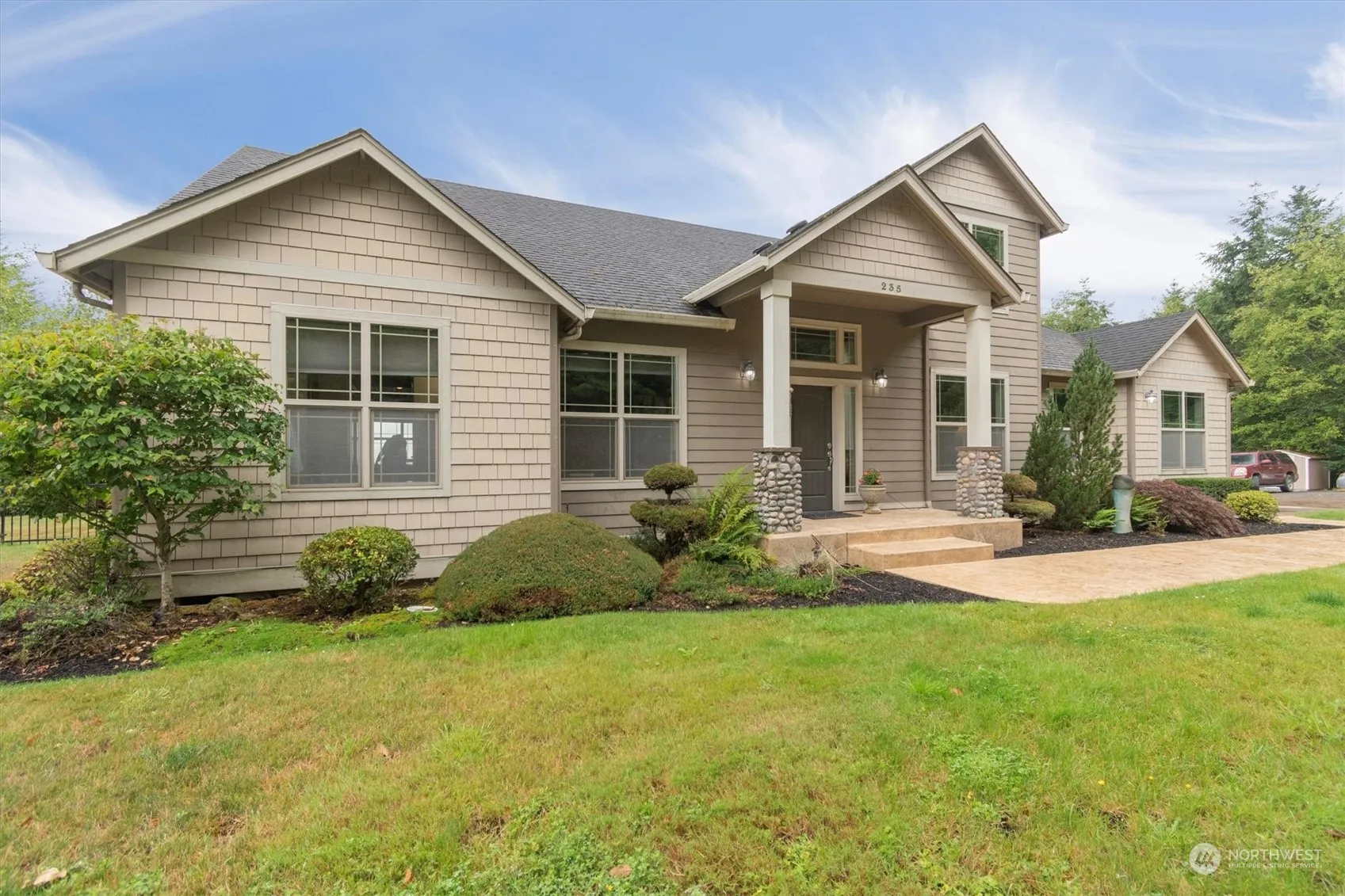 If seclusion and privacy is what you seek, this 5acre property with a view of the Columbia River and Mountain Range, is for you. Ample space within this home. Main floor provides office/den(could be 5th bedroom), dining room, eat in kitchen, breakfast nook, living room with fireplace and built in entertainment center, primary bedroom with two walk in closets and ensuite. Upstairs hallway overlooks first floor living room, includes two bedrooms, one full bath and a large family room or second primary suite and desk nook. Beautiful stamped concrete walkway to entrance and back patio. 3 car garage. Hot water heater only a couple years old. Room for animals, shop, barn and more. Low maintenance yard with sprinkler system and mature landscaping.