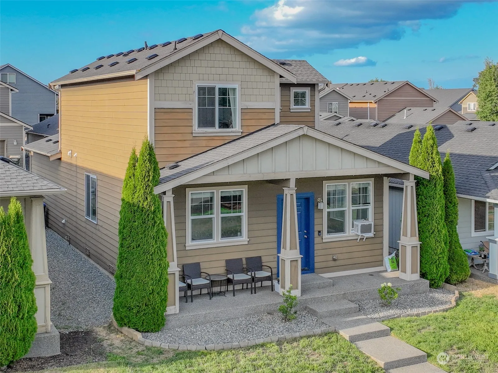 The house with the blue door! Welcome to Tahoma Terra: a desirable Yelm neighborhood with easy commuting to Olympia & JBLM. An easy flowing floor plan with laminate throughout the living space. Tile counters and full tile back splash in open Kitchen with crown-molding topped shaker style cabinetry. Archways, recessed lighting, 2″ mini blinds. The Primary Suite with private bathroom is conveniently located on the main level while upstairs hosts two guest bedrooms sharing a full guest bathroom. Enjoy your morning coffee on your covered front porch, watching the sun rise over the community park with playground and sports court, just a short stroll away. Alleyway provides access to your attached garage (plus driveway parking). Home, sweet home!