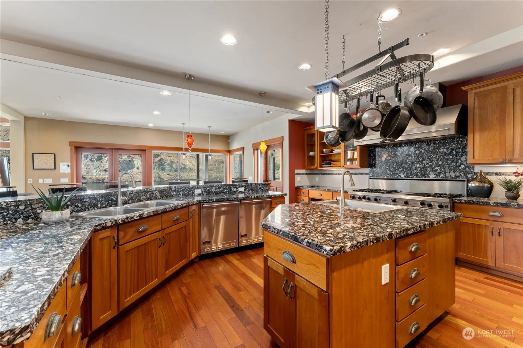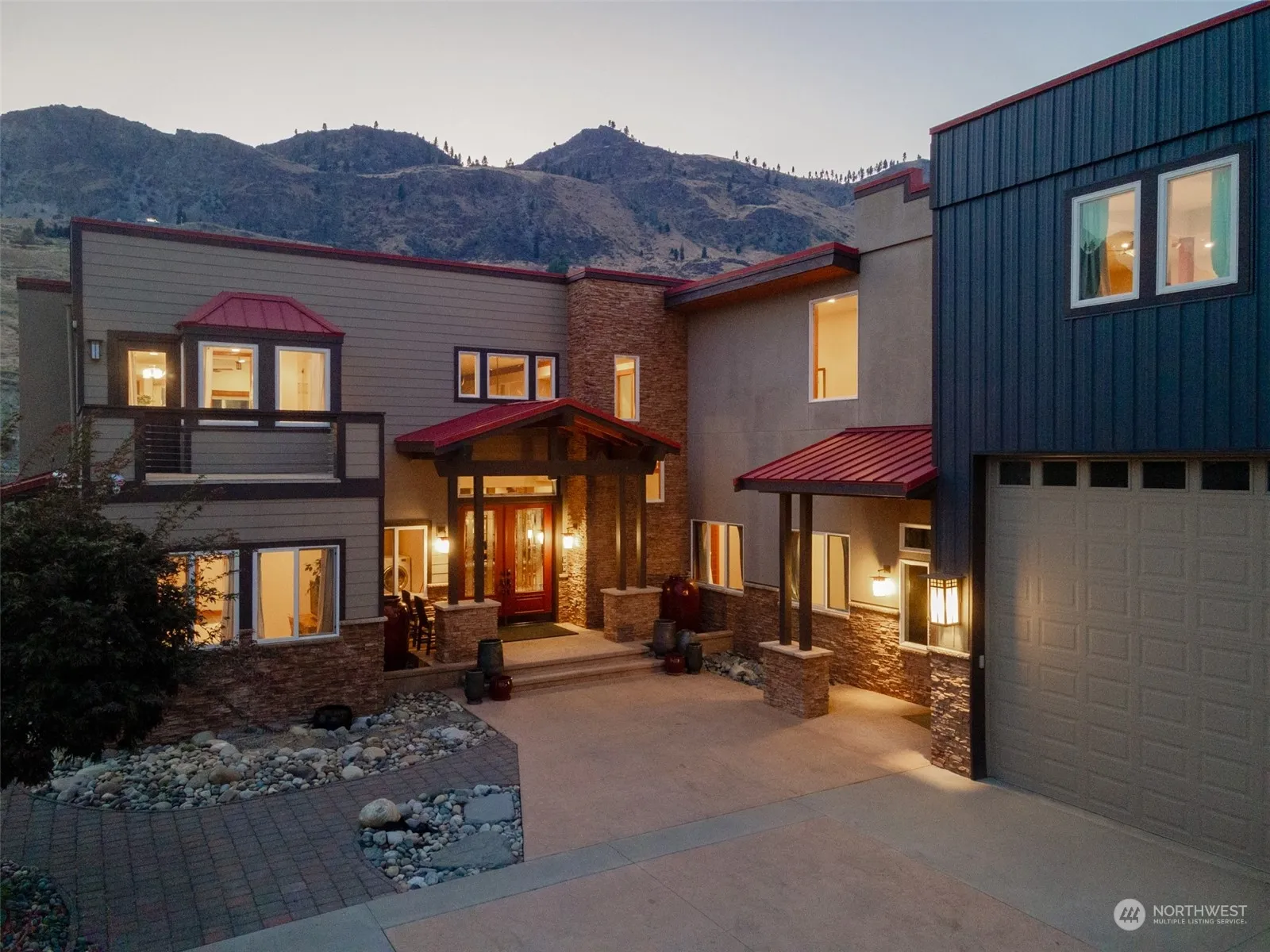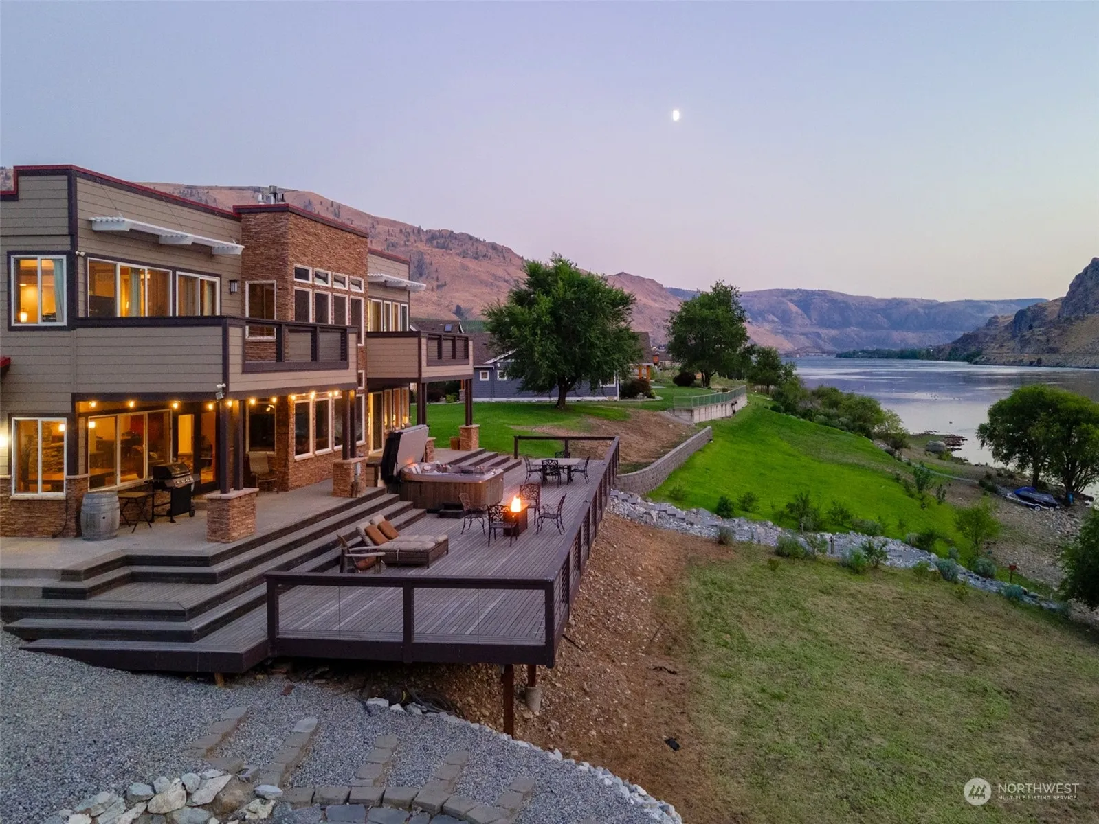 Stunning 6,884sf, 5bd/6.75bth low bank waterfront home w/ permitted buoy overlooking the Columbia River w/ unparalleled views, high-end luxury finishes & expansive outdoor living areas. The spacious home features high ceilings, hardwood floors, granite countertops, 2 primary bedroom suites w/ fireplaces, walk-in closets, baths w/ marble flooring & radiant heated floors. Great Room w/ vaulted ceilings, sliding glass doors & gracious entertainer’s kitchen w/ Viking® appliances. 4 additional bedrooms, large media room w/ bunks & wet bar & an attached garage w/ oversized doors that doubles as a yoga/exercise studio complete the home. Outdoor dining & lounge area w/ private spa. Fully furnished, turn-key Vacation Rental Home, 8 mi from Chelan.