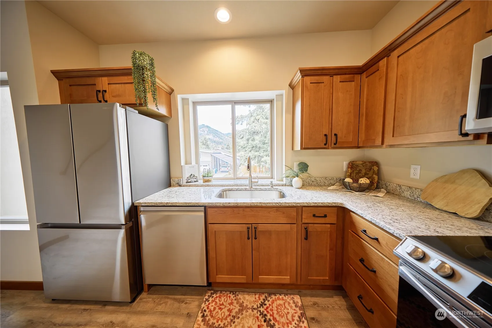 OWNER CARRY OR RENT TO OWN! Brand new condo in the heart of Leavenworth! Welcome to this band new luxurious 2 bedroom 2 bathroom condo with high end finishes. The open-floor plan seamlessly connects living, dining & kitchen areas creating a perfect space for entertaining guests or relaxing. New maple cabinets, granite countertops and a view window above the sink features the surrounding mountains. The primary bedroom & bath features a tiled shower and granite countertops.. The two car garage with extra storage and work bench room, goes out to the private backyard. Unbeatable location just a short walk to town feels like a staycation every day!