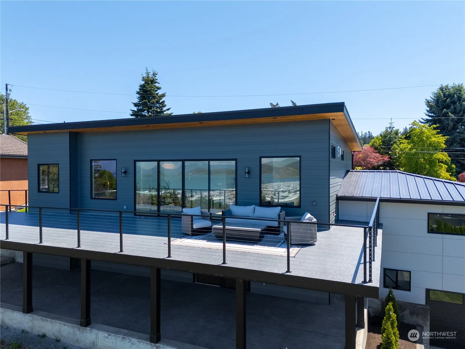 Enjoy prime in-town living and unmatched water views of Fidalgo Bay, Cap Sante Marina, and downtown Anacortes! This remarkable home features a 1,000 sq ft deck for indoor-outdoor living, panoramic windows, vaulted ceilings, on a dead end road. The beautiful ensuite boasts exquisite finishes, creating a spa-like sanctuary and the primary closet includes a washer/dryer for convenient single-story living. Downstairs, you’ll find a secondary kitchenette and a covered patio for year-round entertainment. The oversized lot offers space for a potential shop or ADU. Don’t miss the large workshop with backyard access, perfect for any hobby or project! Truly rare to find a fully renovated home, located in town, with water views, on a large lot!