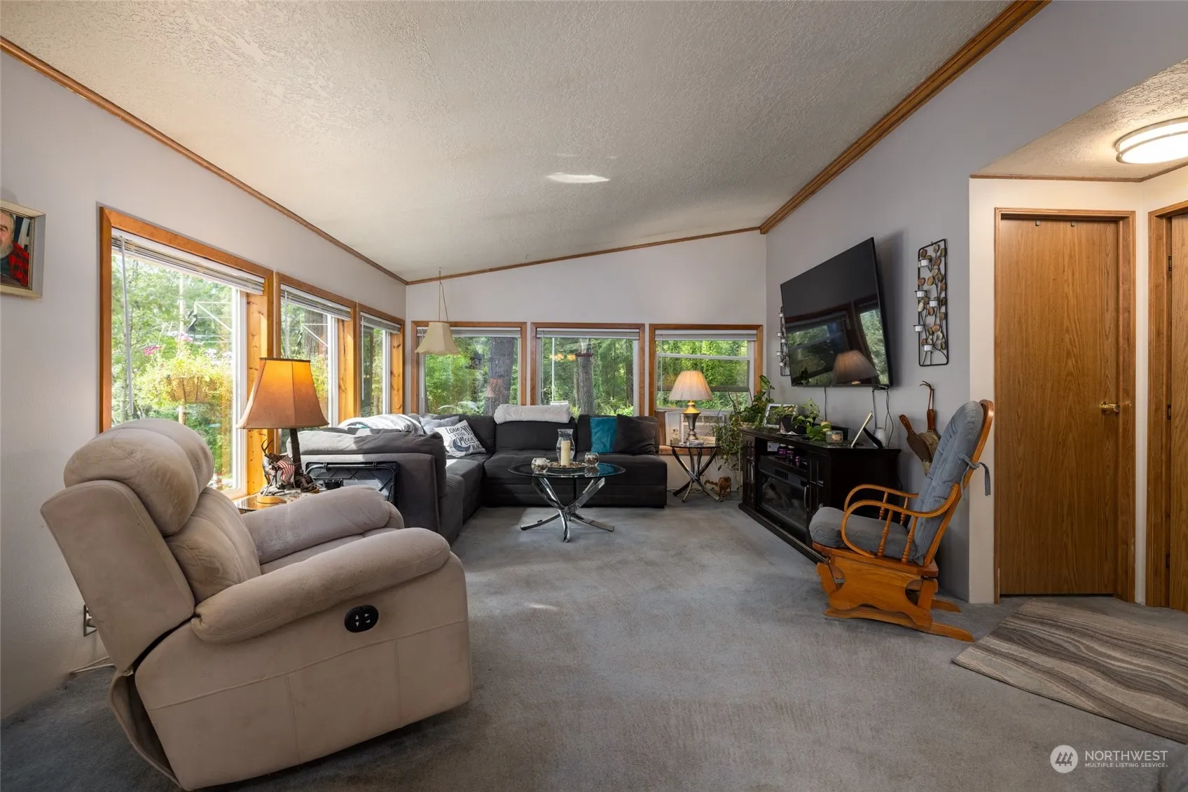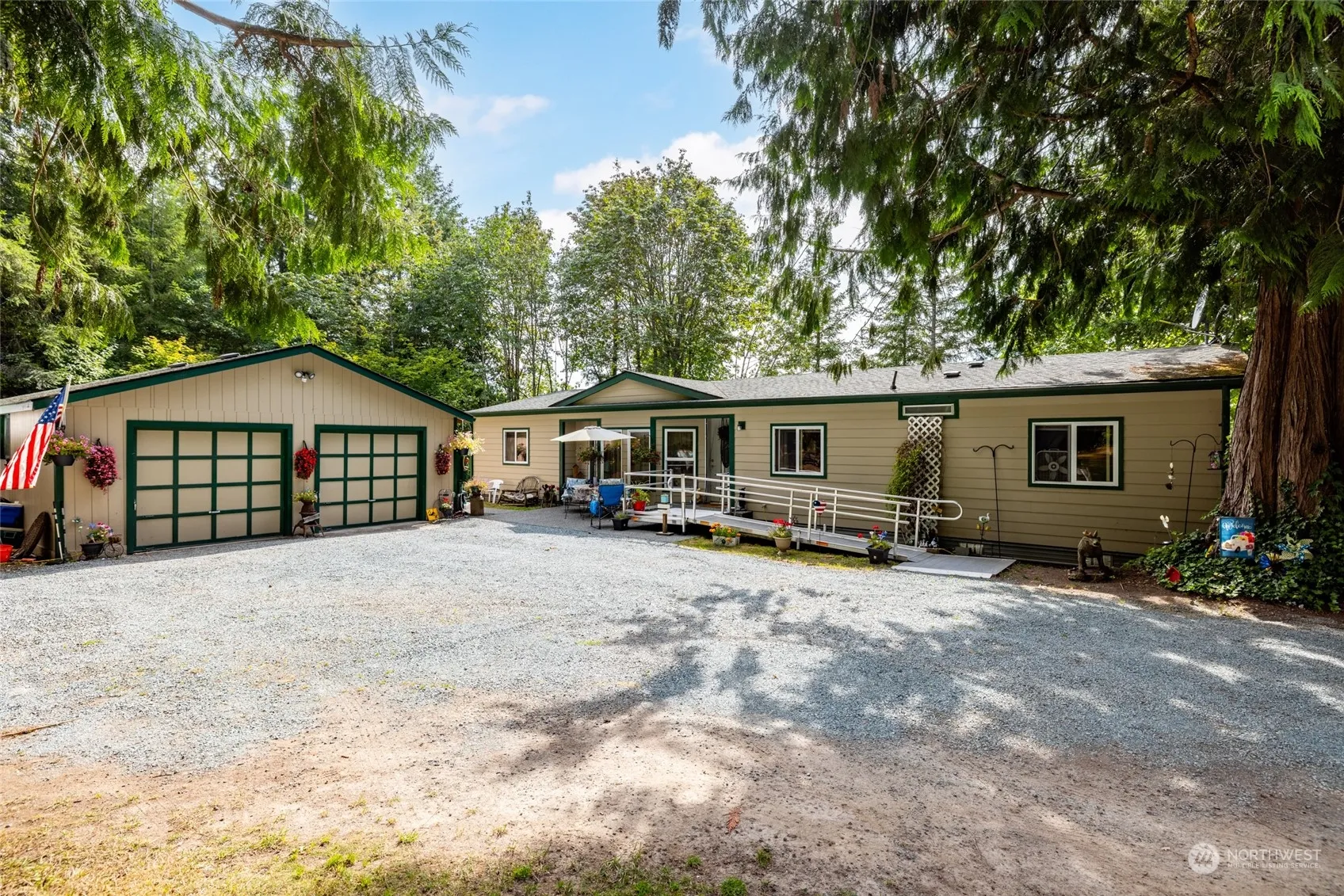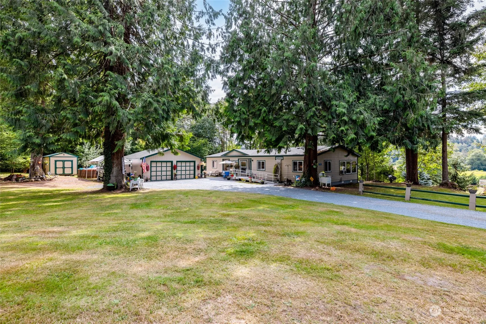 Welcome to your new home nestled on a gorgeous 2 acre park-like setting. Property features a beautiful large kitchen with stainless steel appliances open to dining and spacious family room. Primary bedroom is located off living room with a lovely ensuite. Two guest rooms at the other end of the home share conveniently located full bathroom. Handicap accessible. Step out onto spacious, newly painted back deck & enjoy sounds of nature. Included is a gorgeous gazebo, and large greenhouse for the avid gardener! The double car garage and outbuildings provide abundant storage space. Lots of room for a shop! So much space for those who enjoy serenity & the outdoors. Close to I-5 for easy commute to amenities. **PRICE REDUCED-SELLER MOTIVATED**