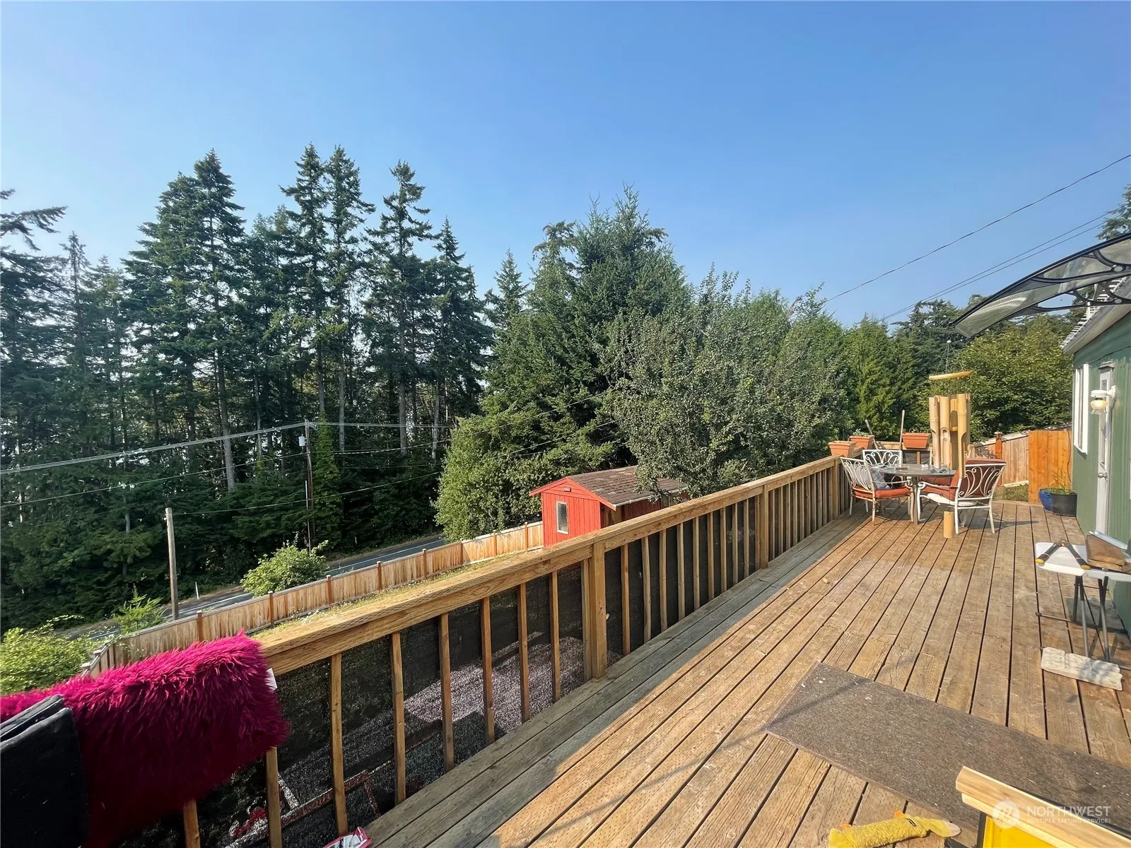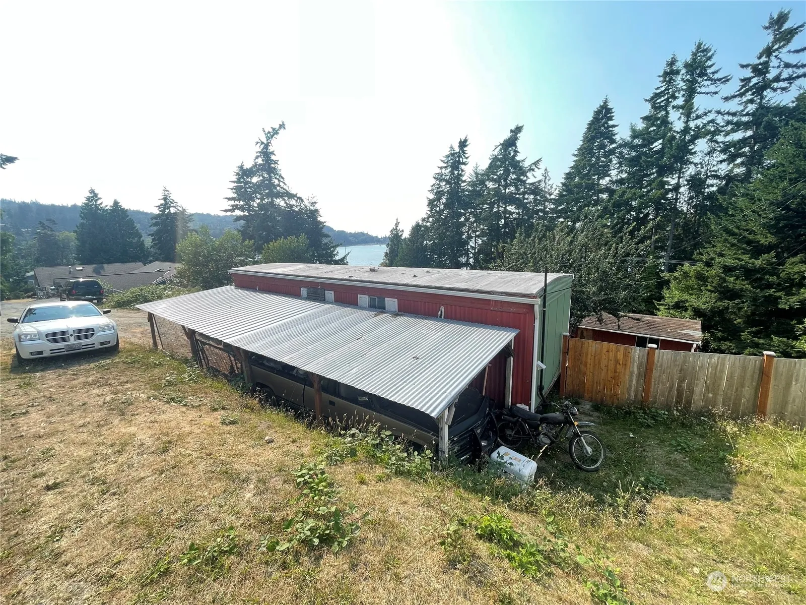 BRING ALL OFFERS. Easy show! Perched high at the top of Ekle Street, with views of the water and beach rights. Someone will either build a new home or fix this up into a gem of a Camano Island hideaway and you will wish it was YOU! Look at that oversized large deck which really extends your living space. Large attached carport around back for your beach gear and kayaks. Room to garden, and make this yard sparkle. This could be your future building site – and it comes with a modest trailer that needs TLC. You might build a lovely home with a seaside view perched among million-dollar neighboring homes.