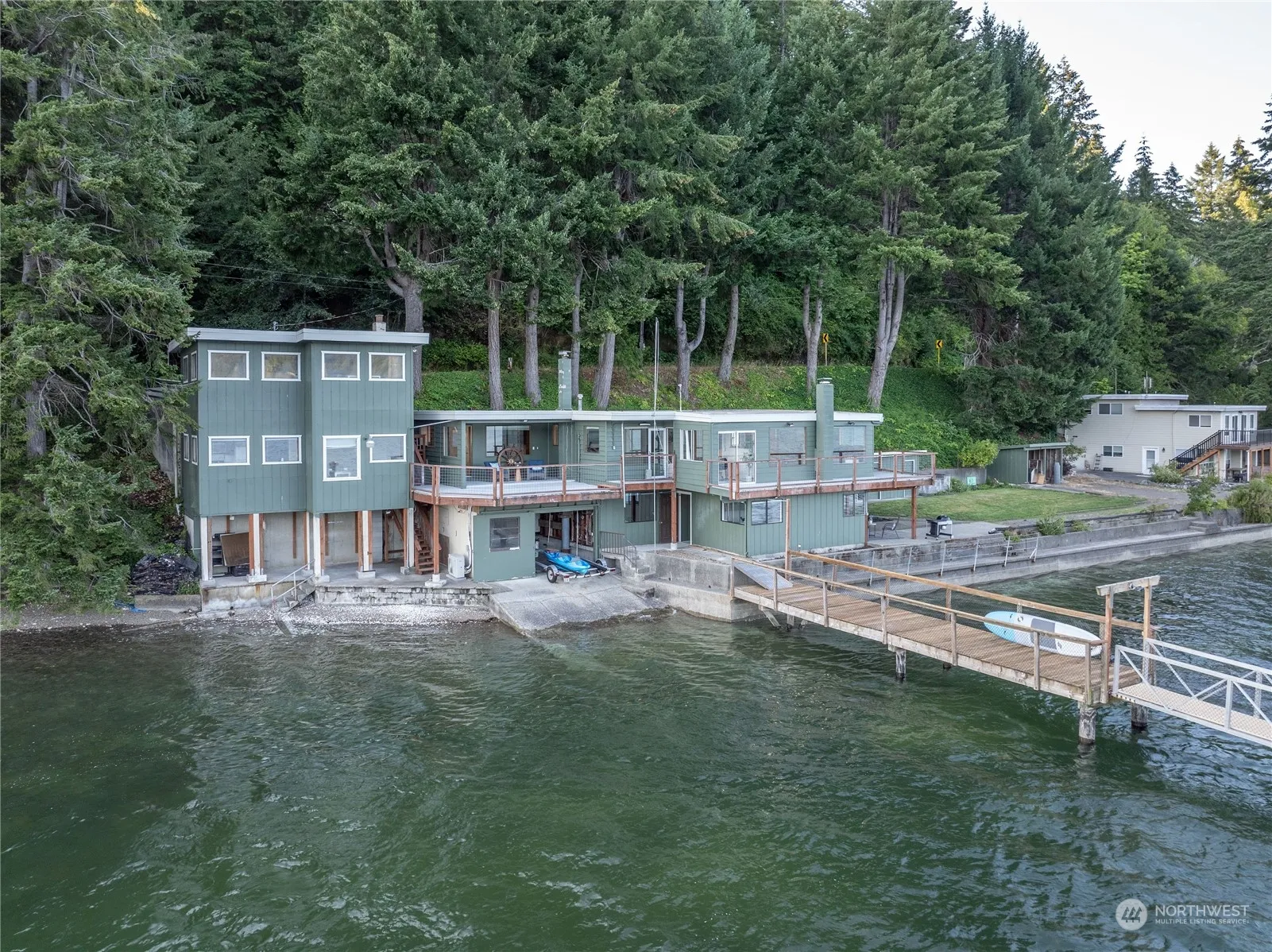 Unique waterfront estate on the Hood Canal *South facing property *200′ bulkheaded waterfront *End of private driveway with ample off-road parking *2 car garage at upper level *1 car carport at lower level *Many upgrades-new exteriror paint, new columns & beams, reinforced decking and railings *Remodeled 1 bedroom apartment *Deep water mooring dock with boat slip *Boat house for 2 boats *Adjacent 1500′ beach owned by timber company provides privacy *Lower part of house includes 3 large rooms and full bathroom *Perfect for multi-generational situation or vacation rental *Workshop space *Home of Sisters Point Shellfish for 35 years growing oysters & clams sold to high end restaurants, a great business opportunity! Extremely rare property!