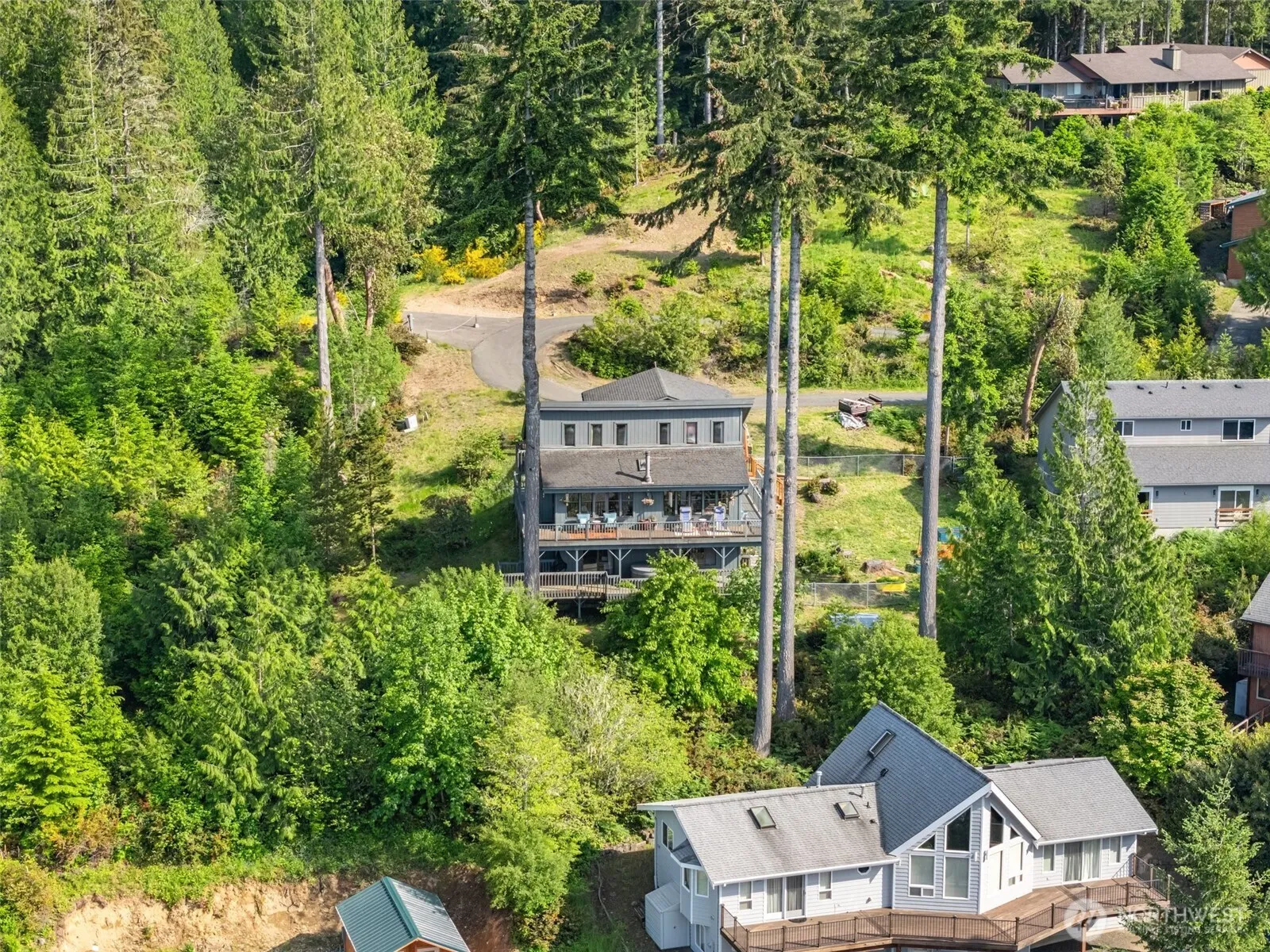 Price reduced on this Olympic Vista gem! Enjoy breathtaking Hood Canal and Olympic Mountain views from every level of this home with great decks on every level. The main floor has your kitchen and great indoor/outdoor entertaining spaces with amazing views and a freshly updated bathroom with a laundry chute. The upper level is an expansive loft space that could be used as a fabulous office or bonus room. Lower level has other bedrooms to choose from and a more private deck with a hot tub. You also have a fenced yard with fruit trees, garden space, and a detached 624 sq ft garage. Homeowners in Olympic Vista enjoy private waterfront access that includes a clubhouse and boat launch. Close to Alderbrook. This is Northwest living at its finest!