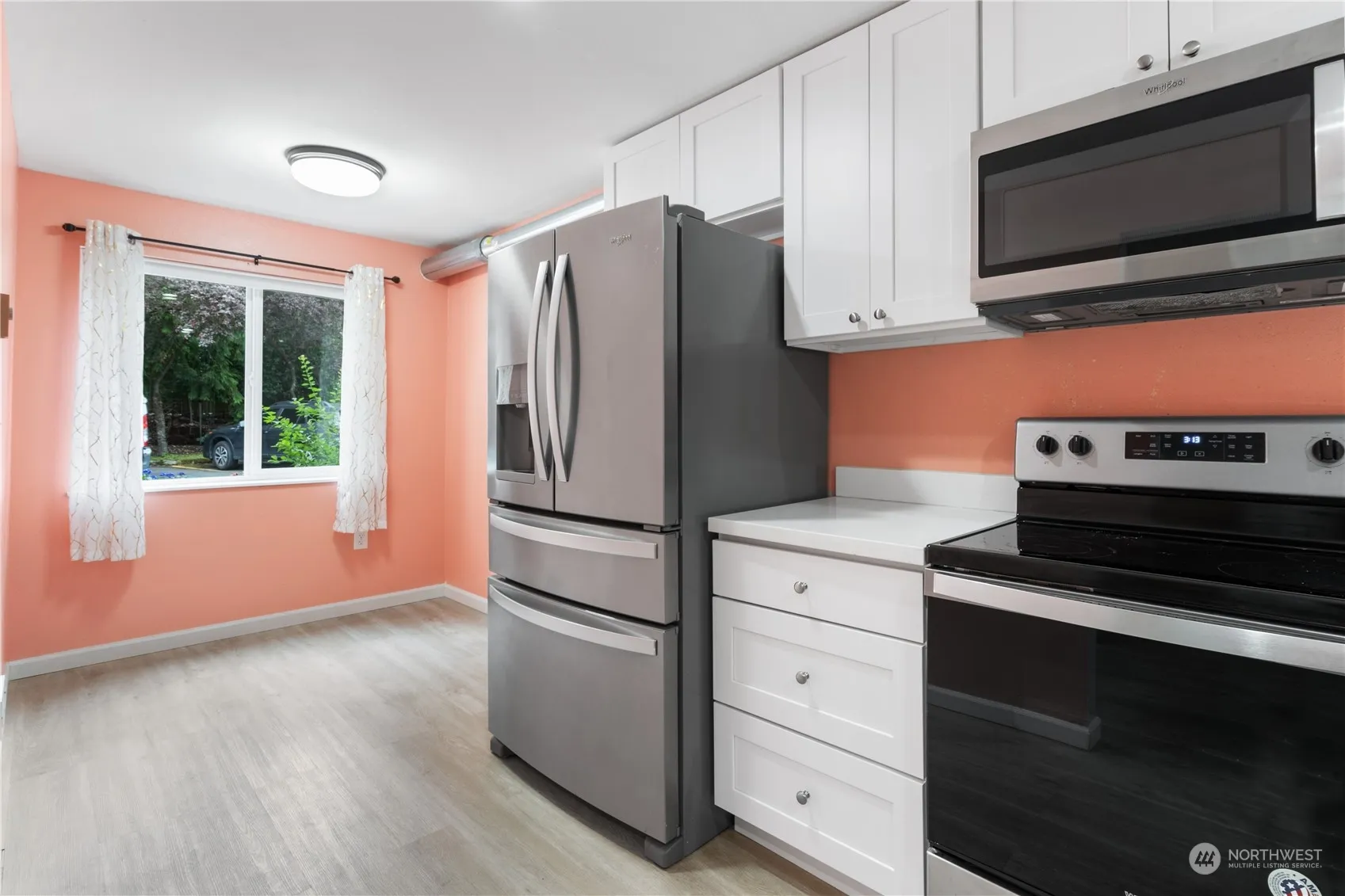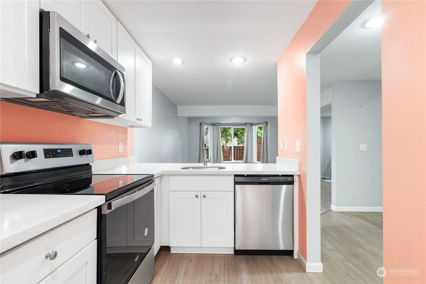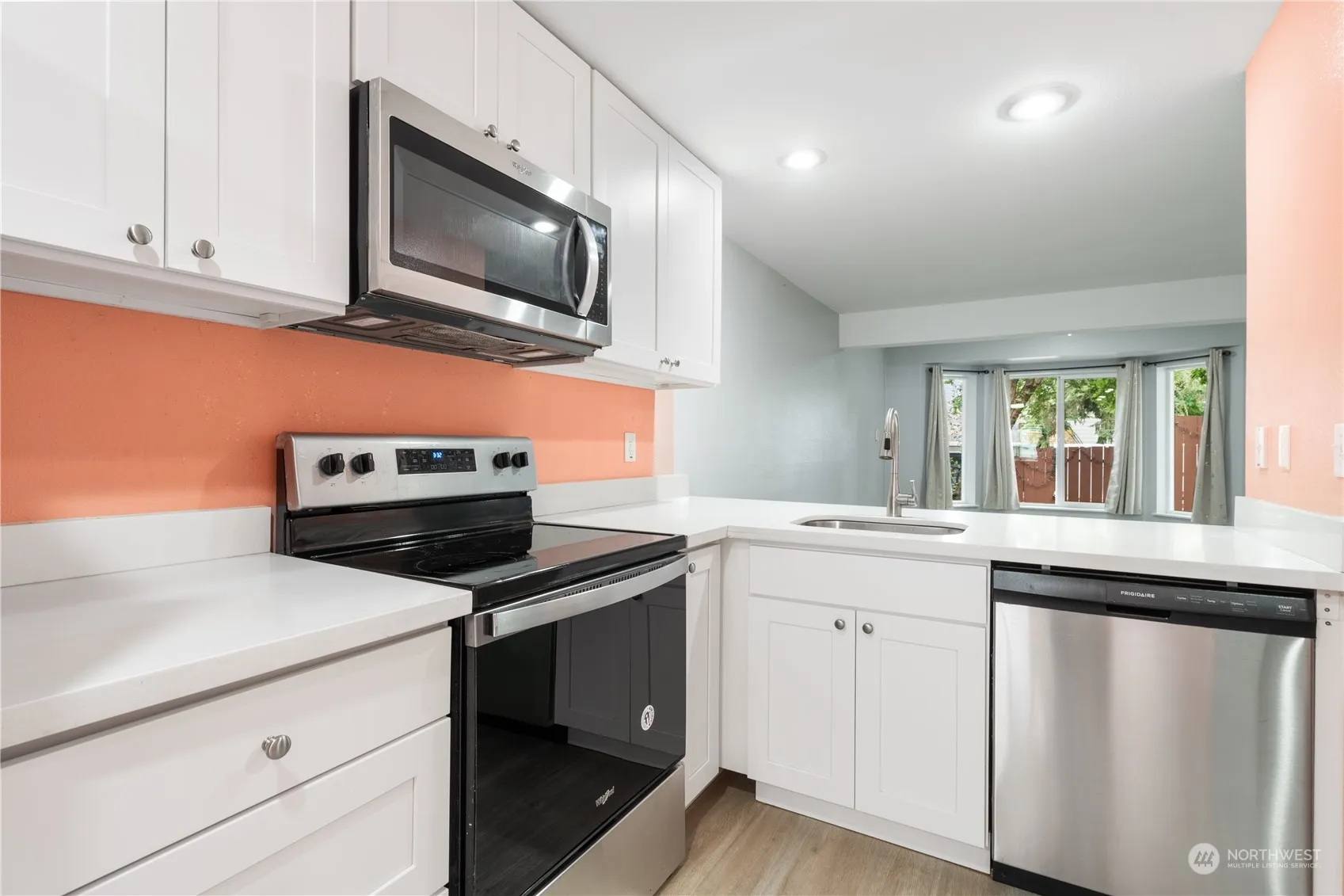 Welcome to this charming 2-story townhouse nestled in the wonderful community of Sunrise North. The main level features an open-concept layout with newer laminate wood floors, an updated kitchen with stainless steel appliances, a sitting bar, private patio w/ garden areas. Upstairs, enjoy a spacious primary suite with a walk-in closet and en-suite bath, along with two additional bedrooms, an updated second full bathroom, and washer and dryer. 2024 New Roof. Abundant storage, one-car attached garage and one additional parking space. HOA includes water, sewer, garbage service and roof & exterior maintenance! 10 unit complex w strong HOA! Pet Friendly!NO RENTAL CAP! Close to I-5, shopping, schools, future light rail, Hamlin park.