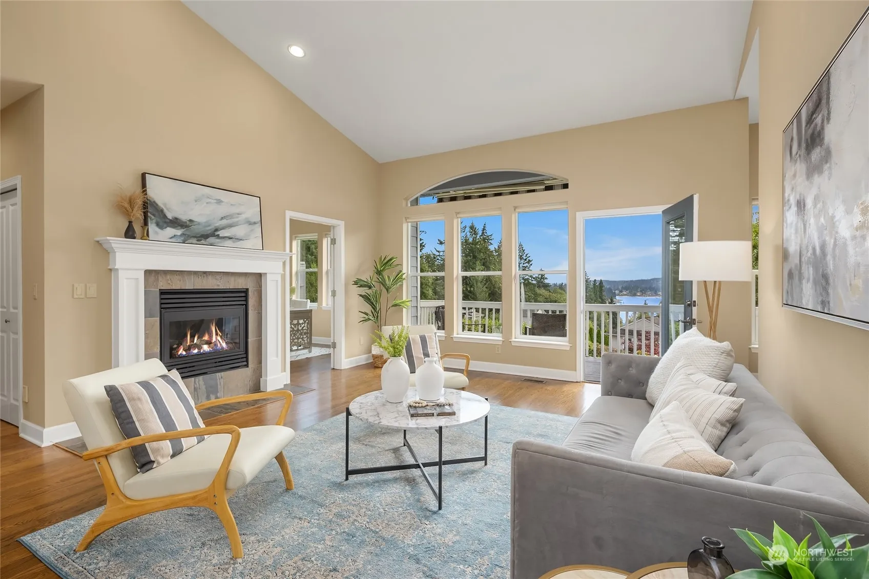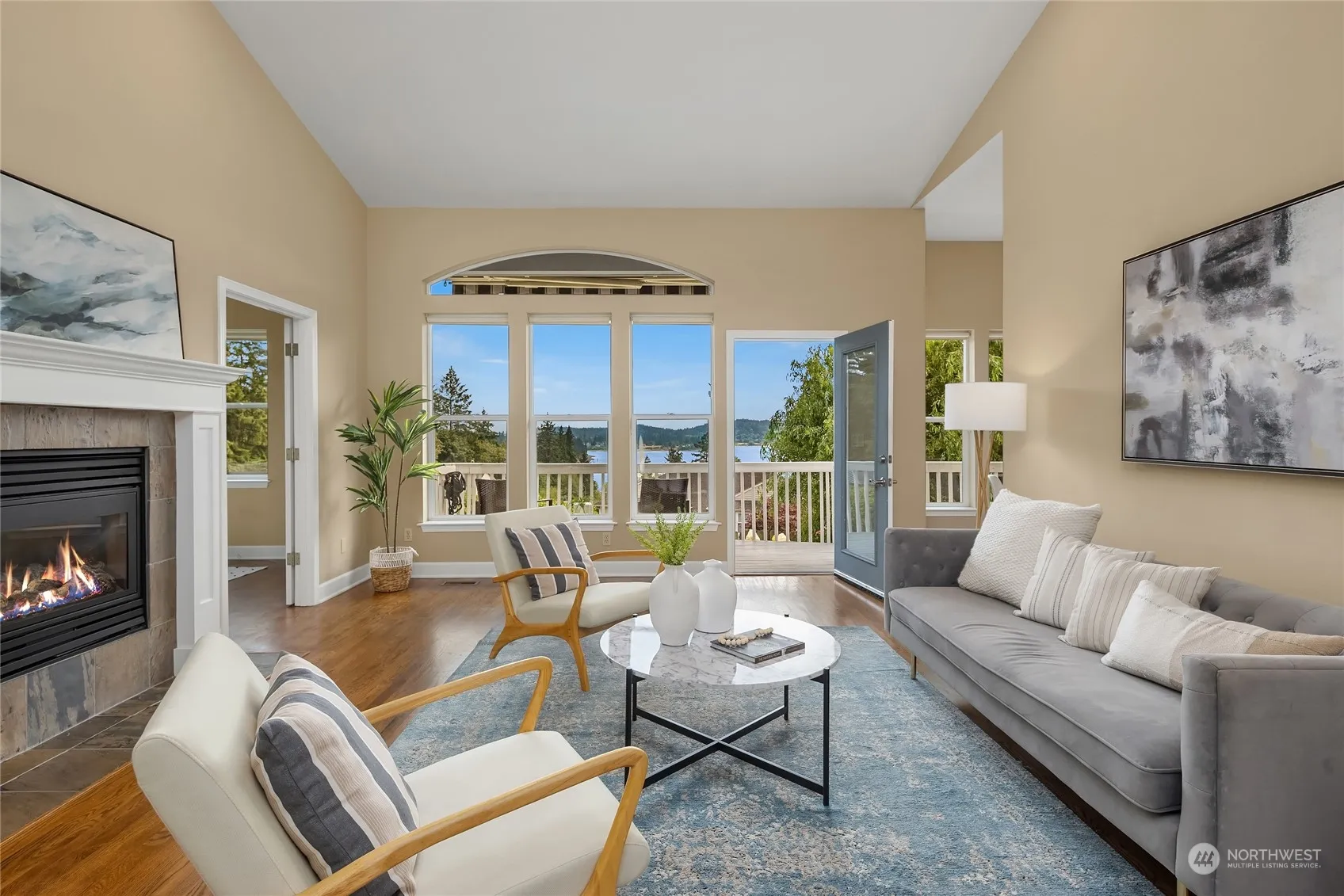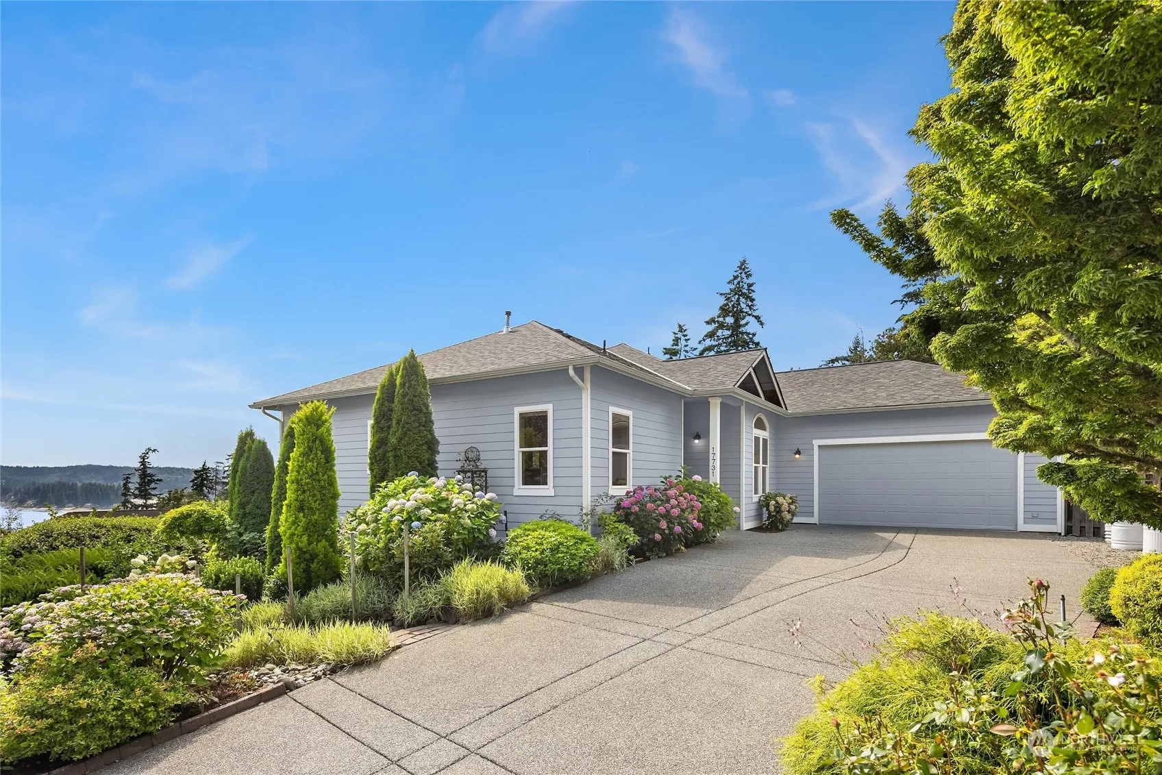 Elegant one level living with a view! Light and bright, this lovely Baywatch home offers a prime location and stellar views of Liberty Bay. The living room boasts vaulted ceiling, hardwood floors and large picture windows that capture water views. A cheerful and well-appointed kitchen includes a casual dining area, perfect for your morning cup. The thoughtful floor plan features the primary suite on one side and the additional two bedrooms on the opposite side of the main living area, giving privacy to all. Beautifully landscaped, you’ll find mature, flowering gardens meandering the property, delighting with bursts of color and fragrance, and offering a welcome respite. Hardwood floors throughout.