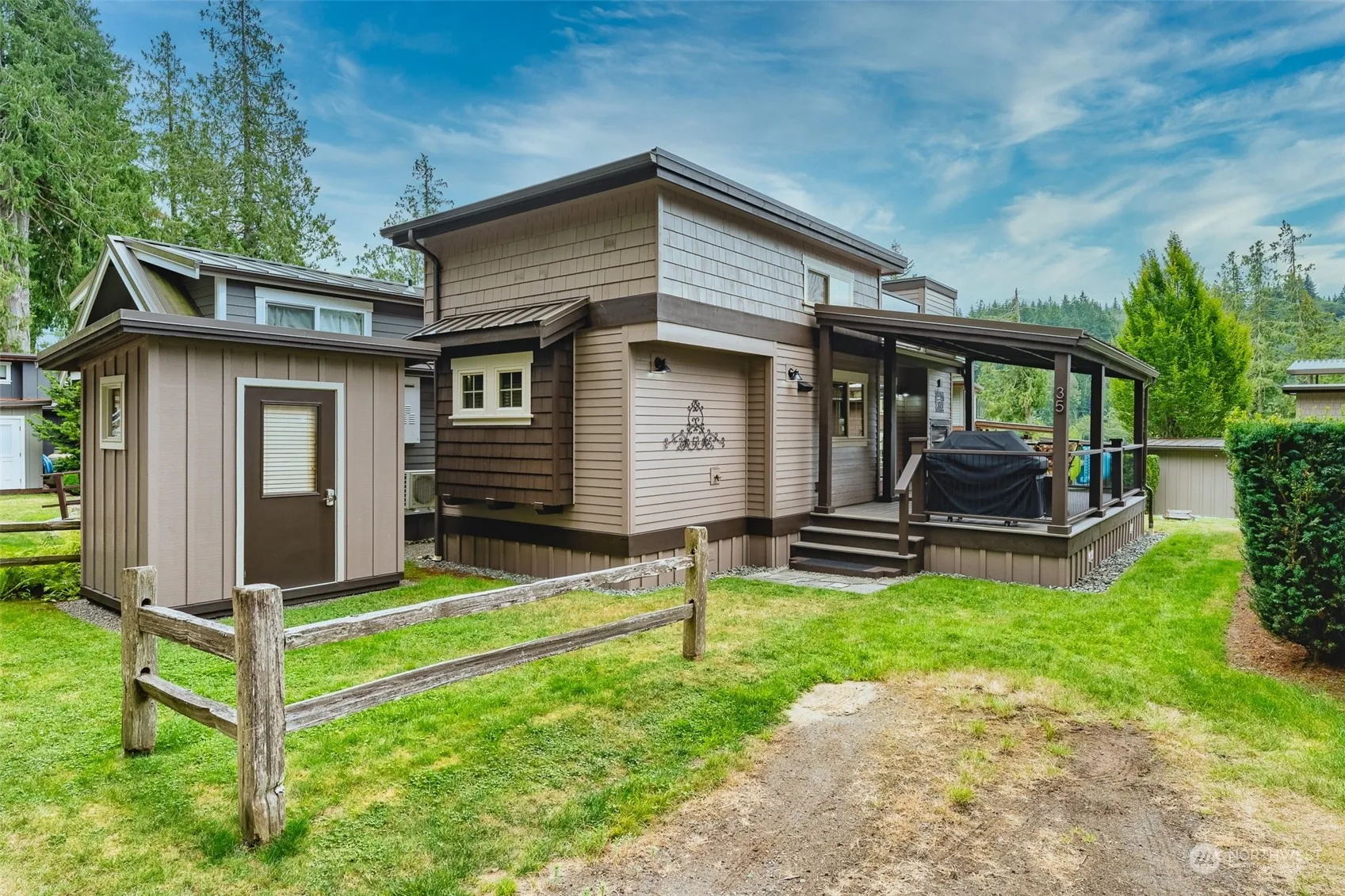 Escape to Wildwood Resort! Your dream vacation tiny home awaits in this top-tier layout, offering lake views from every level. Enjoy cozy nights by not one, but 3 fireplaces—1 on the main deck, 1 inside and 1 on your private rooftop with plenty of space to entertain. Inside, find full-size kitchen appliances, washer & dryer, & warm wood accents throughout. This unit also features a bath/shower combo, a rare find! The loft leads to a rooftop deck perfect for starry nights. Just steps from Lake Whatcom, this gem comes fully furnished & ready to go. Community perks? Pool, hot tub, pickleball, gated entry, on-site manager & much more. Fun and adventure await! First year of HOA dues paid by seller!