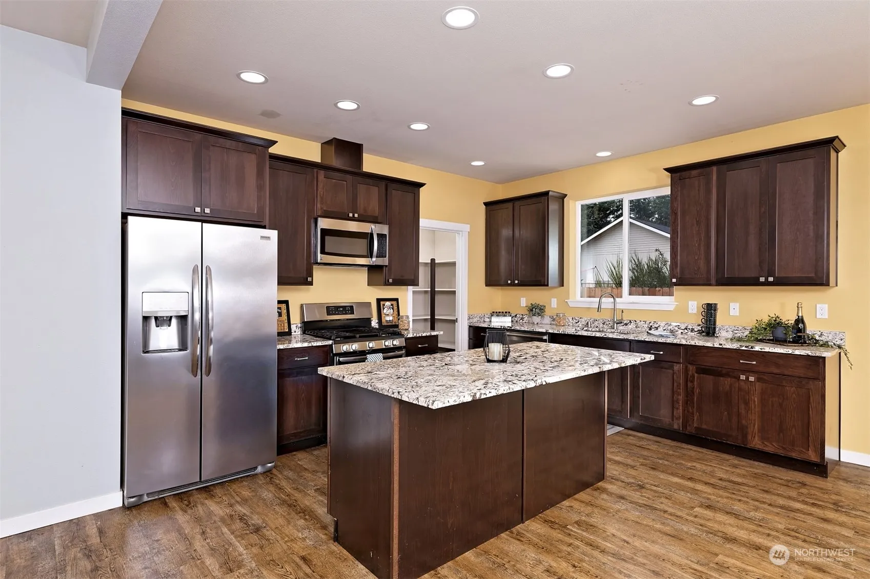 Welcome to the Belwood community! Excellent central location with easy access to HWY 3, 302 and areas beyond. All main level living with new carpet in the good sized bedrooms; The chef will love the kitchen w/natural gas cooking, granite counters, and a large walk in pantry. laminate flooring flows through the main living areas. Vaulted ceilings and large view windows make this home live large and bright. A gas fireplace is ready at the flick of a switch. Sliding doors in the dining area take you to the huge fully fenced backyard. Perfect for outside entertaining w/a firepit, large concrete patio, concrete RV/parking alongside the house as well. Primary with en-suite bath and large walk in closet. A 2 car garage finishes the package off.