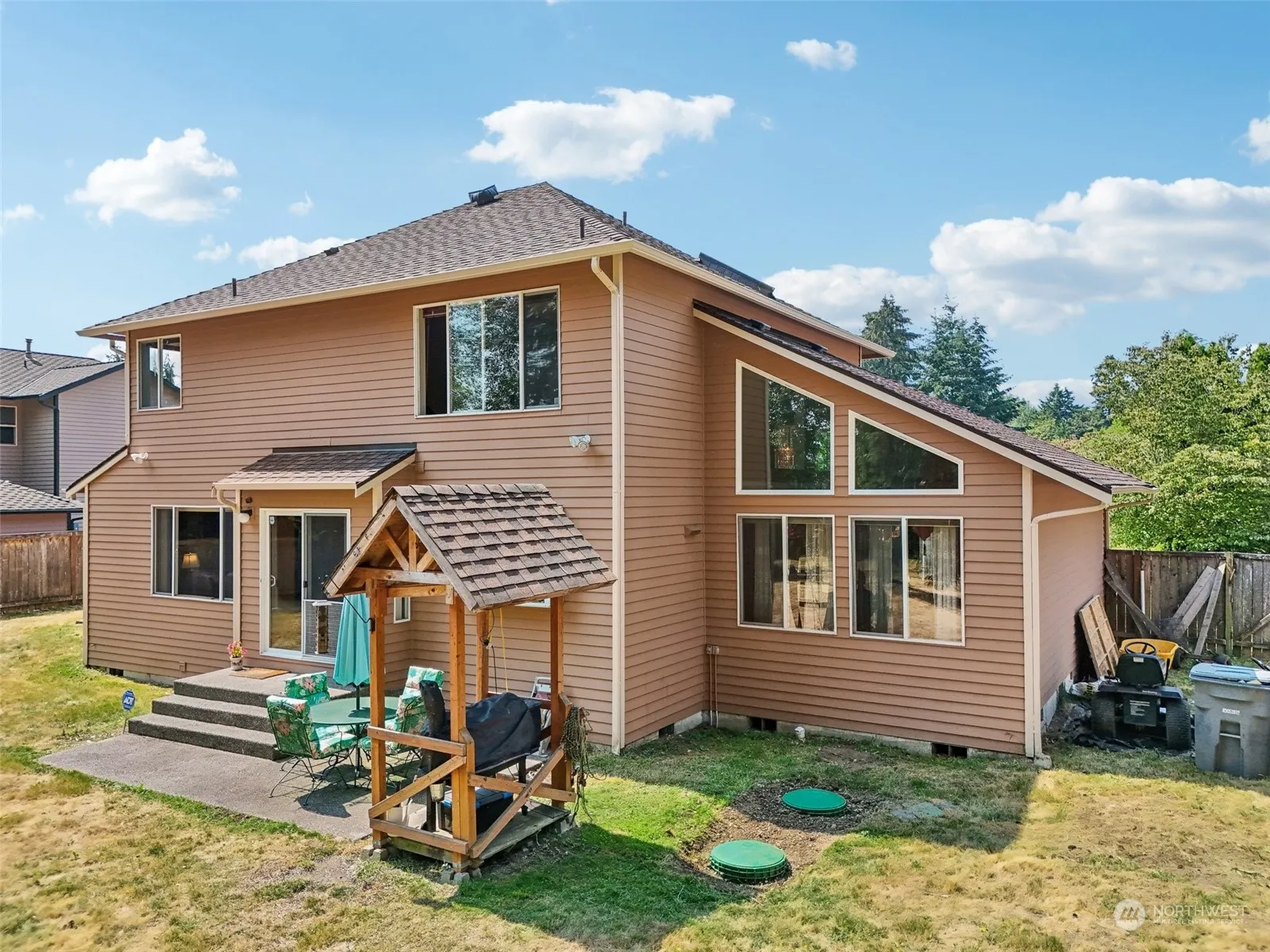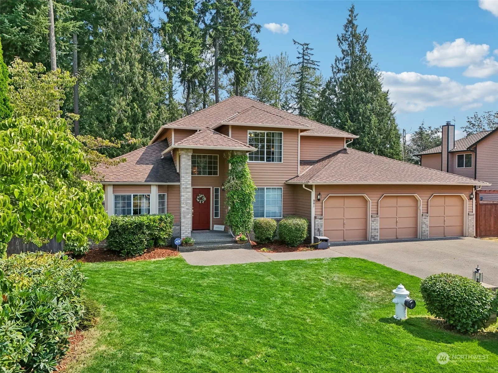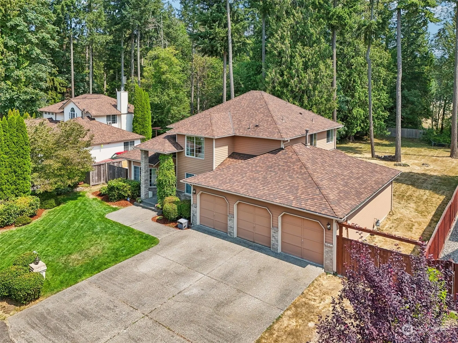 This bright and shining residence meticulously cared for, is situated on a shy 1/2 acre fenced yard & backs onto a greenbelt & the highly desirable Dieringer school! An expansive living room adorned with vaulted ceiling & skylights. 3 beds upstairs with 4th bedroom/office/den down. Kitchen w/island cooktop & granite countertops. Newly painted walls, & new floors. 3 car insulated garage w/office/shop & prewired generator, and a place to park your RV. LK Tapps Park, swimming, trails, & shopping nearby.