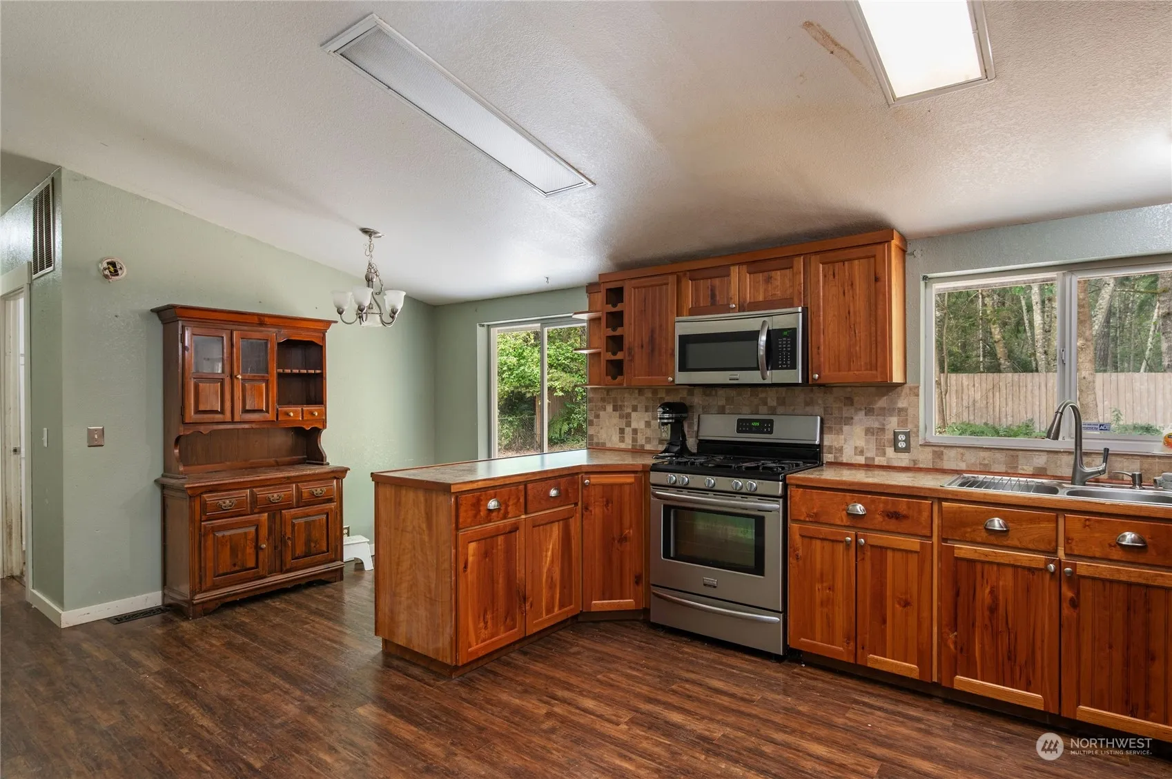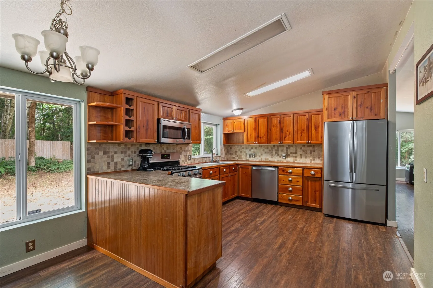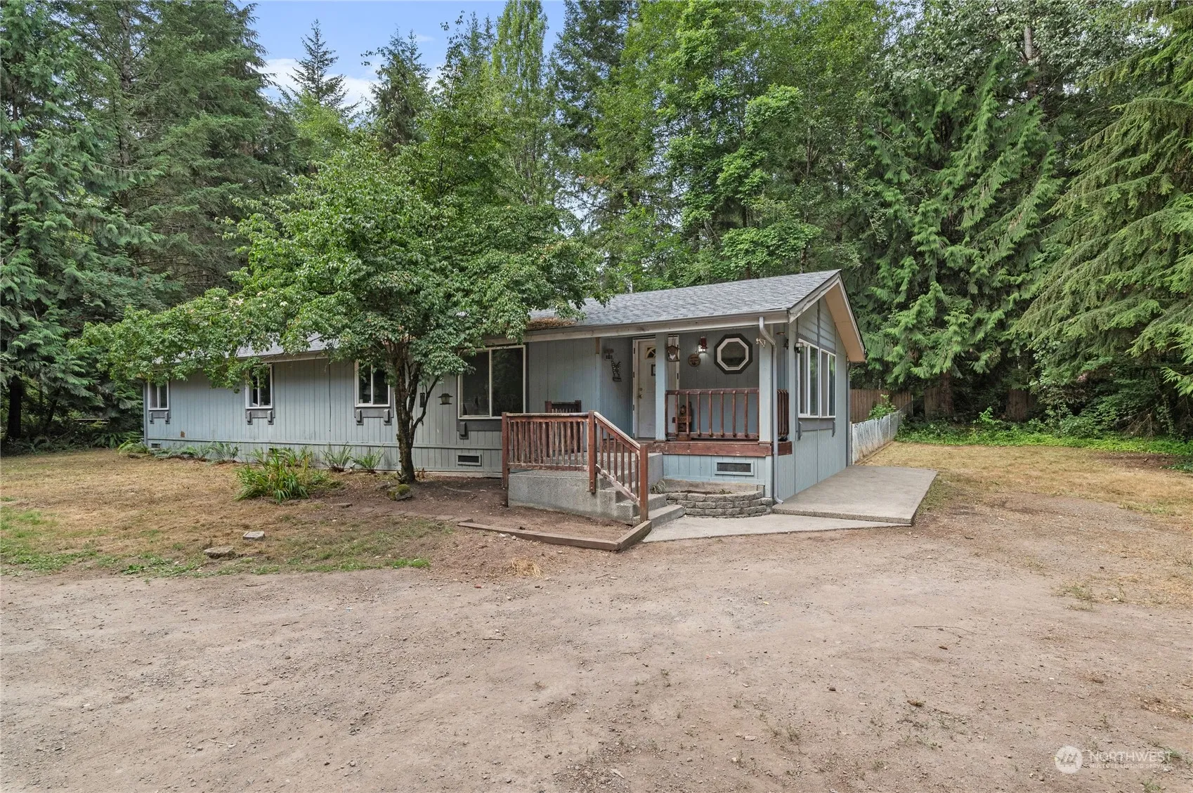 This property features a beautifully updated double-wide manufactured home and HUGE 5 bay shop. Gorgeous cherry wood cabinets, stainless steel appliances, wood laminate flooring, and carpet. The home includes a natural gas range and oven with five burners, perfect for any chef, as well as a natural gas water heater, forced air heating, and a walk-in closet in the primary bedroom with an attached en-suite bathroom. Situated on a secluded 1.83-acre fenced lot, it also includes a secondary chain-link fence for the backyard area, perfect set up for animals if needed. Garden space, additional outbuilding with electrical, and plenty of woods to explore. Come check out this beautifully secluded home today!