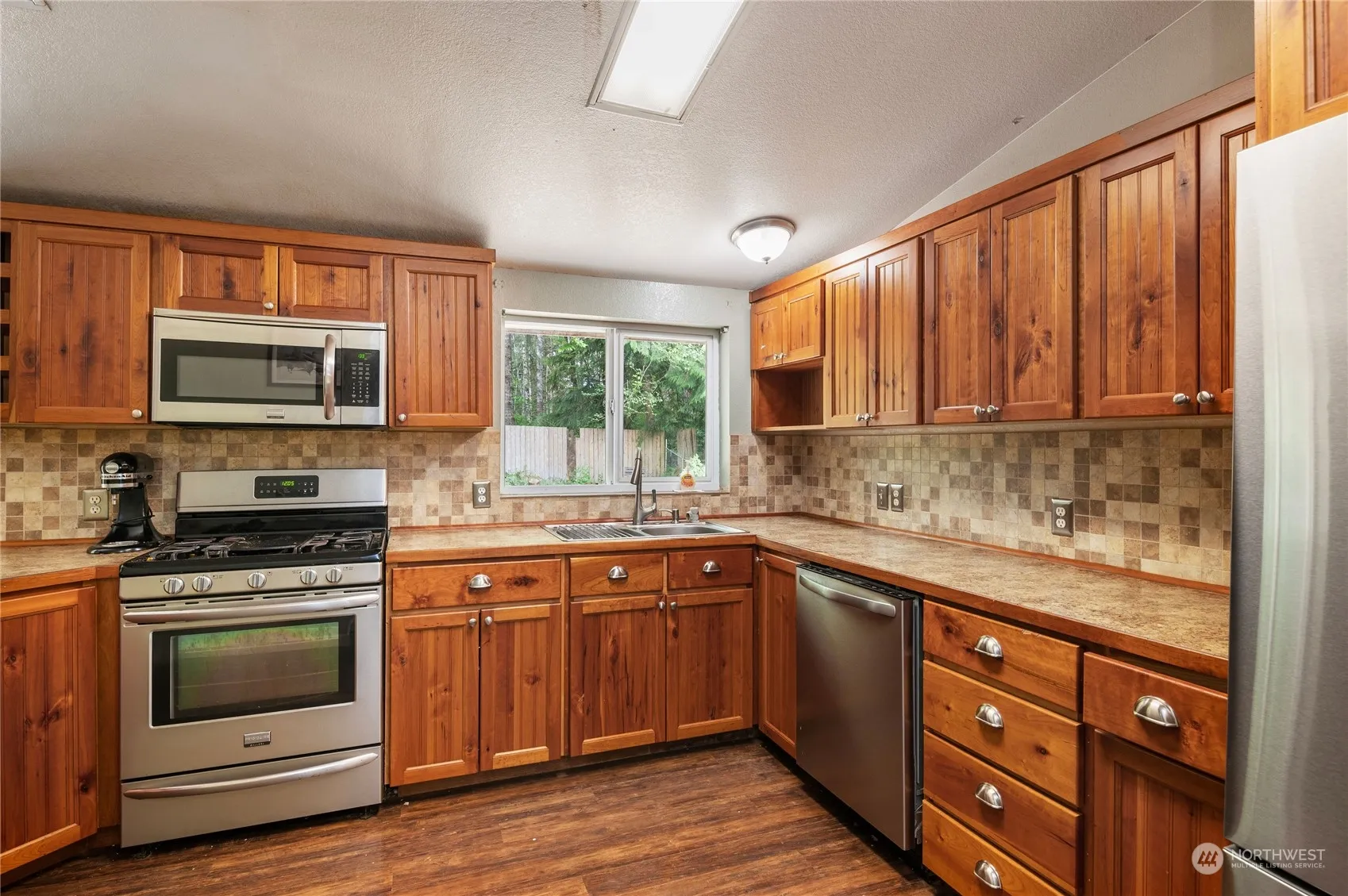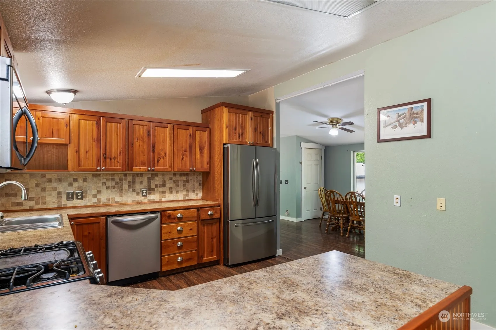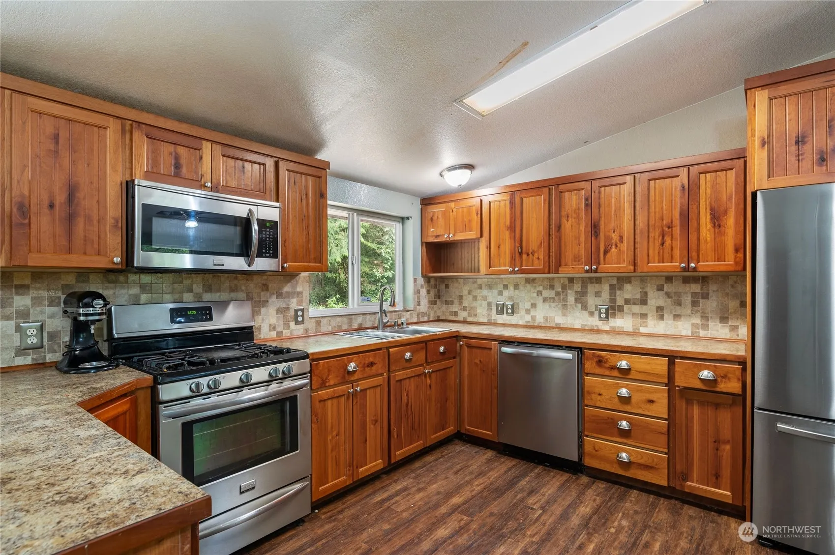 This property features a beautifully updated double-wide manufactured home and HUGE 5 bay shop. Gorgeous cherry wood cabinets, stainless steel appliances, wood laminate flooring, and carpet. The home includes a natural gas range and oven with five burners, perfect for any chef, as well as a natural gas water heater, forced air heating, and a walk-in closet in the primary bedroom with an attached en-suite bathroom. Situated on a secluded 1.83-acre fenced lot, it also includes a secondary chain-link fence for the backyard area, perfect set up for animals if needed. Garden space, additional outbuilding with electrical, and plenty of woods to explore. Come check out this beautifully secluded home today!