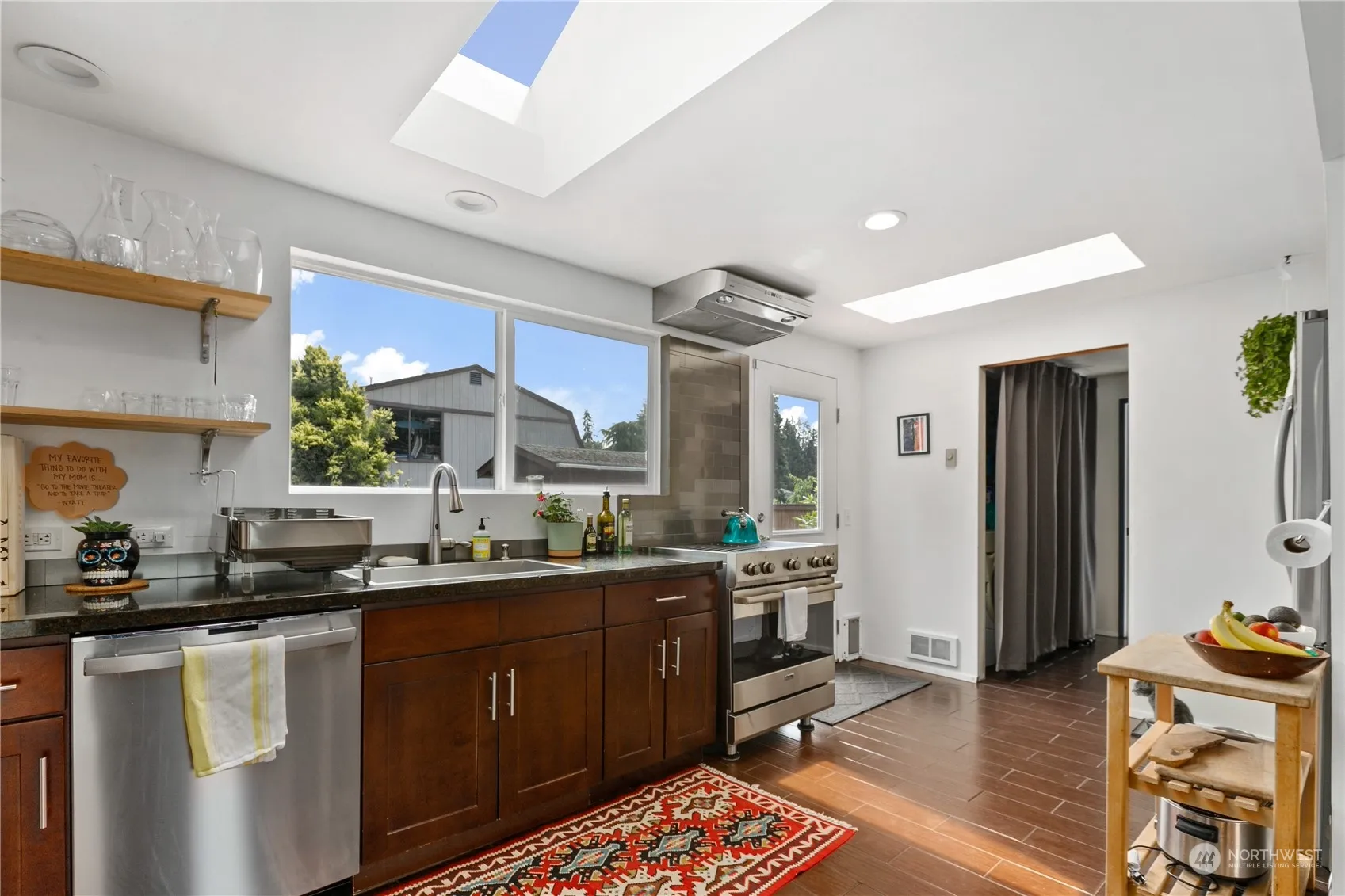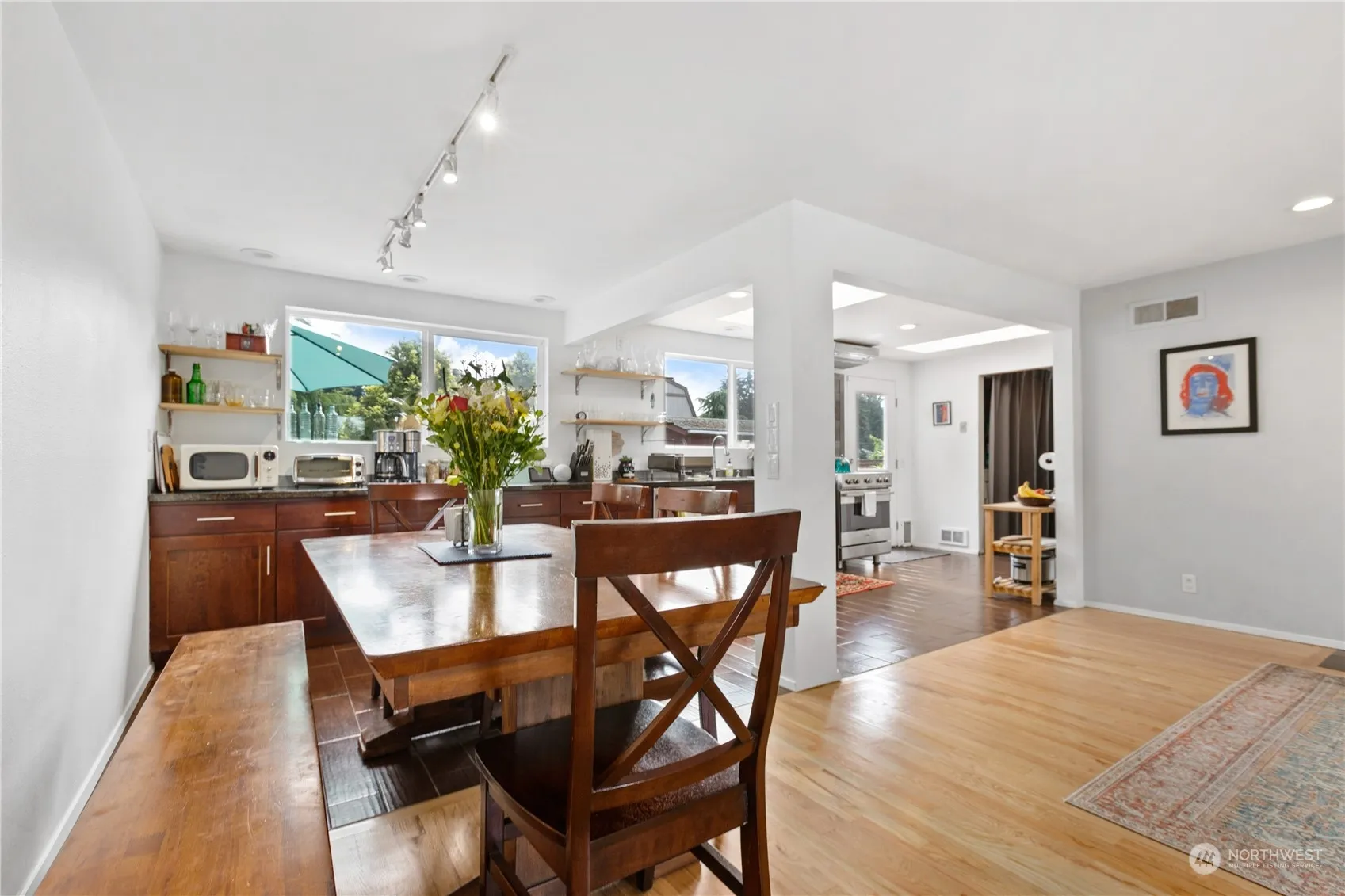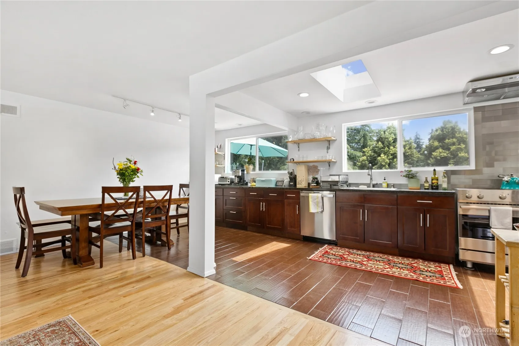 Terrific Shoreline rambler; one level living at its finest! Updated open kitchen with granite counters, copious cabinets, thoughtful skylights and large windows looking out to private entertaining deck and back yard. Open great room concept with light-filled living room and dining room featuring refinished hardwood floors & super cool pass through gas fireplace. Three bedrooms and full bath on one side of house. Other side features a beautiful 3/4 bath and a high ceiling family room/flex space (one of the better garage conversions you will see). Deck & backyard & storage shed accessed right off the kitchen, really adds usable, private outdoor living space. All this in one of sweetest out of the way neighborhoods in Shoreline.