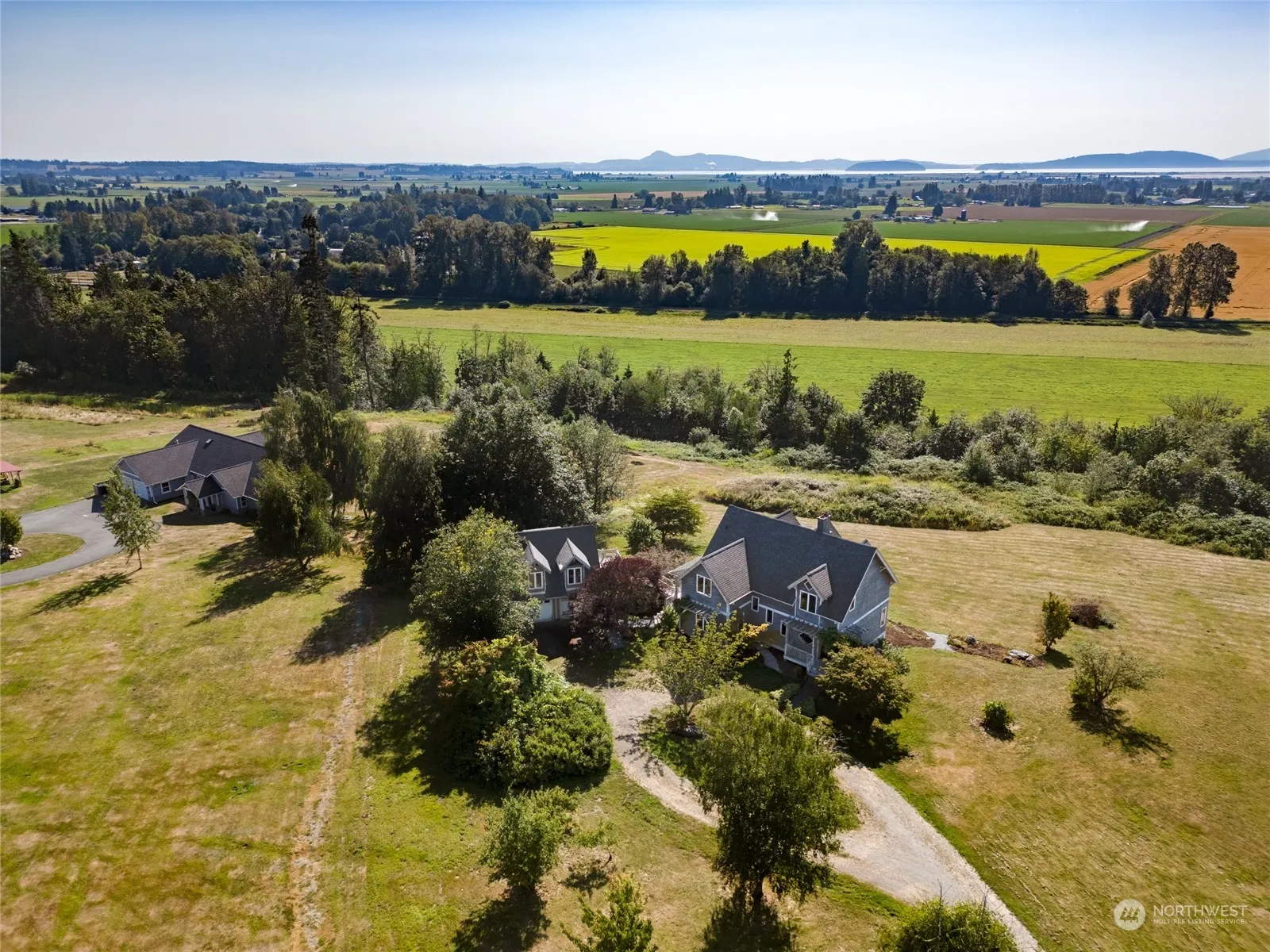 Amazing Panoramic Views of the Salish Sea from the Olympics to Canadian Mountains & San Juan Islands in Between. Great opportunity to capture this incredible setting on desirable Island View Way. Take on this 2-story w/full basement + detached 1bd studio & make it your own. Needing some finishing up from a solid start, begin your journey to where your vision takes you. Main house w/3 beds, 2 w/shared balcony(VIEWS) + loft, office & room for more. Stained concrete floors, open Schist Stone fireplaces(main & lower), wrap around deck, French doors on main & lower + 2 Dutch doors. Radiant heat throughout w/lower mechanical room w/boiler & water treatment system. Endless possibilities w/large unfinished basement w/more stellar views.