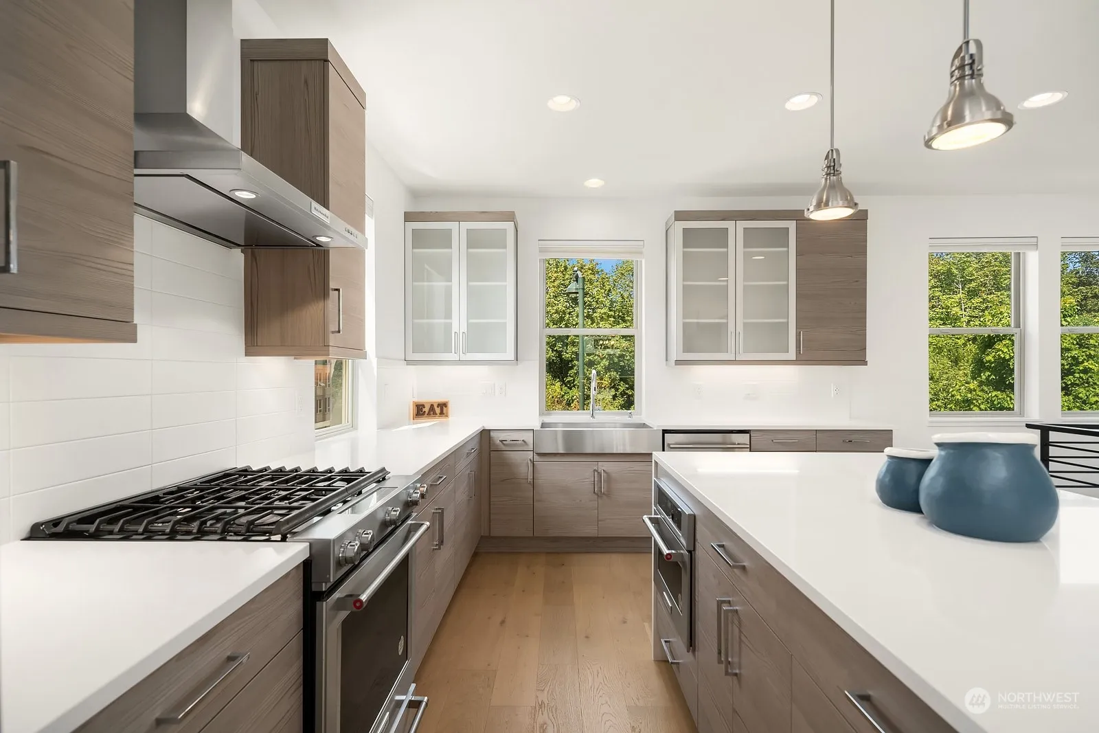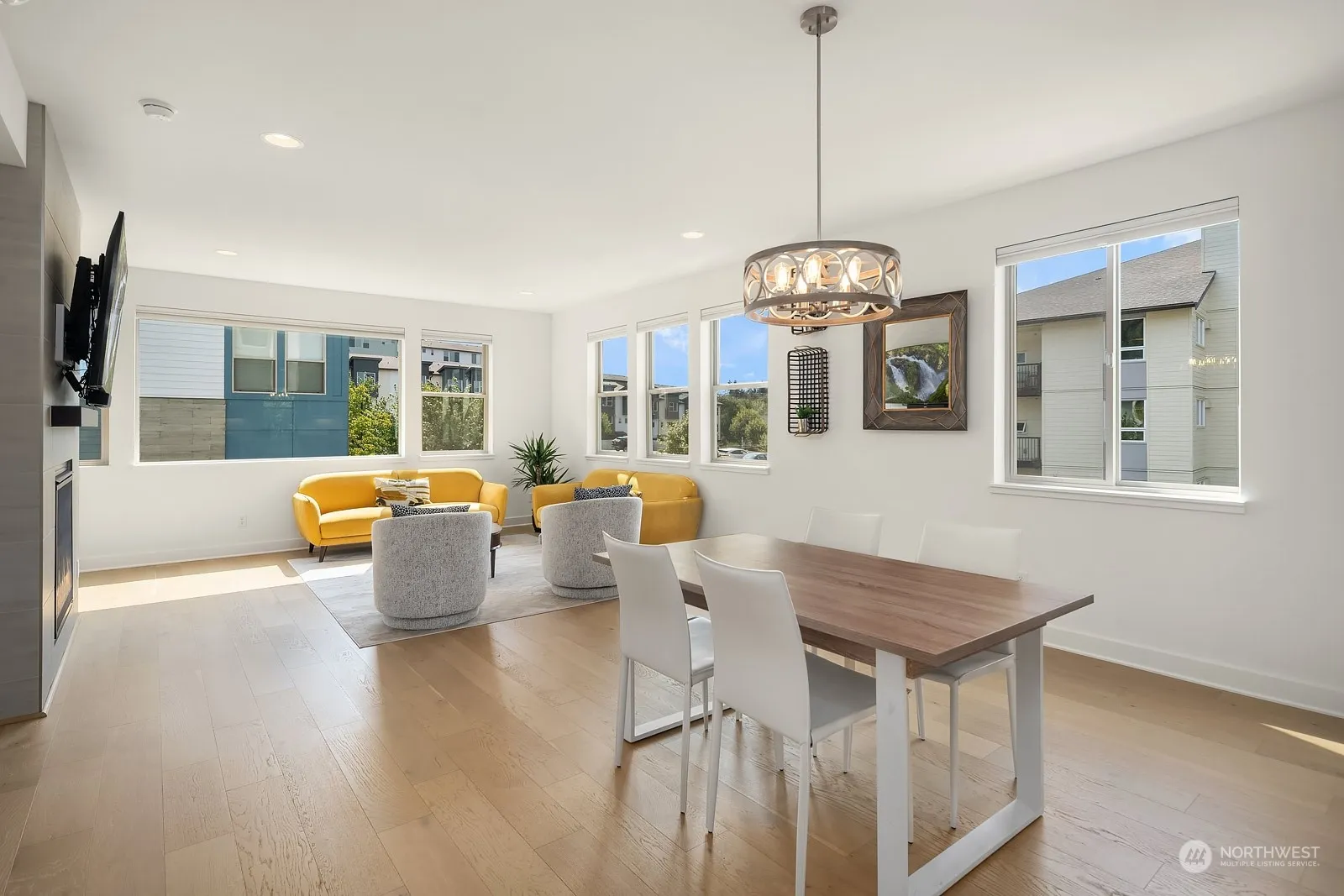 Welcome to Aldea at Newcastle Commons! Almost new 4bed/3bath end-unit townhome with and excellent floor plan. Spacious great room concept with soaring 9′ ceilings and oversized windows offering tons of natural light. The gourmet kitchen with territorial views is equipped with quartz countertops, stainless steel appliances. Spacious primary suite with office nook, barn door to the 3/4 bath and walk-in closet. 2 secondary bedrooms have access to a full tiled bath. The main floor ensuite bedroom is perfect for guests or use as a home office or gym. Custom lighting throughout. Huge 2 car garage with lots of storage & EV outlet. Resort level amenities; outdoor pool, fitness center trails and parks. Fantastic location, walk to restaurants.