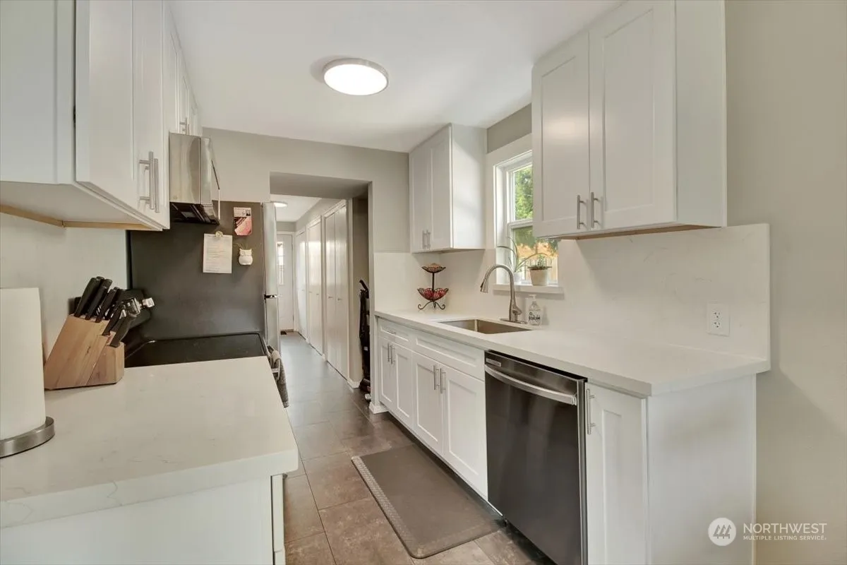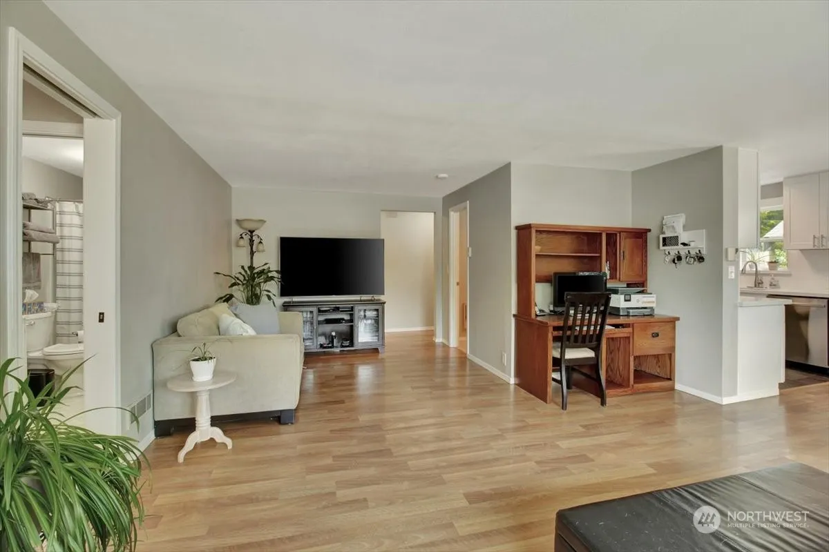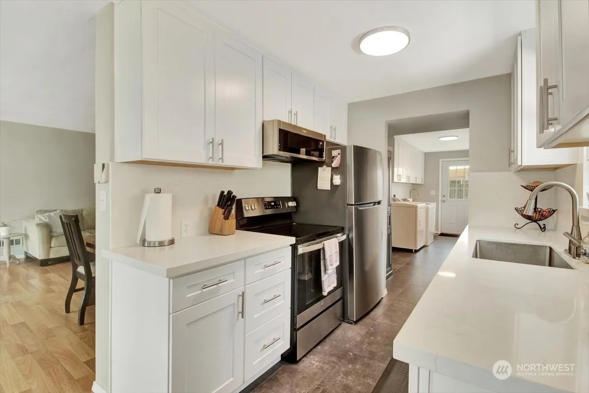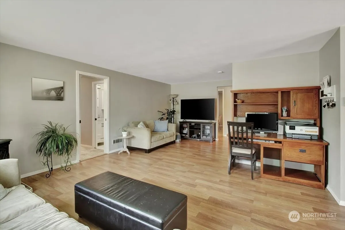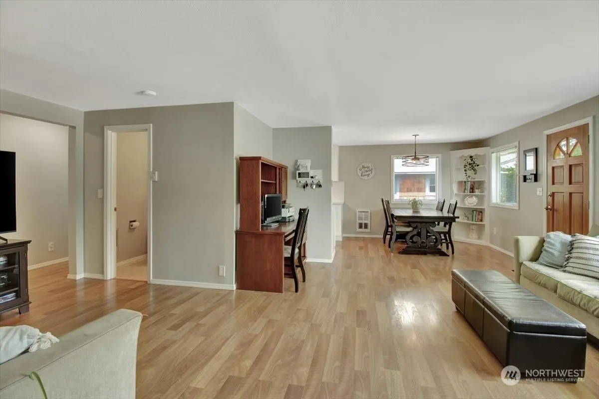 Welcome to your cozy rambler, a beautifully renovated home that perfectly combines comfort and style! This inviting residence features stunning hardwood floors throughout, lending welcoming ambiance to every room. The modern white kitchen cabinets & quarts countertops provide a fresh and bright backdrop for culinary adventures. New roof, fresh paint, updated bathrooms, recent carpet, all new kitchen appliances, new washer and dryer & heat pump for A/C on those hot days. One of the standout features of this property is the large garage, offering space for your vehicles and storage. The fully fenced yard provides a serene outdoor retreat for relaxation.