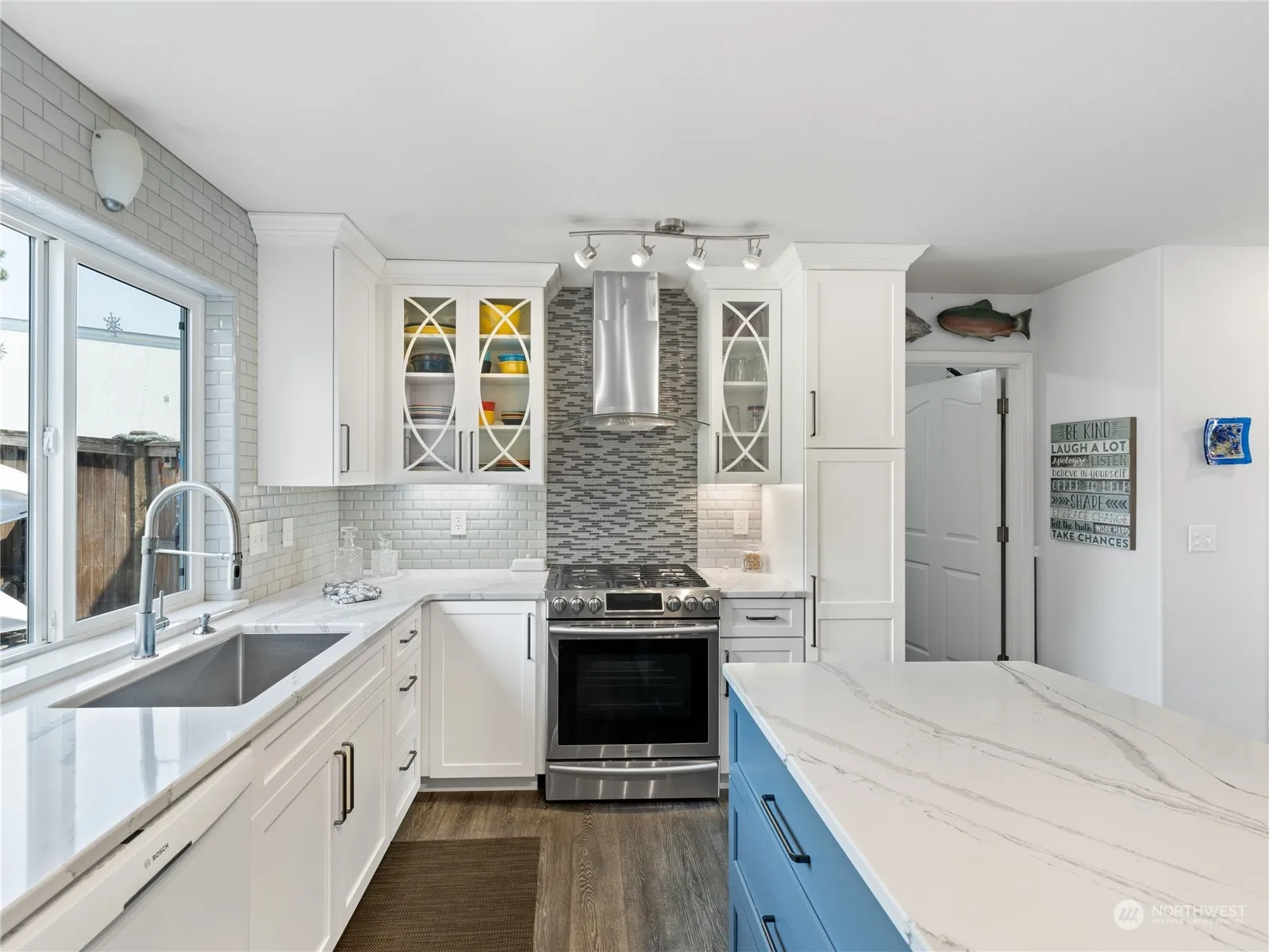 This charming home, conveniently located near town and ferries, offers a blend of comfort and style. The beautifully updated kitchen features elegant white cabinetry, a sleek tile backsplash, and durable quartz countertops, perfect for culinary adventures. A large mudroom area provides practicality, while the primary bedroom boasts vaulted ceilings and a private balcony for serene relaxation. Upstairs, a spacious bonus room offers versatile use. The fenced backyard, complete with terraced decks and built-in garden space, invites outdoor enjoyment. Located across from the baseball fields and Kiwanis Meadows, with the Anacortes trailhead just up the road, this home is ideally situated for active living.