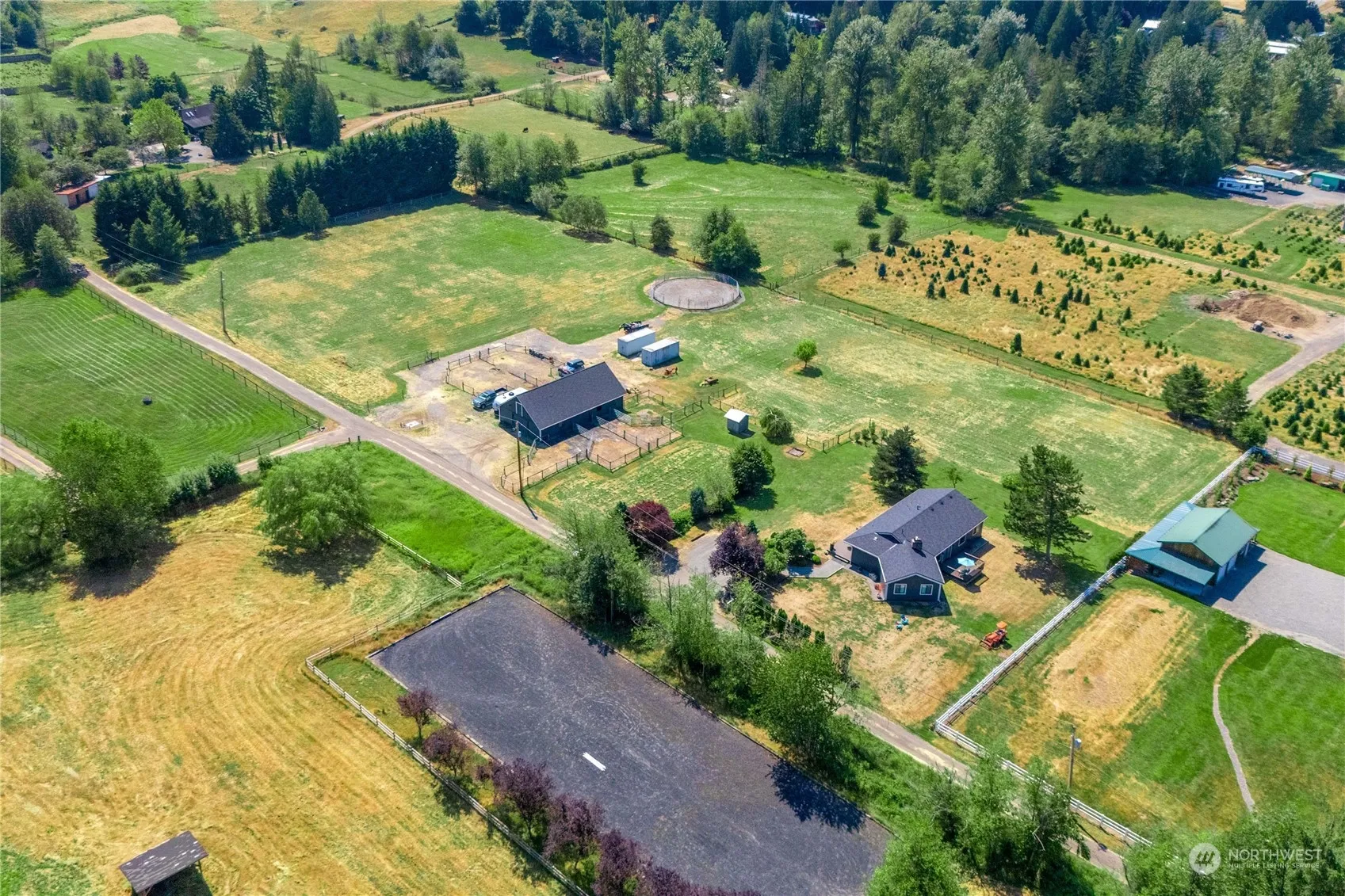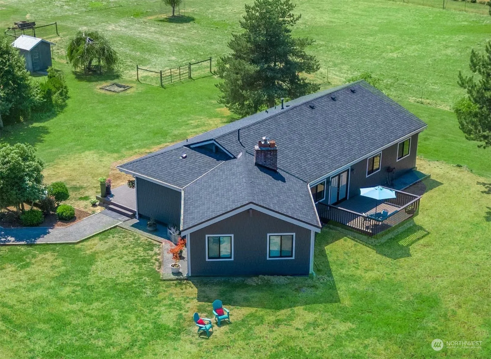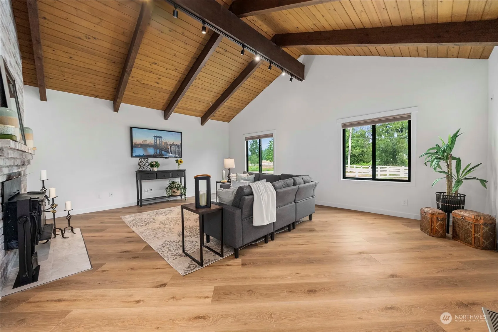 Beautifully remodeled view rambler on 5 acres in Historic Hobart. New roof, siding, trim, fixtures, appliances & much more! Vaulted cedar ceilings, exposed beams, custom fixtures, durable laminate hardwoods, formal & informal spaces. Cozy wood burning insert backed by floor to ceiling white washed brick. New Furnace and mini Splits. All new doors, trim & hardware. Spacious open kitchen, new cabinetry w/ soft close hinges, large chefs island, beautiful quartz countertops & backsplash. New quality Stainless appliances. Large primary w/ private ensuite & walk in closet. Good sized secondary rooms. Abundant storage. New Trex deck front & back. 30×60- 7 stall barn, Outdoor wash rack, 60′ round pen, fruit trees, garden space & hay pastures.