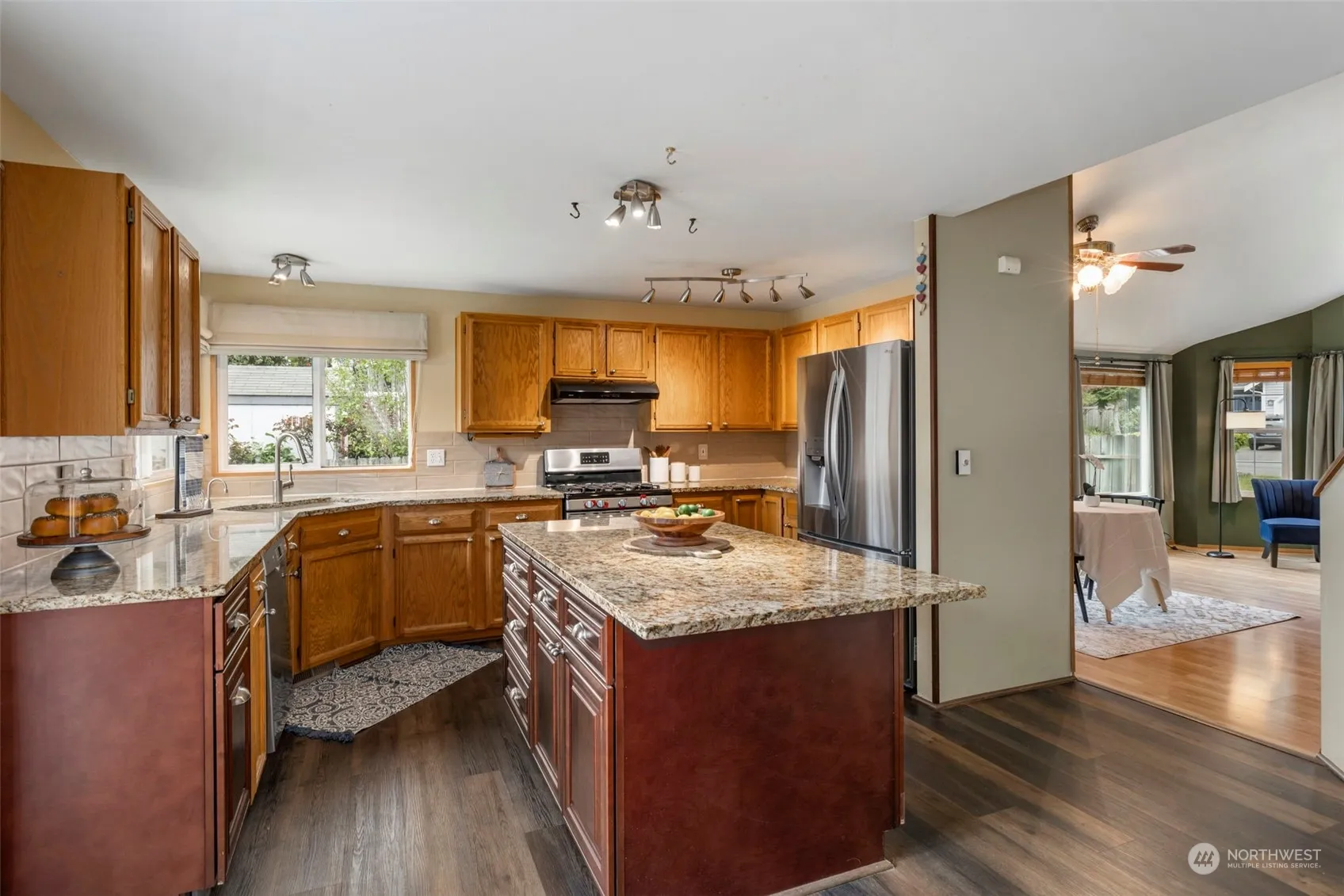 Welcome to this meticulously cared for 3 bedroom 2.5 bath home, that offers the perfect blend of comfort, convenience, and style. Enjoy the privacy of a main floor primary bedroom, featuring a 4 piece bath which includes a Kohler walk in tub & walk in closet. Upstairs offers the other 2 bedrooms & full bath. The kitchen is a generous size giving you plenty of space to entertain, which opens up to the family room and includes a cozy gas fireplace. Step outside to your backyard oasis, the expansive fenced backyard is perfect for enjoying summer nights, offering an automatic sunscreen to help on hot summer days to host backyard BBQ, or simply relaxing.