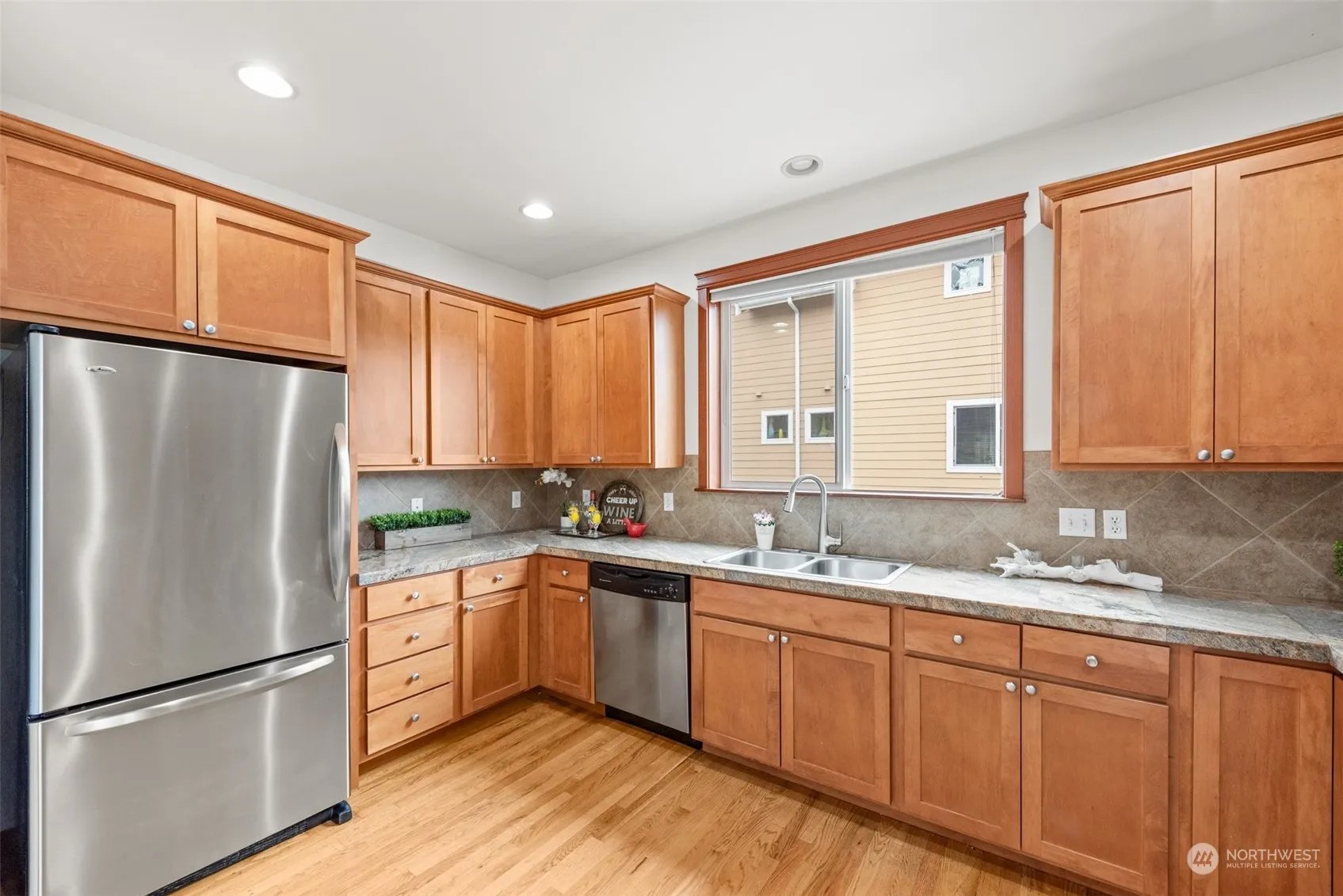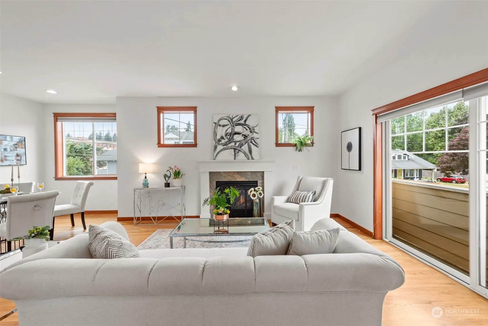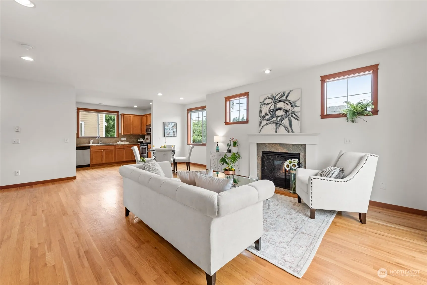 Discover this beautiful townhome featuring a 2-car garage and an expansive floorplan. The freshly painted interior welcomes you into an entry level that offers a cozy bedroom and a convenient half bath. Ascend to a bright, open living space with a fireplace, dining area, and an open concept kitchen adorned with beautiful hardwood floors. The top floor impresses with vaulted ceilings, another bedroom and a full bath, and a luxurious primary suite with an en suite bathroom featuring double sinks. Perfectly located near shopping centers, cafes, Jackson Park Golf Course, parks, and trails. Quick access to HWY 522, I-5, and the new light rail station. No HOA!