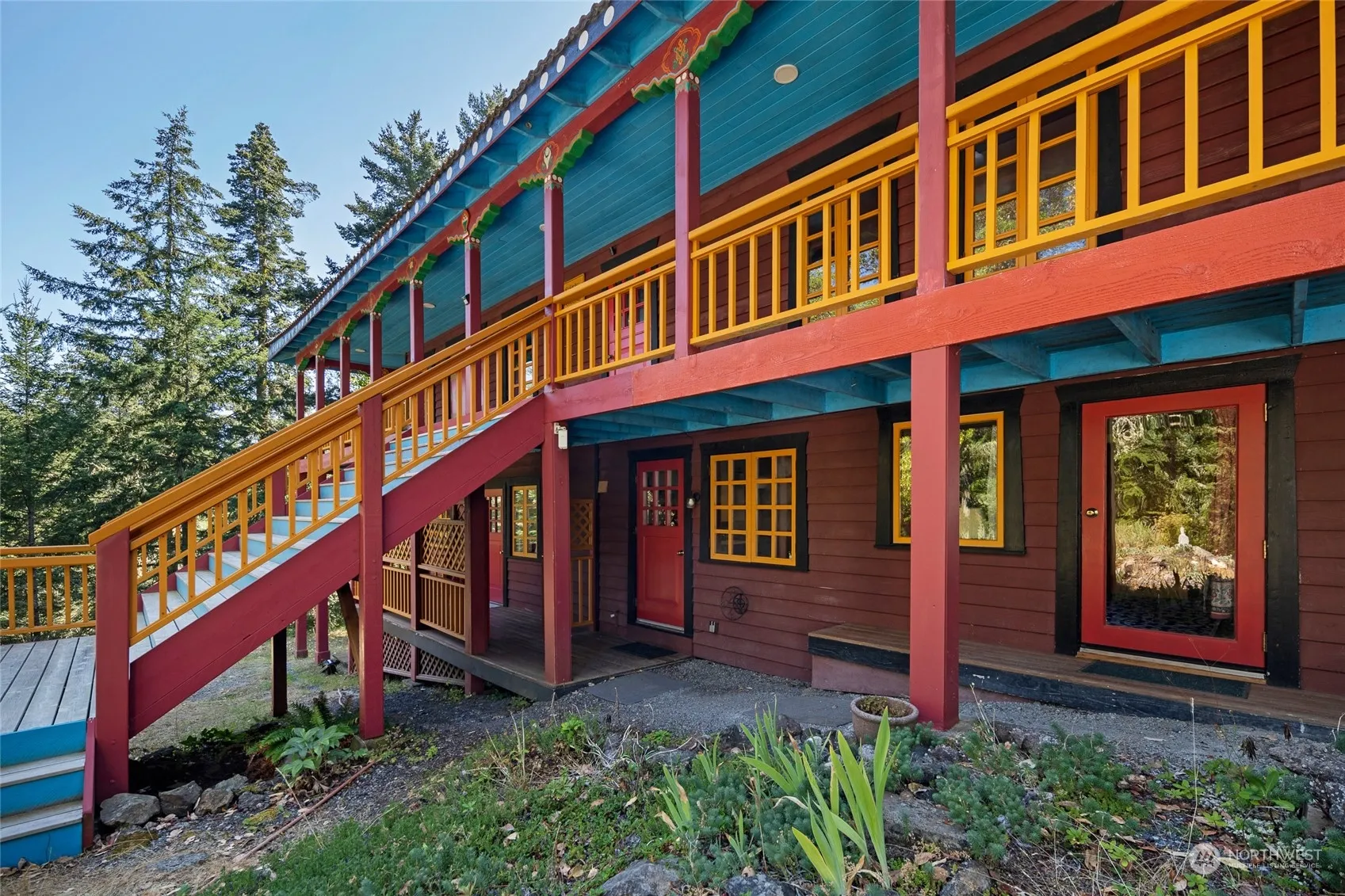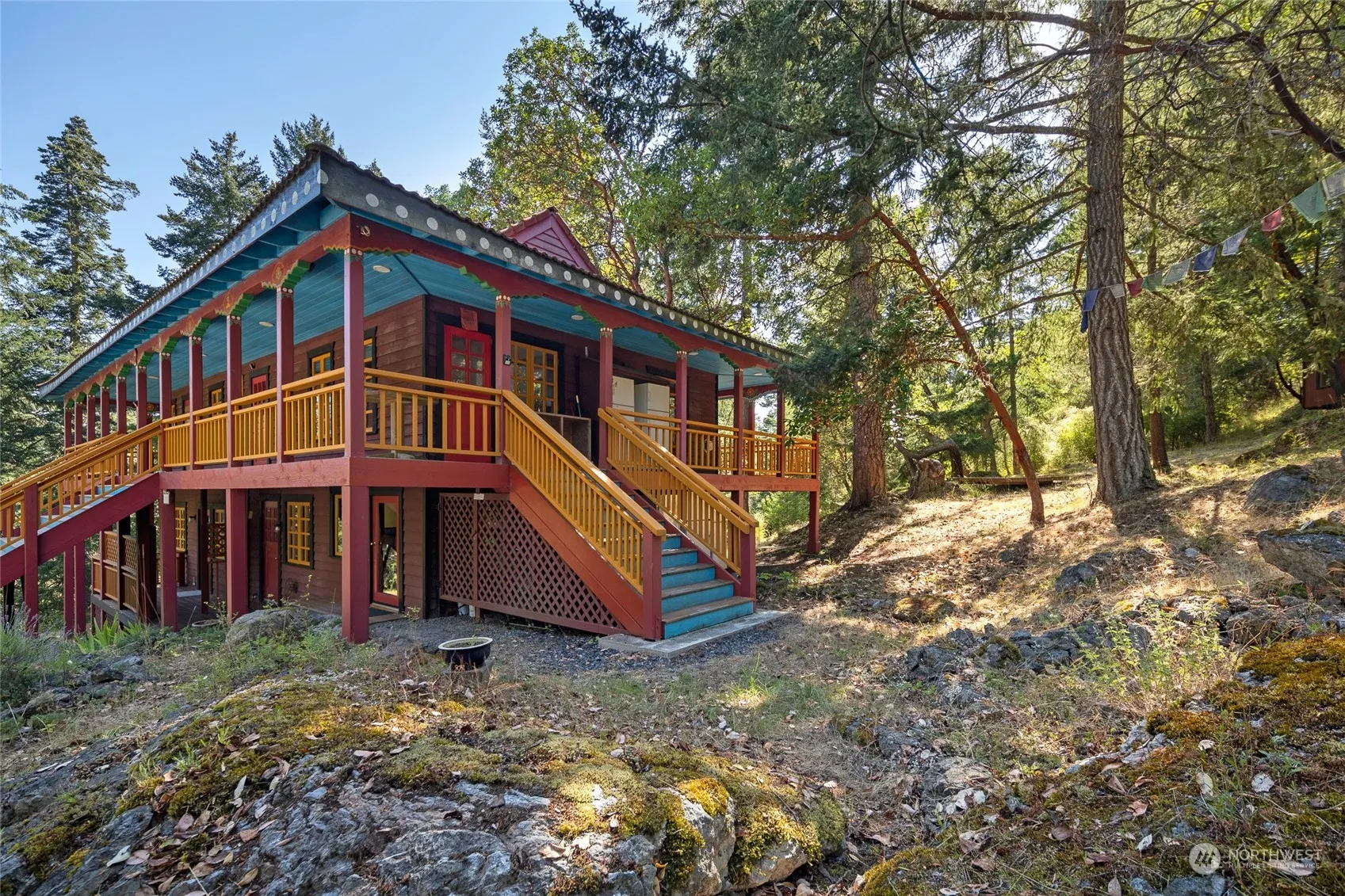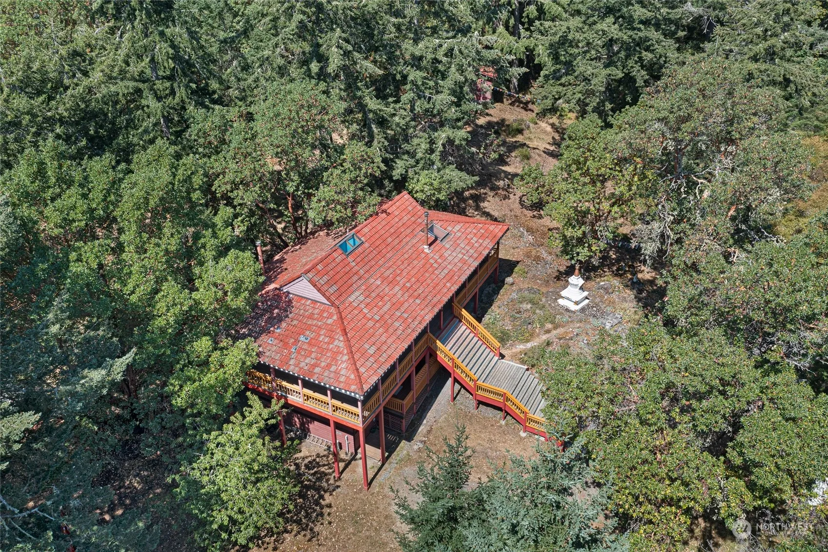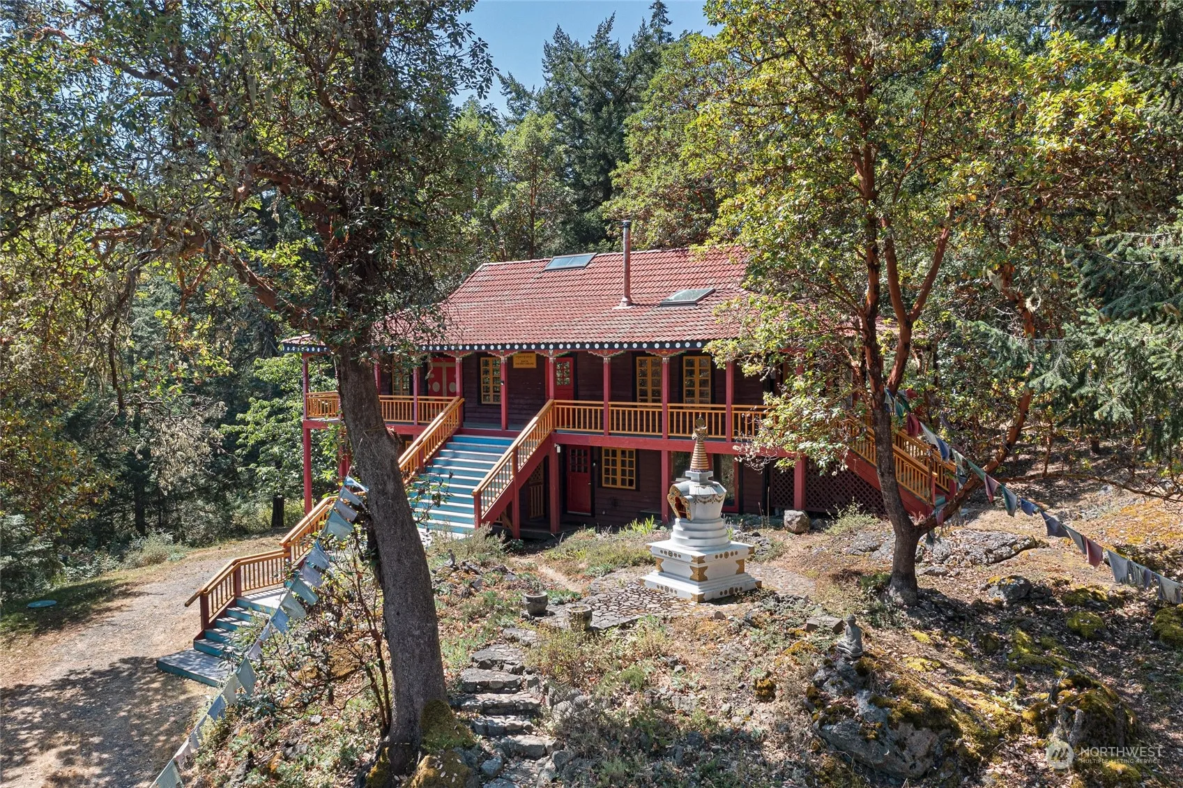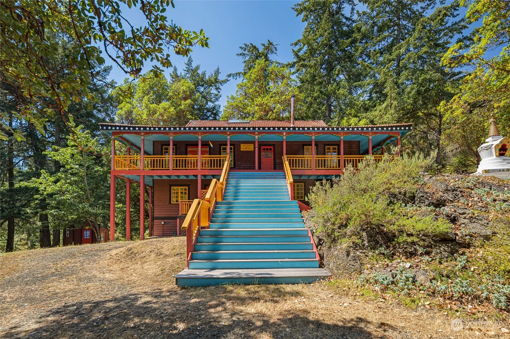 Tranquility abounds on this private 20-acre residential estate surrounded by nature, magnificent madrones & large firs. Built by Ravenhill construction, the main house is 2210 sq. ft. Its upper level has 2 bedrooms, 1 full bathroom, kitchen & living room with large windows & a skylight. The lower level has a separate apartment with a bedroom, ¾ bathroom & kitchen. It also has a bonus room with ¾ bathroom & washer/dryer space. A covered, wraparound porch allows you to enjoy the scenery all day. Outbuildings include an art studio, sleeping cabins, two yurts, tent platforms, a geodesic greenhouse & a garden. Previously used as a Buddhist retreat center, the location is easily adaptable. Don’t miss out on this serene, beautiful property!
