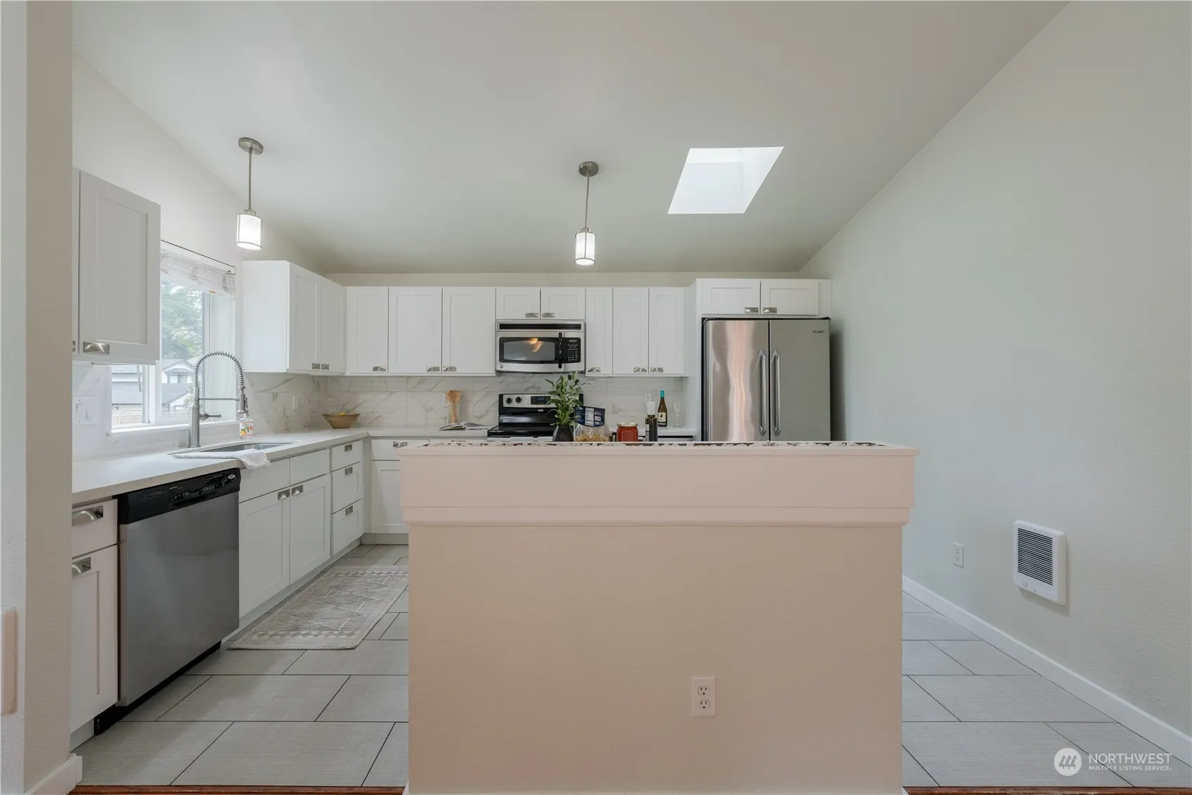 Elegantly updated home featuring 3 bedrooms, 1.75 baths, fresh interior paint, and stylish design accents throughout. The bright, open floor plan is enhanced by vaulted ceilings, a skylight, and beautiful hardwood floors. The modern kitchen boasts solid wood cabinets, an island/breakfast bar, quartz countertops, and stainless steel appliances, including a wine fridge. The spacious family room opens to a patio and a fully fenced backyard. This home also includes a two-car garage and is located on a quiet, no through-traffic street, yet close to shopping, less than ten mins to Chambers Bay & Cirque Park, and major thoroughfares. Plus, it’s in the desirable University Place School District!