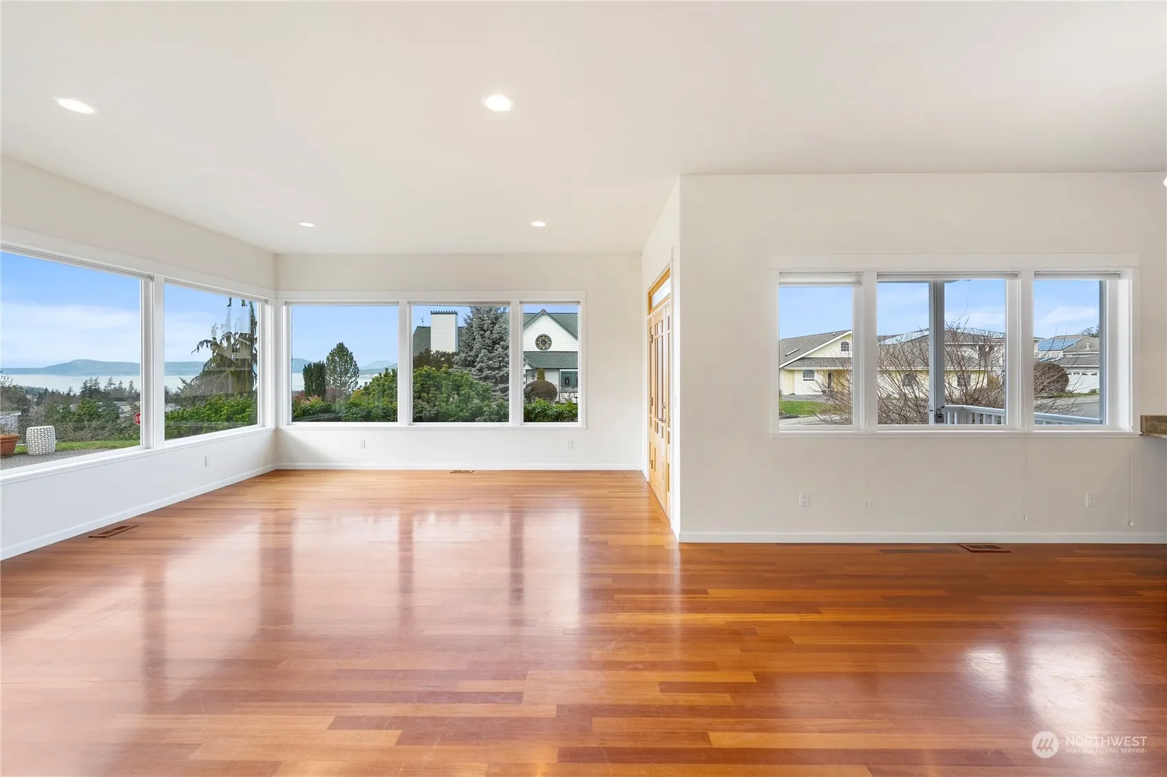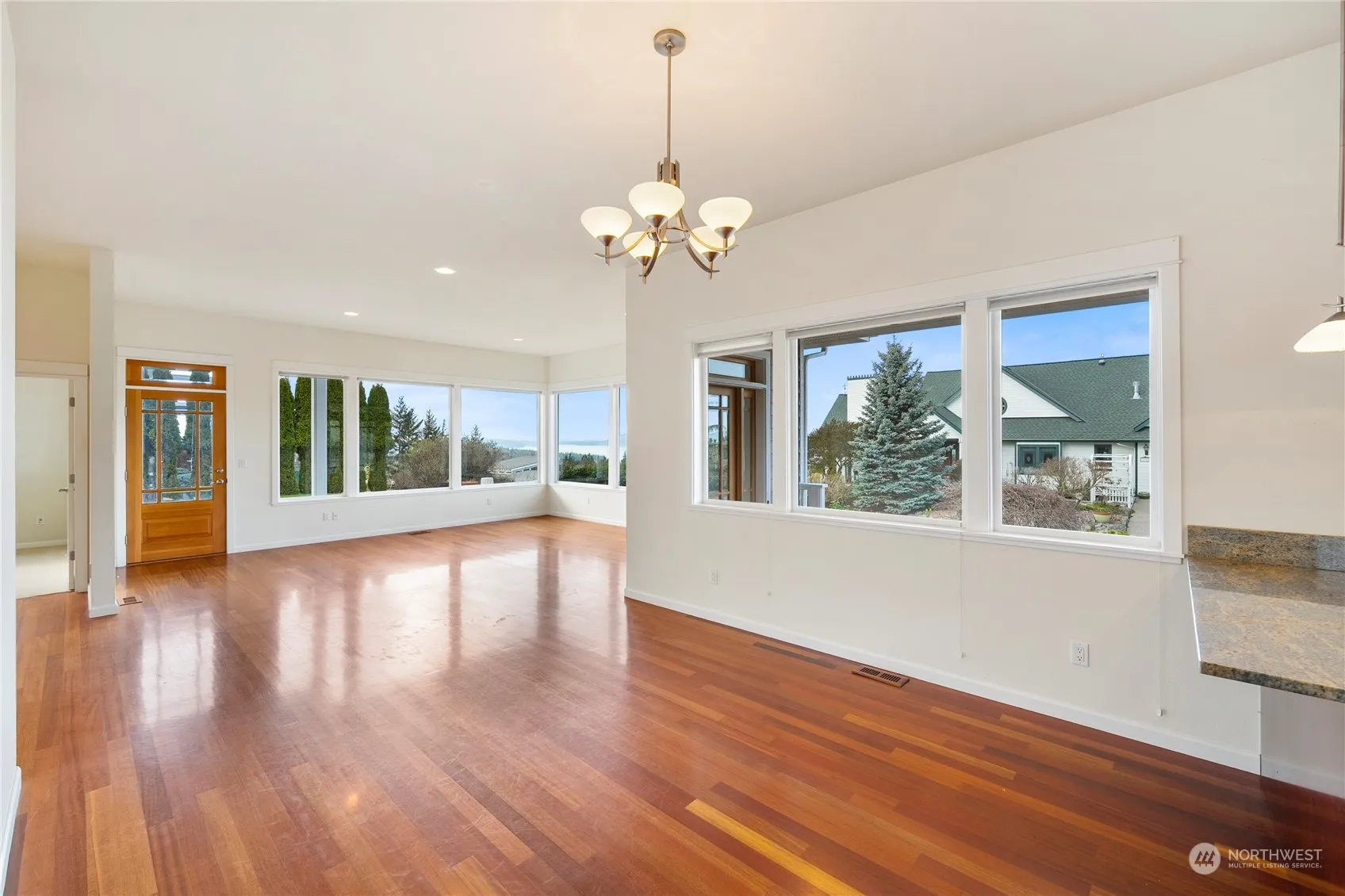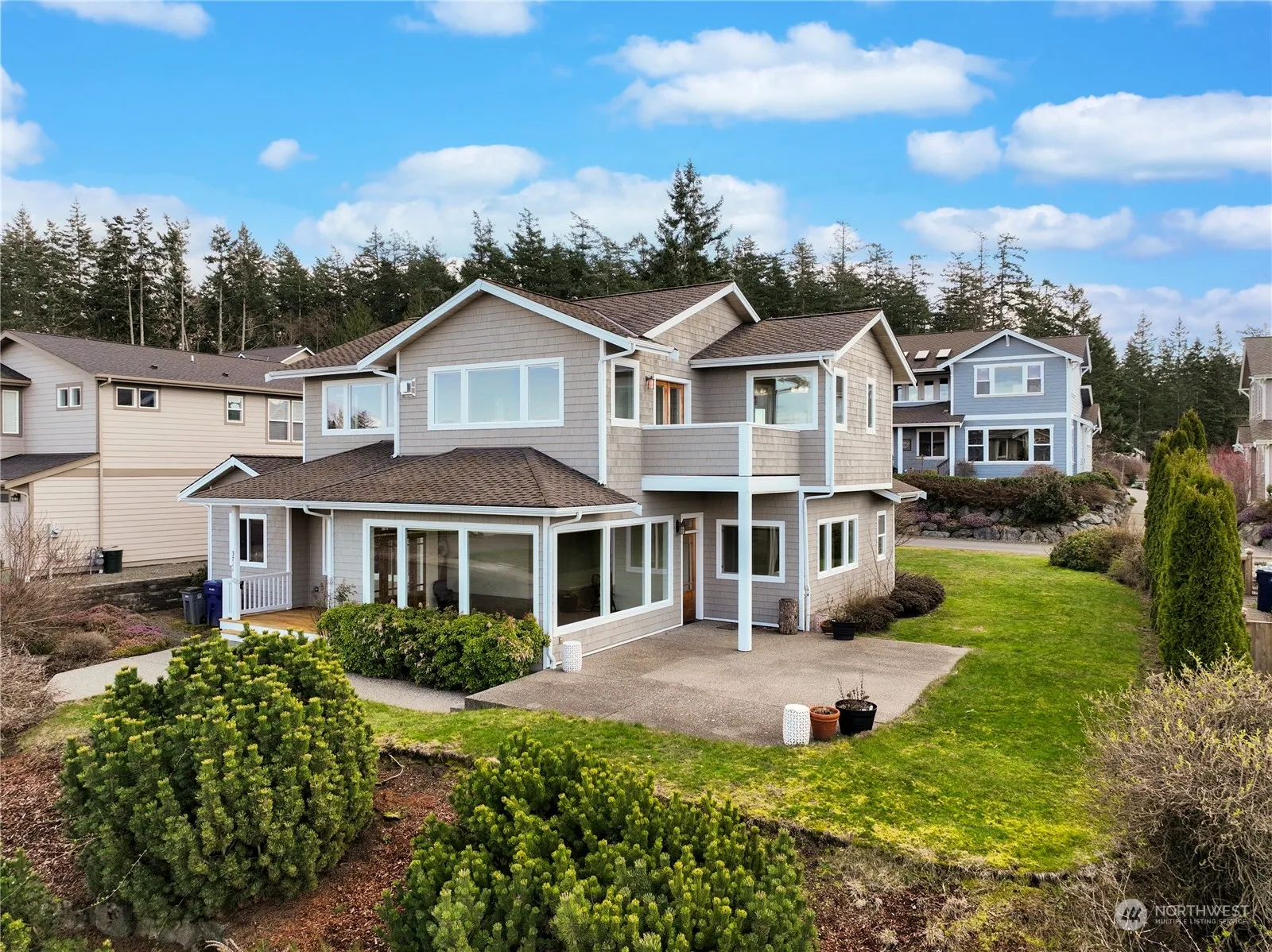 Welcome to your dream home with stunning water and island views! This exquisite property features Brazilian hardwood floors and picture windows throughout the living, dining, and kitchen areas, flooding the space with natural light. The kitchen boasts granite countertops and cherry cabinets, perfect for culinary adventures. Enjoy the luxury of two primary bedrooms, each offering a private retreat. The main floor bedroom ensures convenience, while the second-floor suite features a sitting room, private deck, soaking tub, separate shower, and walk-in closet. Entertain with ease on the outdoor patio, ideal for grilling and gatherings. This home is a true gem!
