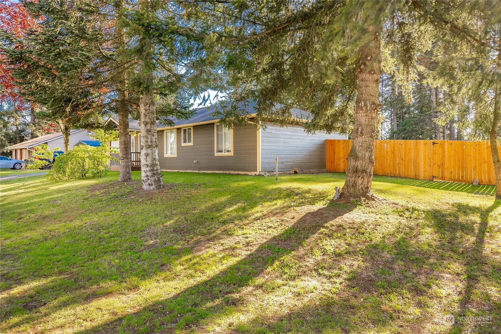 Discover this fully remodeled rambler-style gem, boasting 3 bedrooms and 2.5 bathrooms. Nestled on a shy 12,000+ sq ft corner lot, this rare find offers a fully fenced yard, garage with storage, carport, and outbuilding. Enjoy the bounty of fruit trees, garden space, a covered entrance, and a covered patio perfect for year-round relaxation. Step inside to a spacious 20×23 great room featuring a cozy wood-burning fireplace, alongside a brand-new kitchen and appliances. The primary suite offers two separate closets and a full bathroom, complemented by new carpets in all bedrooms. Extensive renovations completed a year ago include a new roof, attic and crawl space insulation, new floors, upgraded bathroom features, and fresh paint in & out.