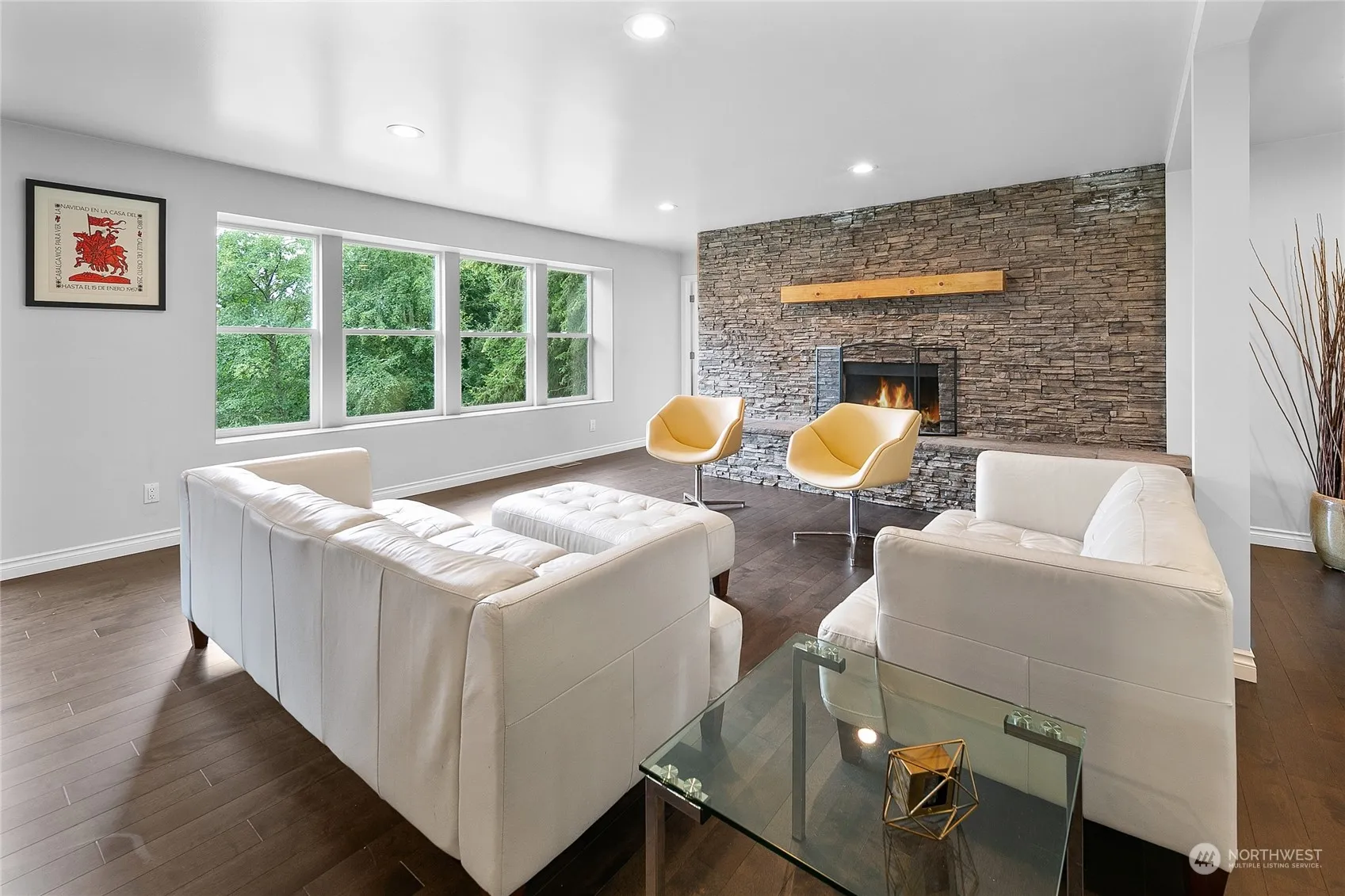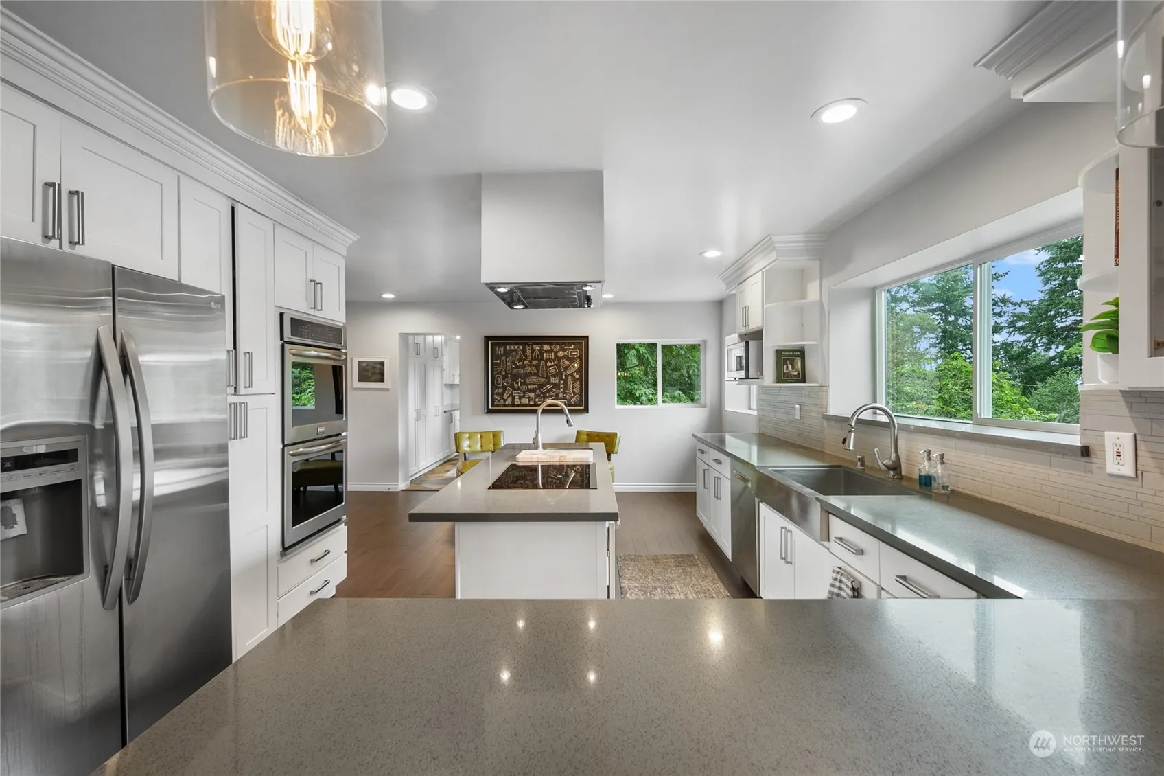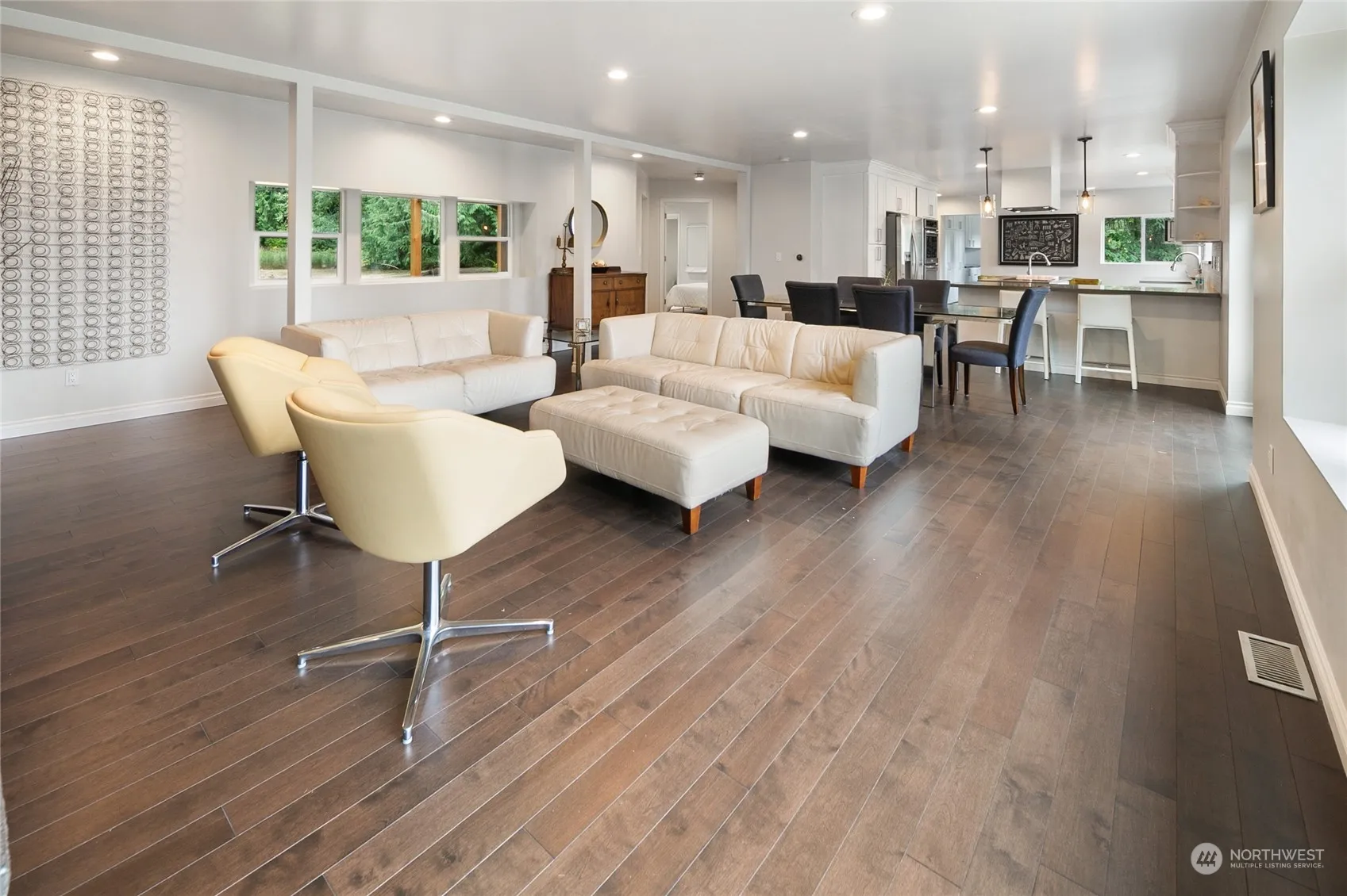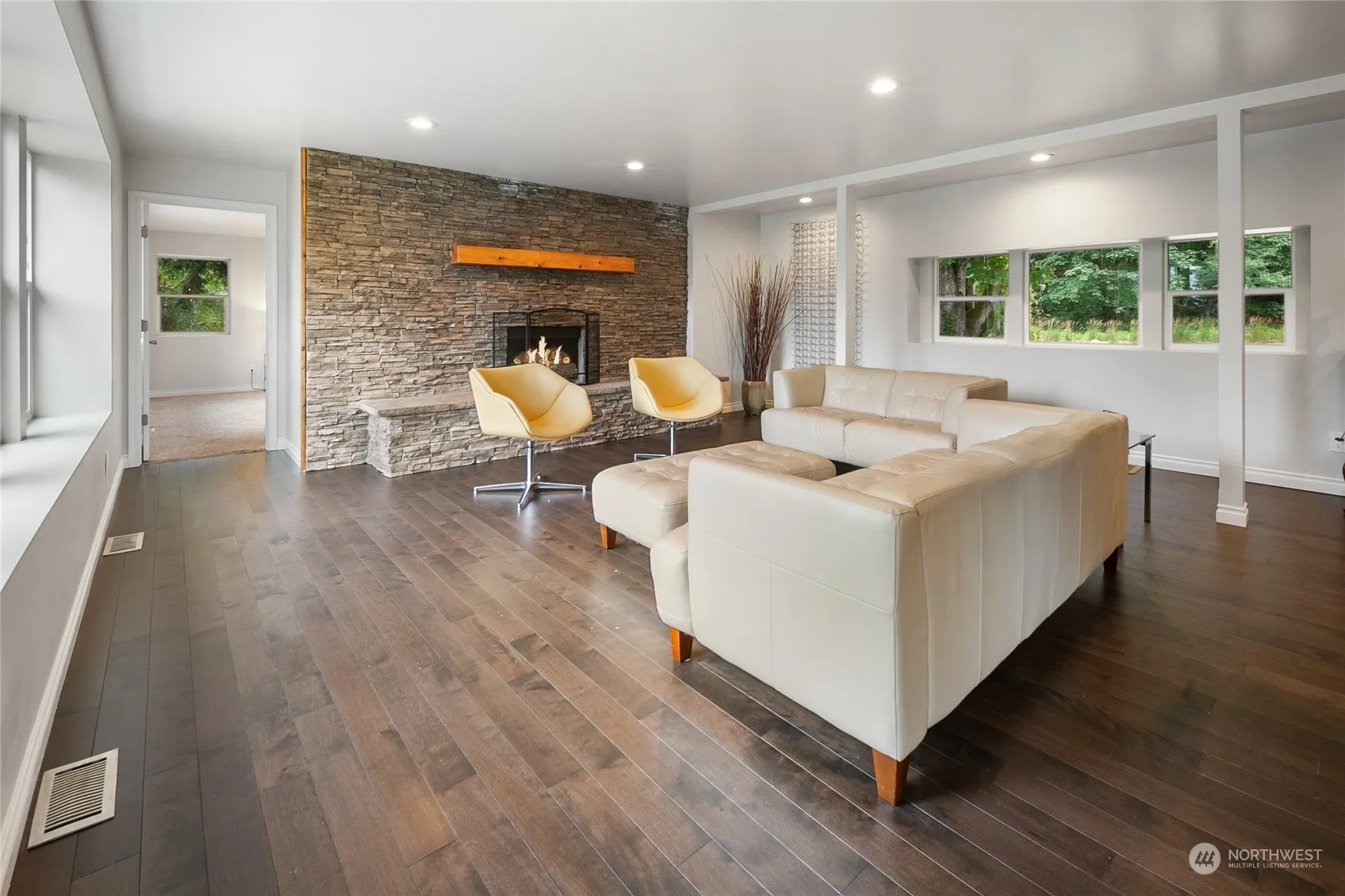 Spacious mid century home sits tucked away on two plus acres of rolling pasture & mature fruit orchard. Gorgeous whole house renovation makes this home feel brand new! New hard wood floors upstairs & carpets downstairs. Newer stainless steel appliances and cook top, large open format kitchen/living room + breakfast bar, cooking island, & access to back deck for dining al fresco. Large laundry room! Primary bed features cozy fireplace w/ jetted tub and stone floor shower. Downstairs features a den/movie or game room as well as two full bedrooms or flex office space/home gym. Large cedar sauna invokes the sense of hygge through the seasons! Outdoor fire pit for bon fires + RV pad w/ full hook ups. Close to Seattle ferry, farm stands, & town!