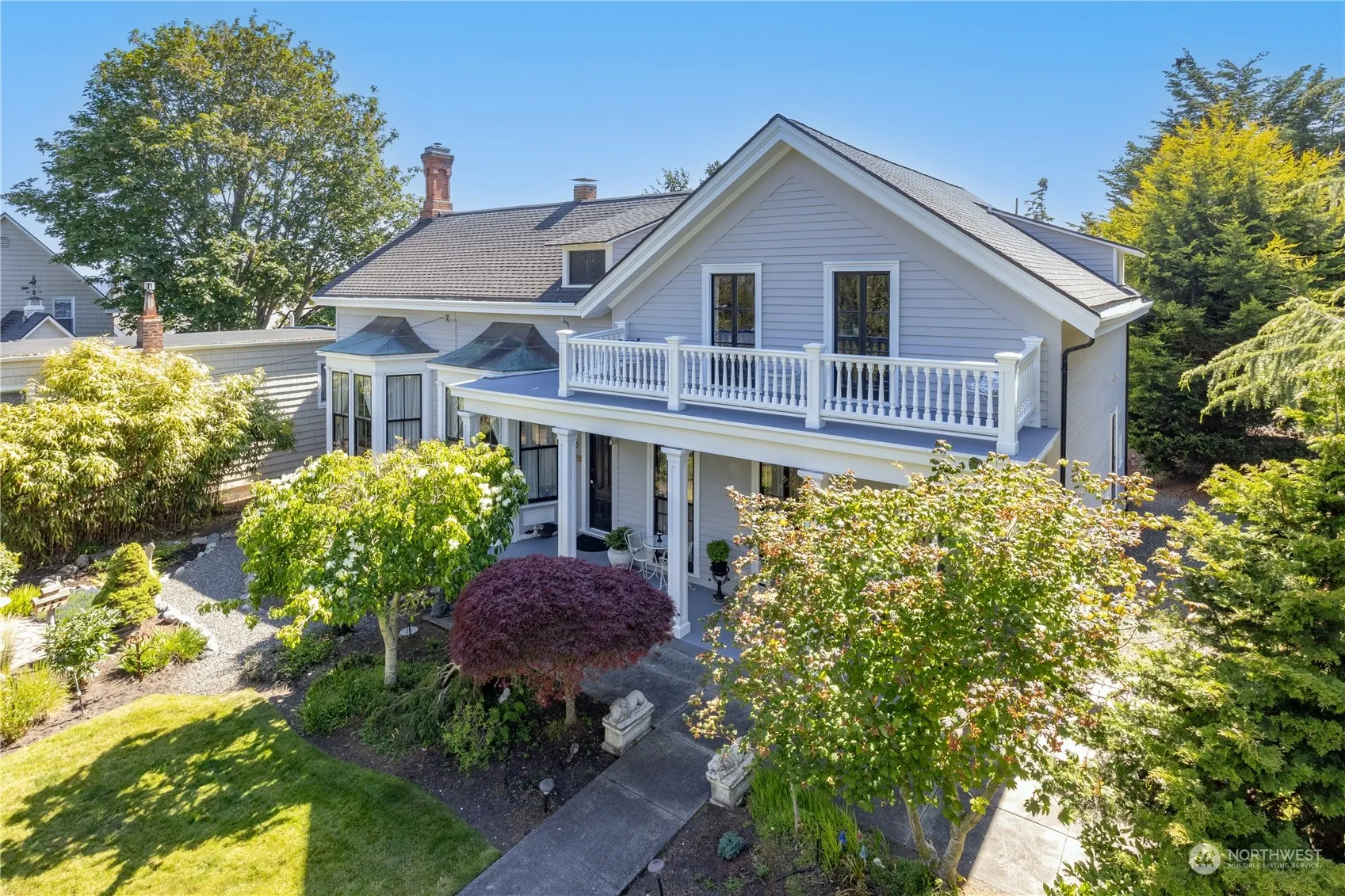 HISTORIC UPTOWN HOME. Capt. Tibbal’s home, built in 1860, is one of PT’s oldest homes. This home has been lovingly restored with respect for materials & authenticity. Super location- easy access to Farmer’s Market, shops, library, movies. Main floor features hardwood floors, high ceilings, 2 large living rooms, DR, kitchen, pantry, 1/2 bath & W/D by the back door. Upstairs 3BR, full bath, access to attic storage & beautiful view balcony. Large detached garage built in 2006 (2nd floor possible?) RV pad & shed. Large lot is 15,070 sq ft. Exterior siding & trim has been stripped down to bare wood. All wood is clear cedar, no knots, simply amazing. Lovely landscaping with mature trees, fountains, lions, partially fenced. Is this house for you?