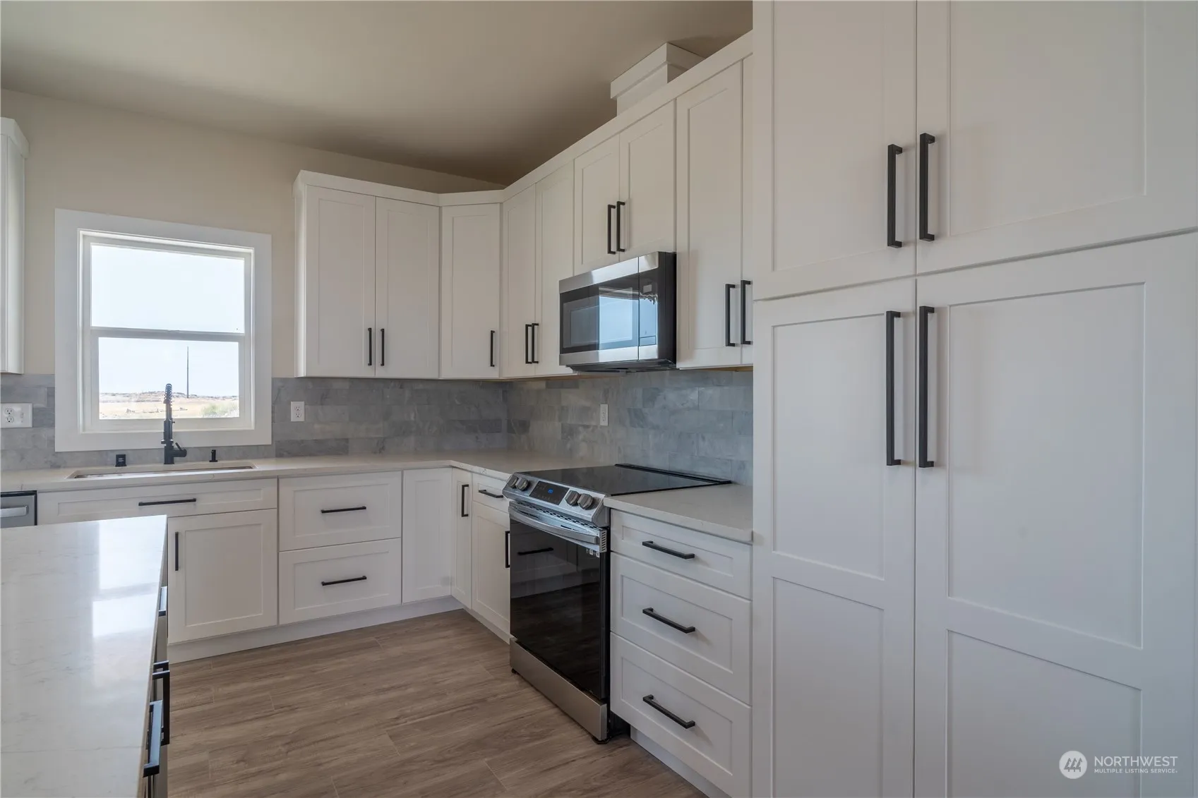 This stunning new home is situated in a well-kept neighborhood and boasts a generous lot size of .251 acres. The expansive kitchen is outfitted with quartz countertops, a waterfall island, marble backsplash, floating shelves, and a smart oven. Both bathrooms are designed with tiled floors and showers. The home features covered patios at the front and back, complete with tongue and groove ceilings and recessed lighting, perfect for outdoor living, and includes a hot-tub power outlet on the rear patio. Additionally, the property offers an oversized garage measuring 27′.6″x22′, RV parking with a 50-amp power hookup, and an underground sprinkler system for the front lawn, all complemented by excellent water pressure.