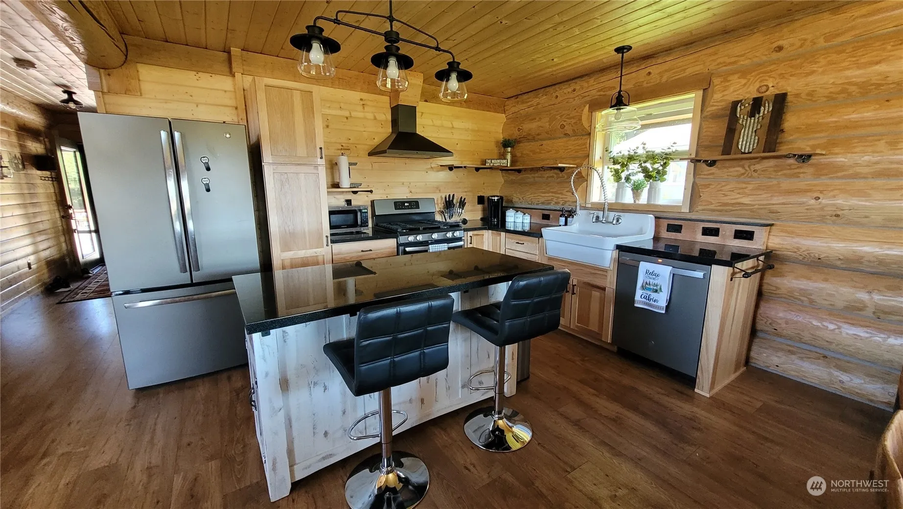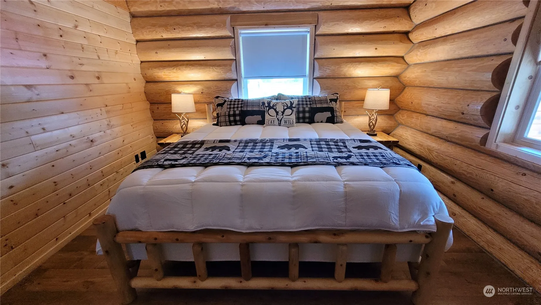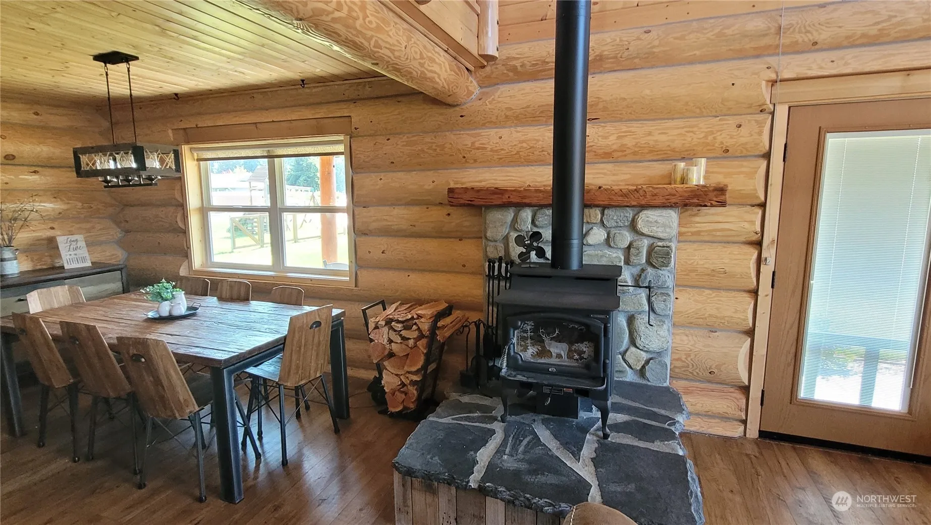 Custom built log home with breathtaking Olympic Mountain and sunset views nestled in a peaceful neighborhood. From the soaring 2 story living area with wood burning stove to the huge loft space + vaulted ceilings throughout the upper level, this home lives larger than its square footage. Built in 2020, this home has all the appeal of a log home with all the modern features you want. The outdoor space leaves nothing to be desired with firepit, horseshoe pits, hot tub, green house, picnic tables and backs to a creek that you can hear babbling below. Must see detached garage that has been turned into an amazing game room with pool table, foosball, equipped with a pellet stove for heat. This home is being sold with ALL furnishings included!!