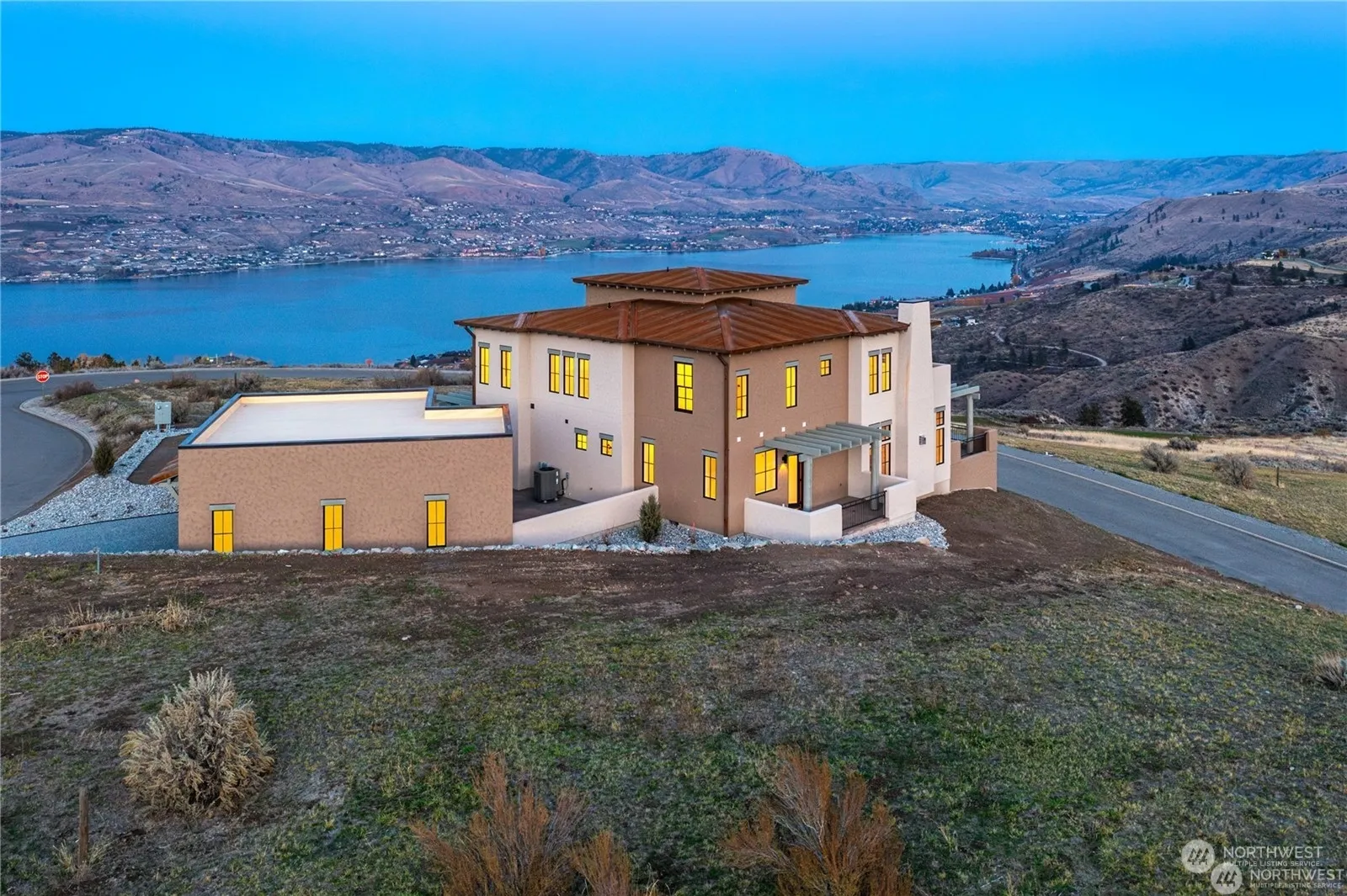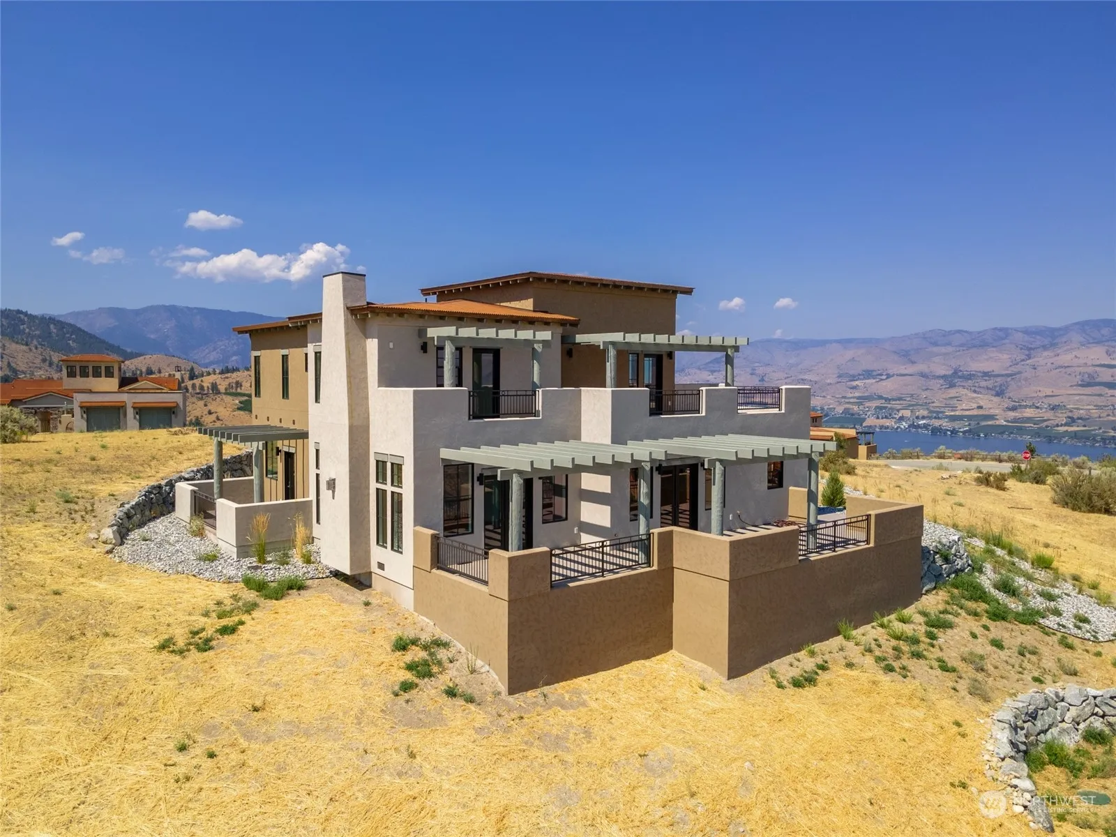 High quality new construction home at Bear Mt Ranch by Eider Construction! 3465sq 2-story home w/ huge views of Lake Chelan & surrounding territory. High end finishes & features throughout including 3 suites w/ walk-in tile showers & heated floors in primary, rocked propane fireplace, Jeld-Wen wood clad windows & french doors, 8′ solid core doors(except storage areas), quartz counters, upgraded KitchenAid appliances, corrugated steel roof, added insulation for soundproofing, wired for speakers/security, & more. Home lives nicely as a rambler & has a well-designed open concept floor plan + offers substantial flex space upstairs including family room w/ wet bar, den, & 2nd powder room. Over 1300sq of paver patio/deck space & shy 1000sq garage