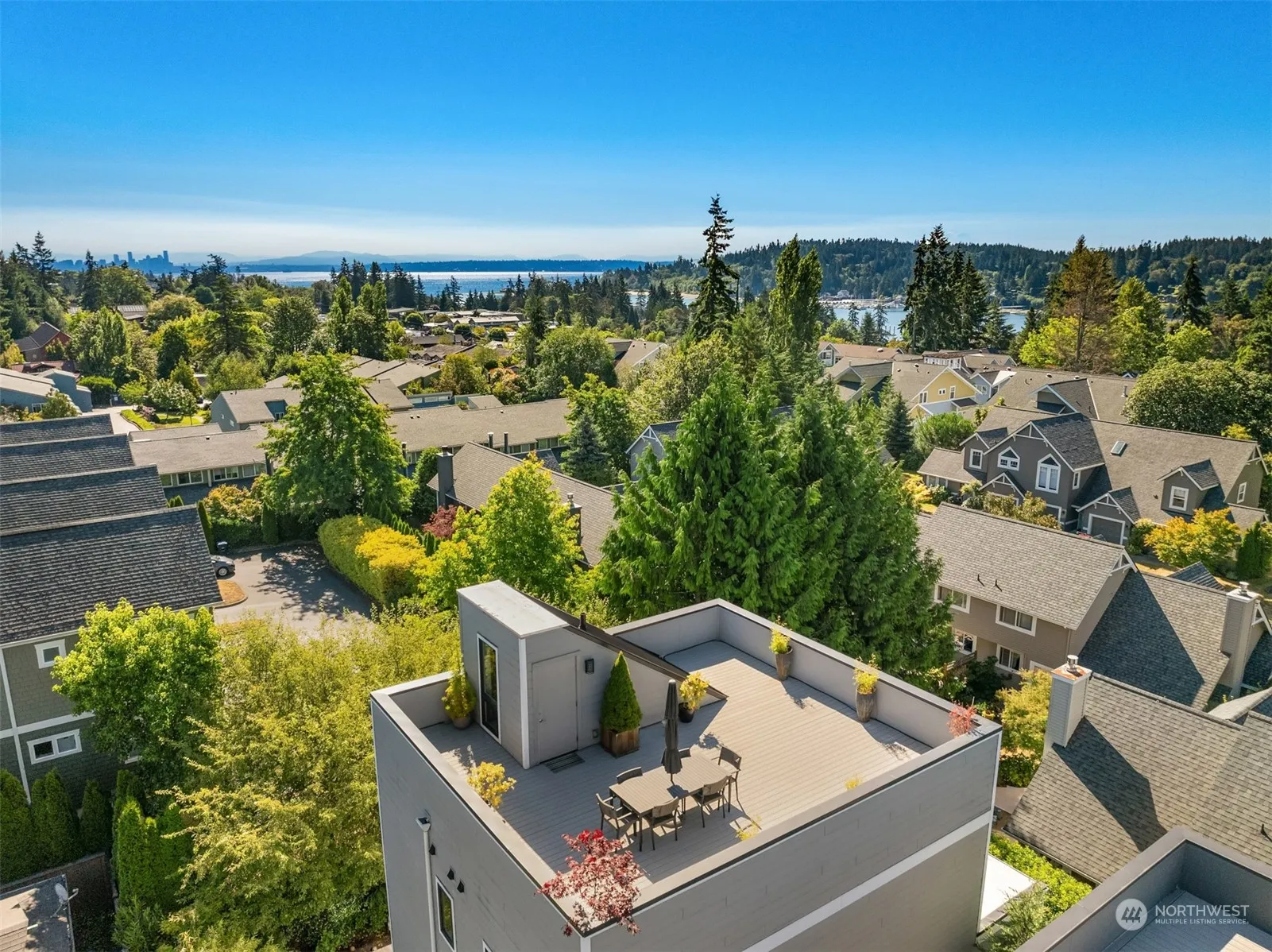 The BEST of in-town living near Winslow shopping, restaurants, parks, Marinas and Seattle Ferries! This stunning multi-level home with an elevator offers an ideal life-work balance floorplan. The office/3rd bedroom has a private entrance and a sunny rooftop terrace with panoramic views of Puget Sound and Seattle. Entertain in the sun or under the stars! How fun is that? Built in 2018, this home has wonderful amenities to include a 2-car garage, a Tesla charger, 9′ ceilings, spacious kitchen/living/dining great room, 2 ensuite Primary bedroom options, hardwood floors, NO homeowners dues and 4 exterior spaces for healthy added enjoyment and entertaining. (2 garden courtyards, a spacious deck off the living room and the rooftop terrace!).