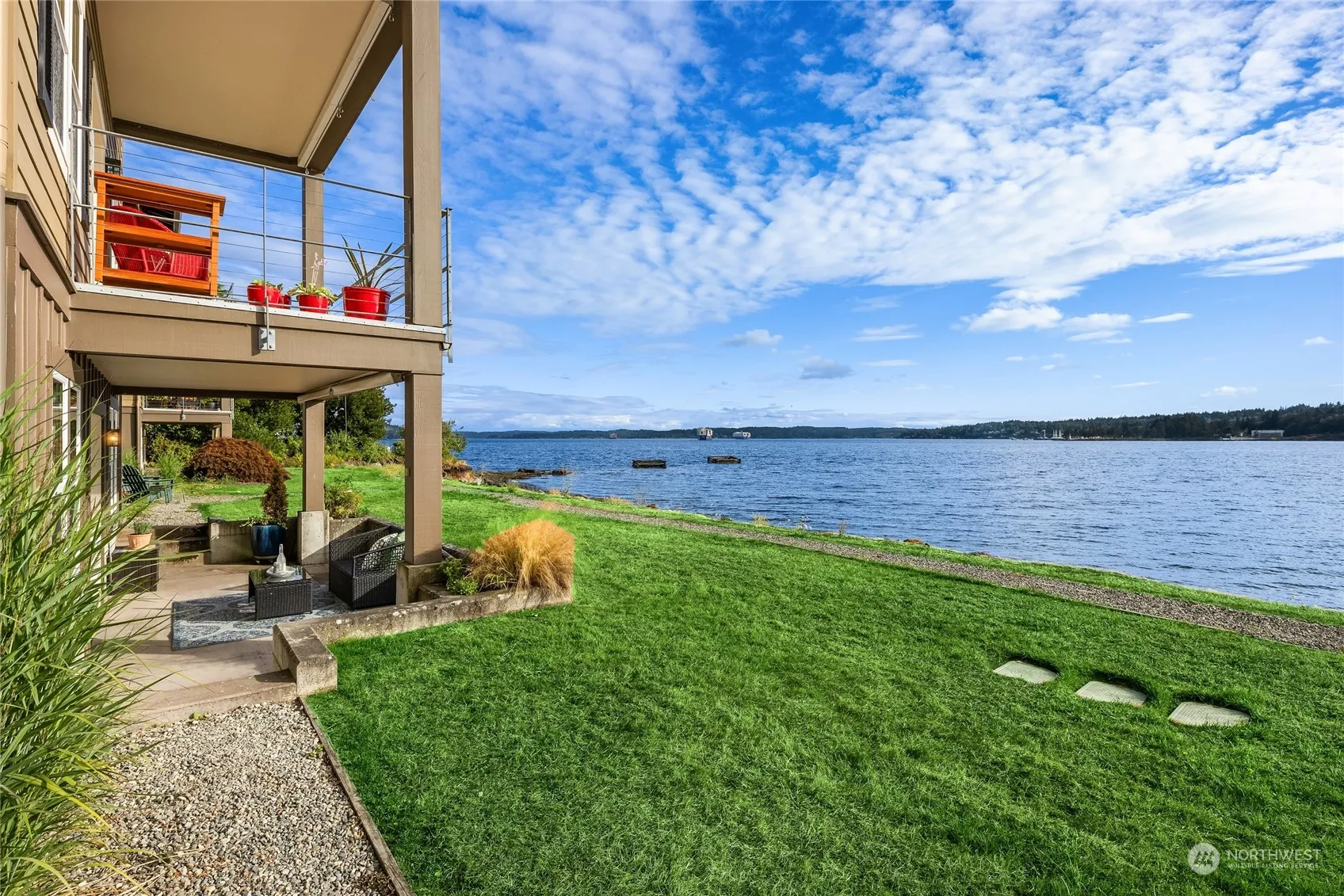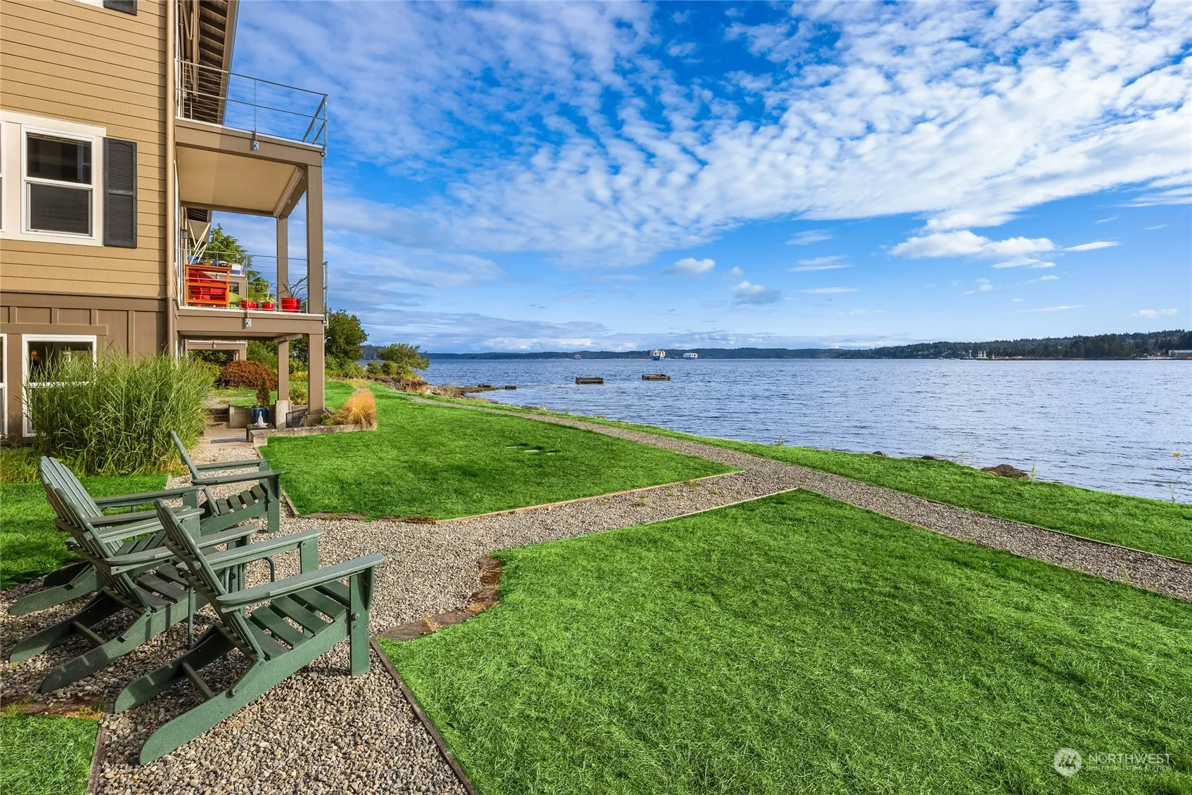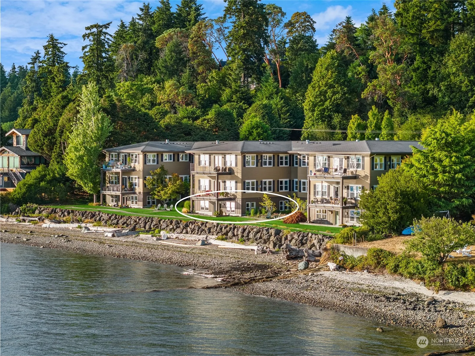 Elegant beachfront living in this southwest-facing condominium with gorgeous views of Puget Sound and the Olympic Mountains. Featuring 1,483 sq ft of living space with open living/dining/kitchen, cozy propane fireplace, den/office with beautiful built-ins, and waterside patio to bask in the sun and enjoy amazing sunsets! The kitchen offers generous peninsula seating, stainless appliances, hardwood floors, handsome cabinetry, ample storage, and walk-in pantry. Two water-view bedrooms, including primary suite with generous walk-in closet, soaking tub and double sinks. Private 1-car garage and heated main-floor storage. Close to wonderful south end amenities at Lynwood Center/Pleasant Beach Village and miles of trails at Fort Ward Park.