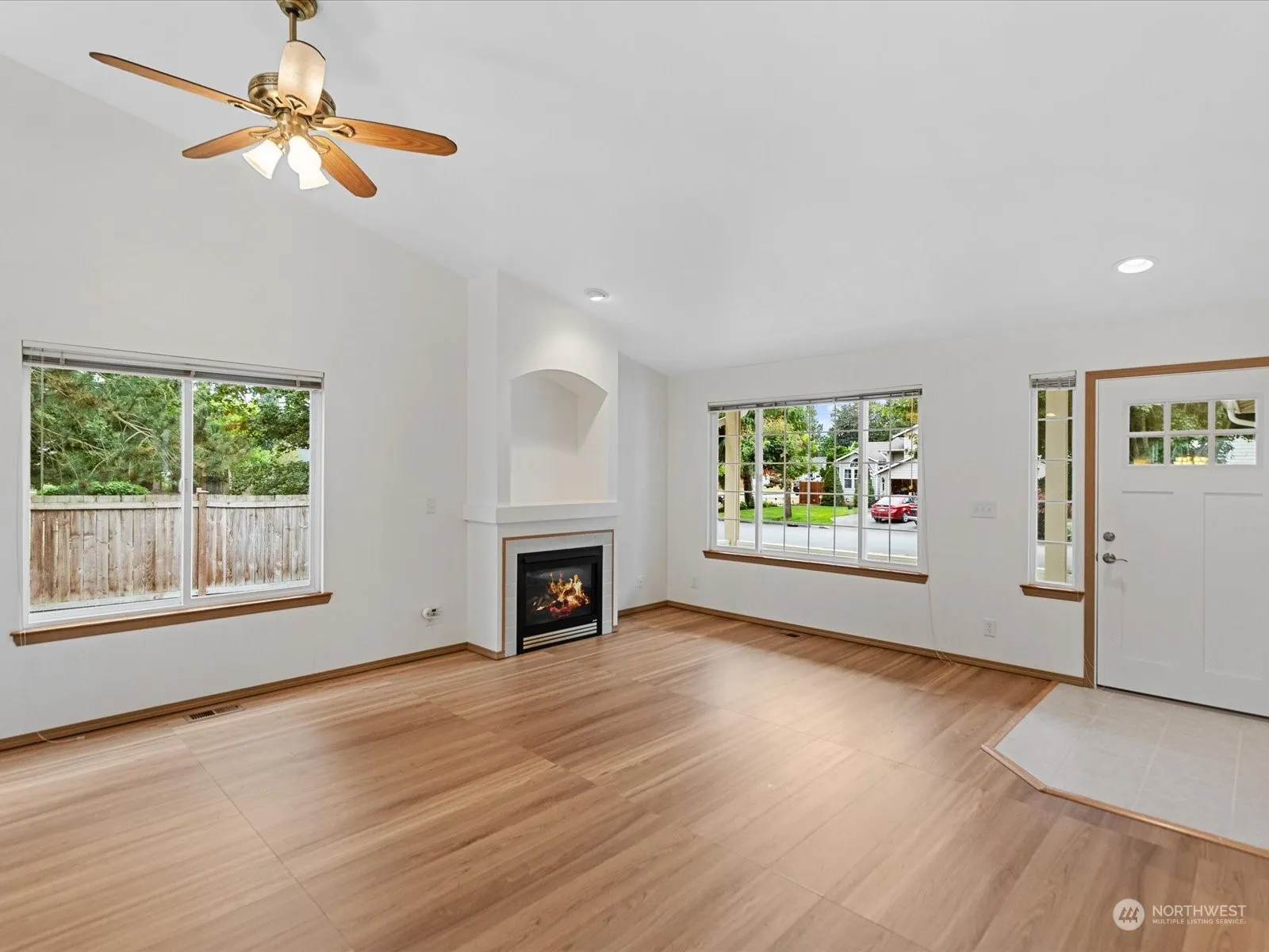 Delightful one story home w/ tasteful updates, smart layout, roomy lot next to park-like setting. A clean, neutral canvas ready for all your personal touches. Newly updated flooring includes luxury vinyl plank & vinyl. Fresh paint inside & out! Natural gas heat includes lovely fireplace in large living room with vaulted ceilings. Three bedrooms include a primary suite w/ full bath + WIC. Cheery open kitchen/dining w/ plenty of storage has delightful windows facing fenced back yard on two sides, incl slider for easy access. More quality updates include roof w/ warranty, furnace, garage door/opener, fridge, dishwasher, toilets & gas firpl. Near wildlife reserve, DT Arlington, I-5 & Hwy 9, Amazon facility, airport, golfing, shops & eateries!