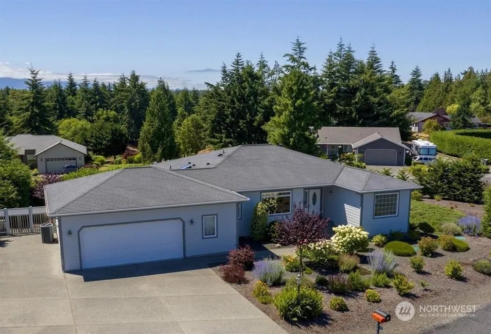 Immaculate spacious home in great neighborhood. Beautiful, low maintenance landscaping with peek-a-boo saltwater & Mt. Baker view to north,mountain views to south. Very private fenced backyard with south facing deck that has retractable canopy. Enjoy the propane fireplace on chilly nights. Lovely updated kitchen with stainless appliances, quartz countertops, loads of cabinets. Den/office off living room, roomy laundry off kitchen. Oversized garage. Near beaches, in an area of beautiful nature & wildlife.