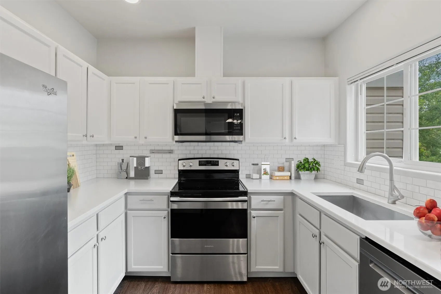 Tucked within a peaceful, well-kept community, this beautifully updated townhome offers generous living spaces with thoughtful design. The main level features soaring vaulted ceilings and expansive windows that fill the home with natural light, while a cozy gas fireplace anchors the open-concept living and dining areas. The updated kitchen blends stainless steel appliances, modern countertops, and abundant storage. Upstairs, the spacious primary suite serves as a relaxing retreat with a large closet and private en suite bath. Outside, find a fully fenced backyard with a covered paver patio-perfect for outdoor dining. Ideally located minutes from Downtown Edmonds, parks, shopping, dining, top-rated schools and a garage, don’t miss this home!