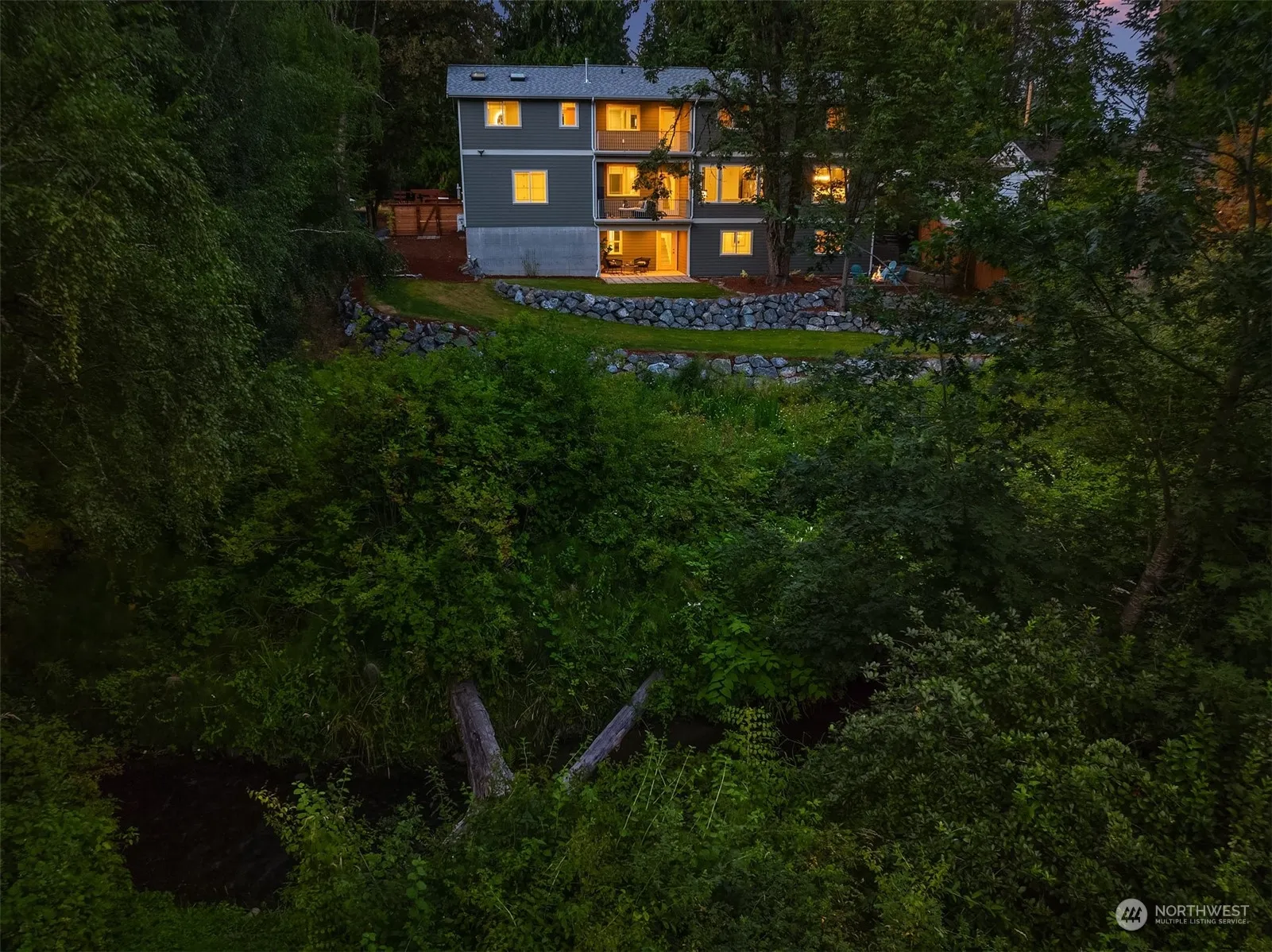 Where else can you have a NEW CONSTRUCTION home with NO sewer cap charges surrounded by acres of greenbelt and the wildlife sanctuary of McAleer Creek AND be within walking distance to great restaurants, shopping, parks, and Lake Washington on a huge lot just outside of Seattle? A rare find, with a private, fenced front yard to the left of the front door, and expansive, private and verdant back yard. SECOND KITCHEN and ADU-style guest quarters. TWO LAUNDRY ROOMS. Ample private parking for at least five cars. Wired for electric car charging in the garage. Lake Forest Park is the magical forest respite you’ve been looking for.
