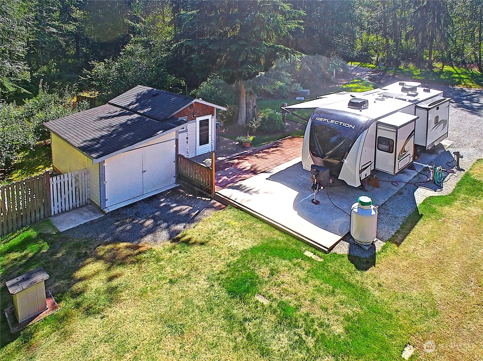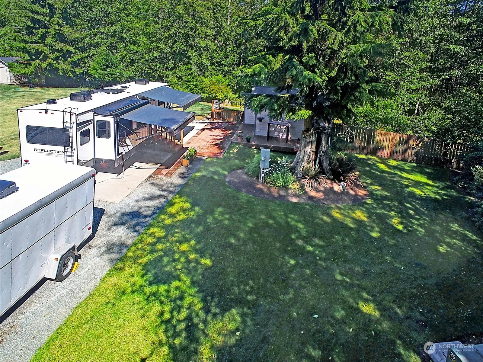 Gorgeous, sunny acreage on the north end, with all of the hard work done! This beautifully parked out parcel is just over 4 acres and has septic, water and power already installed! RV pad, well house with laundry & storage, large fenced garden & equipment garage make this property the perfect option to enjoy while you build! Property corners are marked and property lines are cleared. Quiet acreage on a paved, dead end road! Washer/Dryer, refrigerator, freezer, riding lawn mower, push mower & generator are included. RV is available separately.