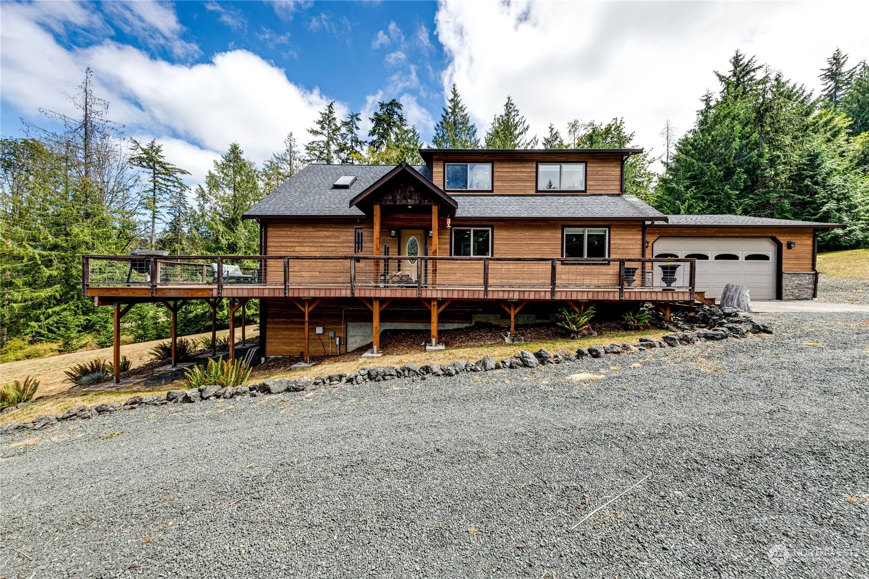 This 2816 sq ft, 3-bed, 2-bath home offers space and modern comforts. Featuring a spacious and well-equipped kitchen, a huge walk-out basement with added plumbing, a large laundry room and a jacuzzi tub in the primary bathroom. The property includes a 576 sq ft 2-car attached garage and a 768 sq ft heated/cooled detached garage/workshop perfect for a business, fitness room, etc. Features include dedicated high-speed internet, a 3-year-old heat pump, and dedicated HVAC in the master and detached workshop. Nestled in a serene pine and cedar forest, it’s just 8 mins to town, 10 mins to hiking trails, Olympic National Forest, shopping, dining and the beach. The low-maintenance yard ensures easy upkeep. No HOA! Don’t miss this rare find!