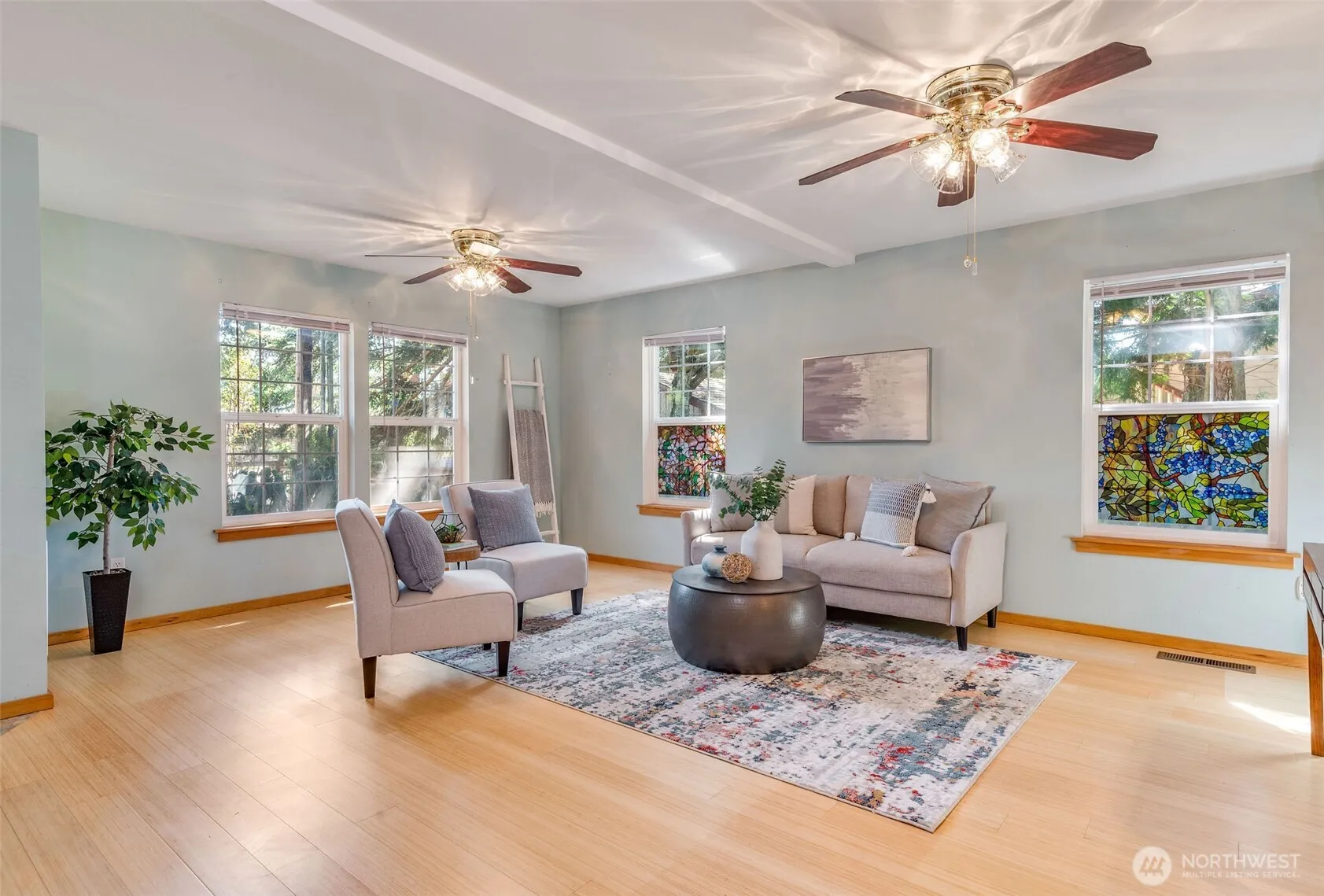 Magical setting in North Beach, just blocks to the waterfront, Fort Worden. This peaceful mini-sanctuary is set amongst big trees, 2 ponds and gardens. The house has 3 bedrooms and 3 baths with bamboo floors throughout. Stone floors in entry and kitchen, along with other unique touches. Kitchen is open to the dining room and to a large sunny living room. Accessible walk-in tub in the downstairs bathroom. Oversized double-car garage and a second garage that has been used as an art studio. Perfect for a workshop. The backyard offers privacy and has a soothing pond with flagstone paths. The double corner lot is adjacent to an unopened street for even more privacy and space for your RV or boat. Freshly cleaned roof & gutters. Simply magical!