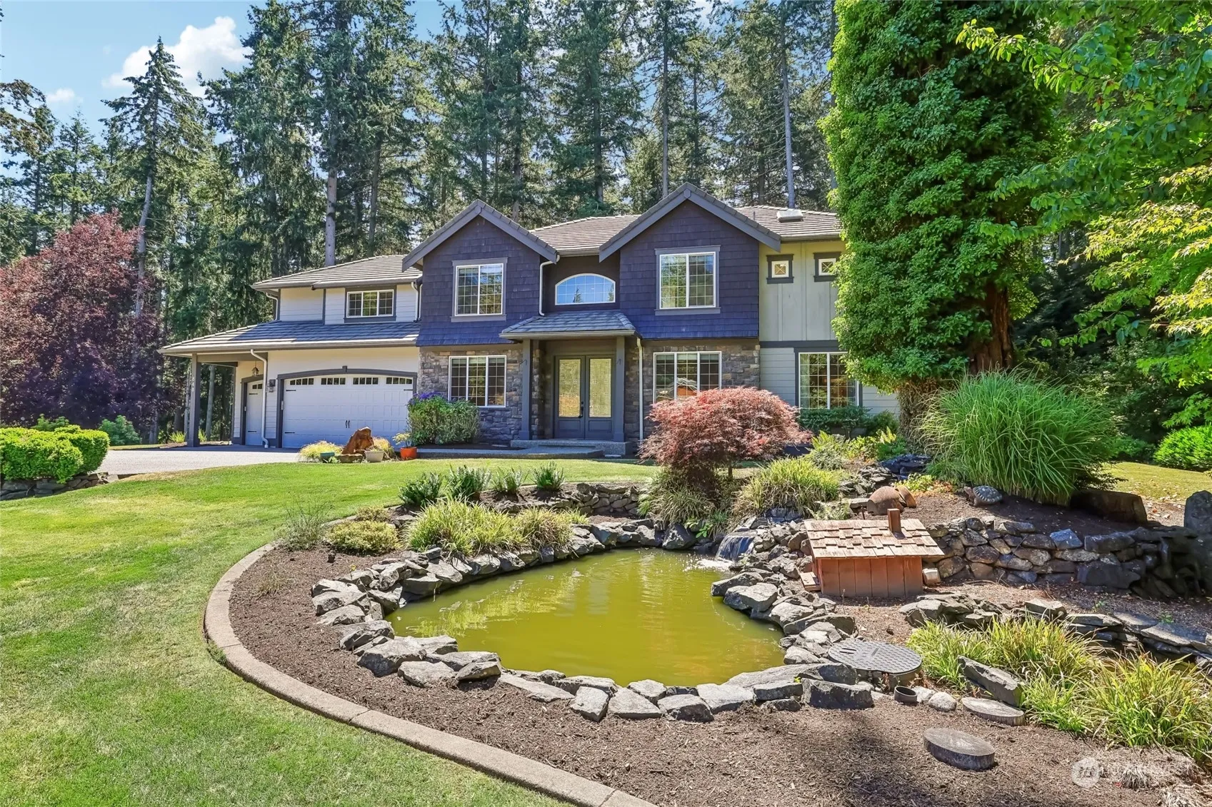 Coveted gated community on sought after Fox Island! From floor to ceiling- this home captivates you! Gorgeous marble & Pine flooring usher you into the double-height ceiling. Well thought out open concept connects entertainment, living & dining. Don’t miss built-ins, coffered ceilings & wainscoting in this beauty. Kitchen w/quartz counters, maple cabinets, & shiplap details! 2 gas fireplaces on main w/floor to ceiling rock fireplace. Coffered ceilings & wainscoting. Upstairs has 3 beds & fabulous bonus/media rm w/a wet bar for entertaining. Exquisite primary w/ spa-like 5-pc bath w/barn door & heated floors in bathroom. Gorgeous acre w/Koi pond, garden, generator, outbuilding & patio gazebo in a community of 9 impeccably maintained homes.