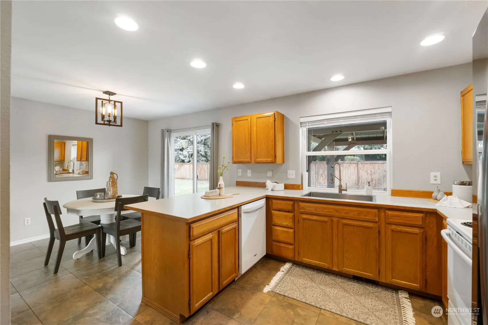 Mt. Rainier view Enumclaw Rambler in quiet cul-de-sac. 3 bedrooms, 1.75 full baths, and 2-car attached garage w/ concrete RV parking spot. Spacious kitchen w/ newer appliances, tile floor, peninsula bar seating & adjacent dining area. Living room w/ new gas fireplace in 2022. Newer forced-air gas furnace & heat pump provides efficient winter heat & comfy summer AC. LVP flooring throughout the living, primary & hall. Large fully fenced backyard w/ stamped concrete patio & cabana that stays. Walking distance to town & move-in ready.