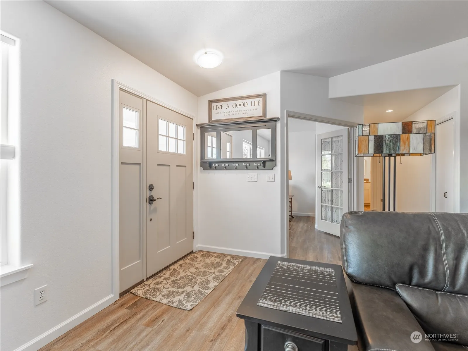 This stunning 3-bedroom, 2-bathroom rambler has been beautifully updated with new cabinetry throughout, luxury vinyl plank flooring, and brand-new interior and exterior doors. The primary bathroom boasts a cast iron shower pan and double sinks. Step through French doors from the primary bedroom into a fully enclosed screen porch, leading to an impeccably landscaped, irrigated, a gardener’s delight, with vibrant flowers and fully fenced backyard. Enjoy relaxation on the spacious screened-in back deck with ramp, perfect for coffee in the morning, entertaining or unwinding. The backyard features a 30-amp power-equipped shop shed, another powered shed, access for easy neighborhood walks. New furnace was installed in 2019. MOVE in Ready!